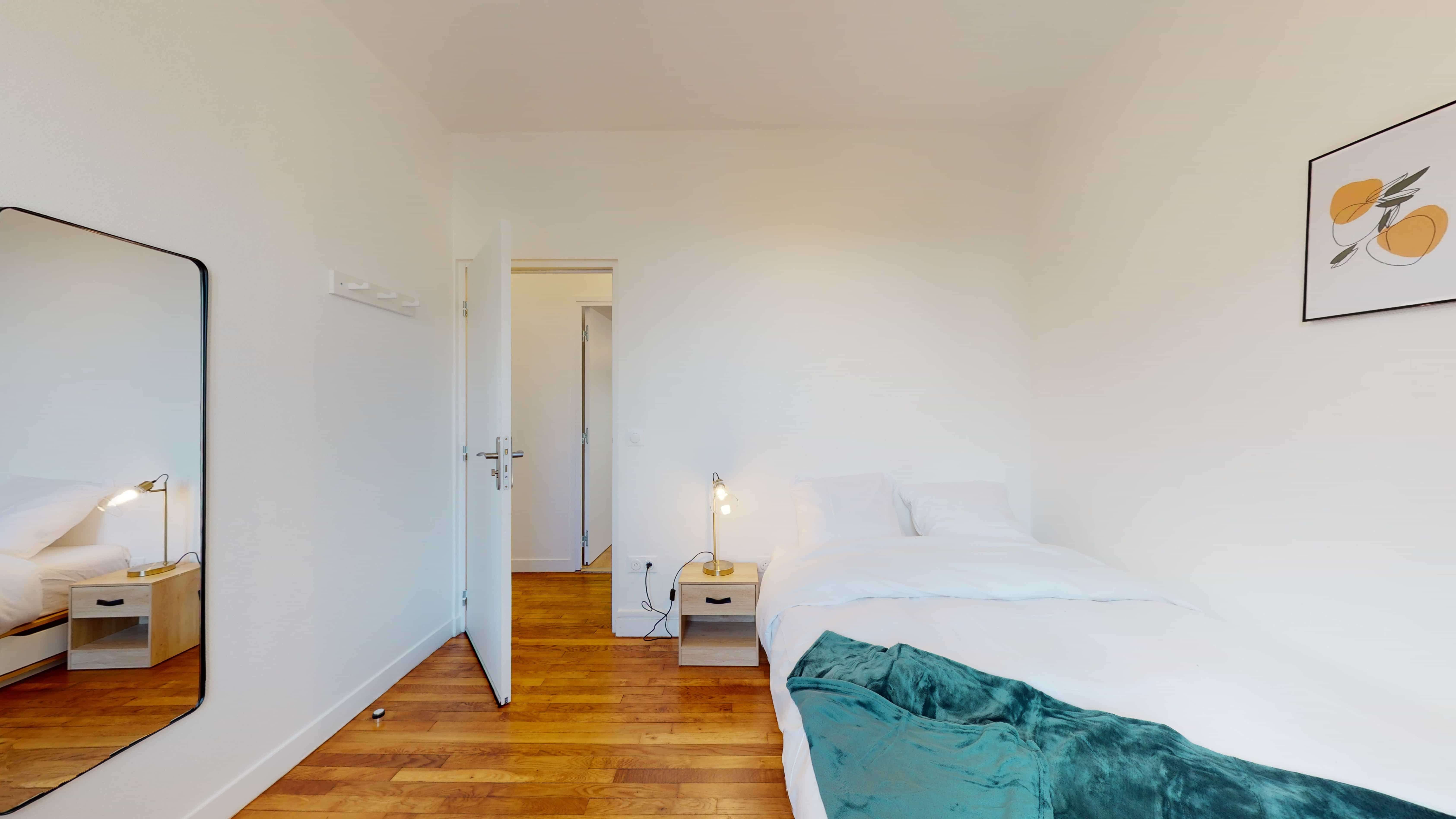 La chambre "Room for one person - 7" se trouve au premier étage et est idéale pour une personne. Elle est équipée d'un confortable lit double avec rangement intégré, d'une armoire pour vos vêtements, d'un bureau et d'une chaise pour travailler ou étudier, ainsi que d'une lampe de chevet. La salle de bain est partagée avec un autre locataire et comprend une douche, un lavabo et des toilettes.