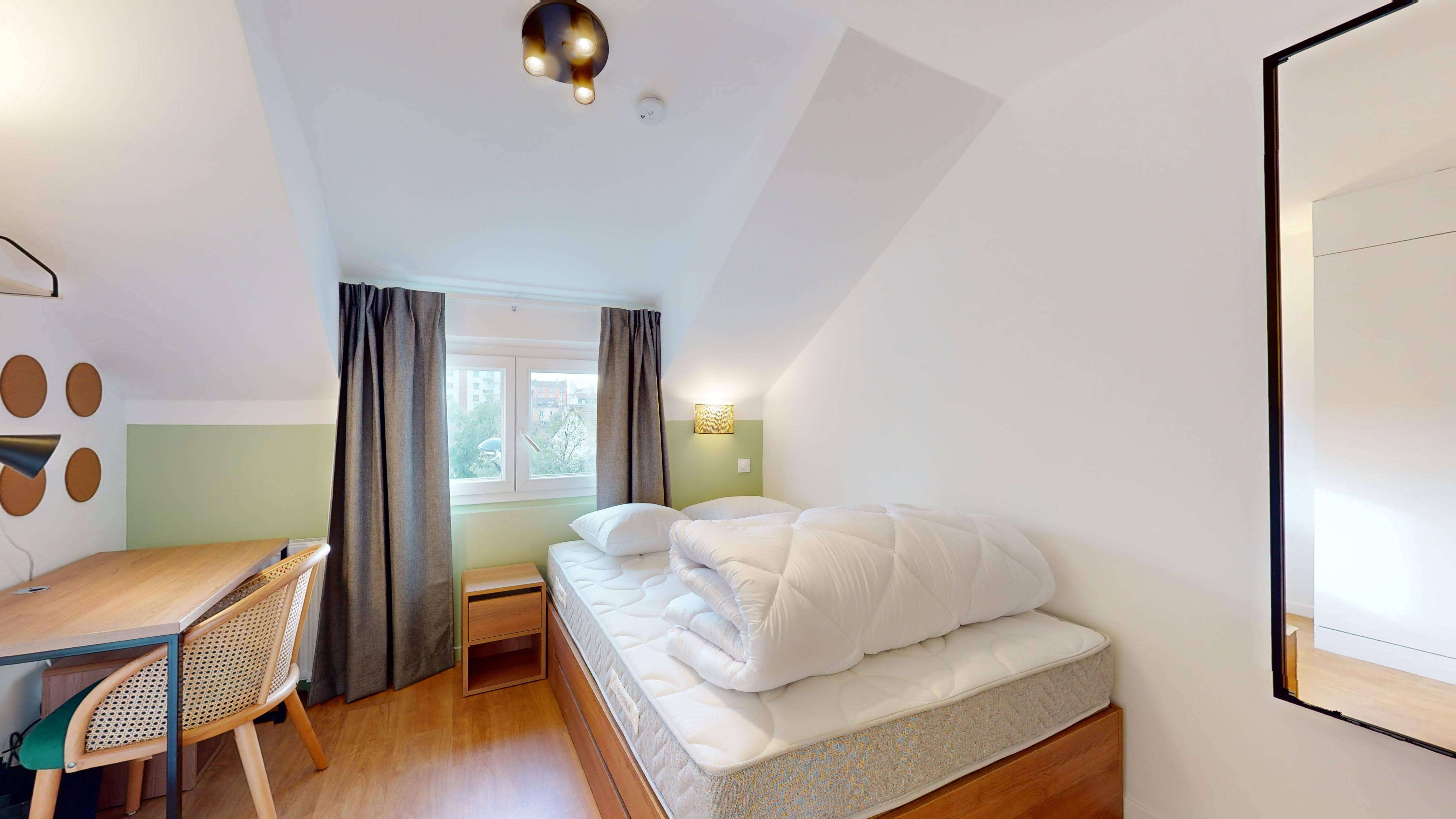 La chambre "Room for one person - 9", située au deuxième étage, est un véritable cocon personnel de 15m². Elle est équipée d'un lit double confortable avec rangement intégré, d'une armoire spacieuse pour vos affaires, d'un bureau et d'une chaise pour travailler ou étudier dans les meilleures conditions. La salle de bain privative comprend une douche moderne, un lavabo et des toilettes.