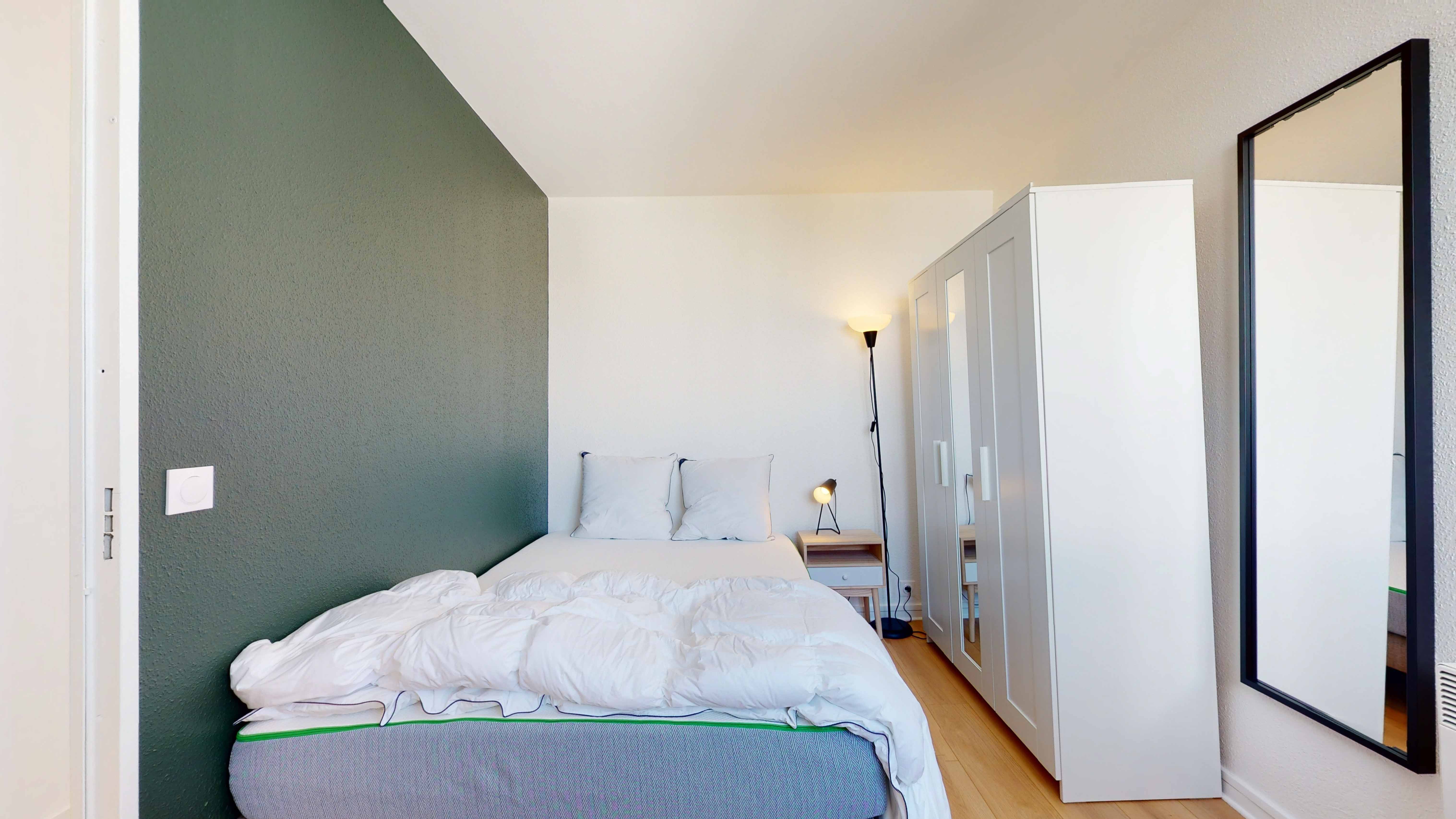 Room 1 est une chambre douillette de 9 m², pensée pour une personne. Elle est équipée d'un lit double confortable avec une literie de qualité, d'une armoire pour vos affaires, d'une chaise et d'un bureau pour travailler ou étudier. La chambre partage une salle de bain bien entretenue avec douche, lavabo et toilettes avec les autres colocataires.