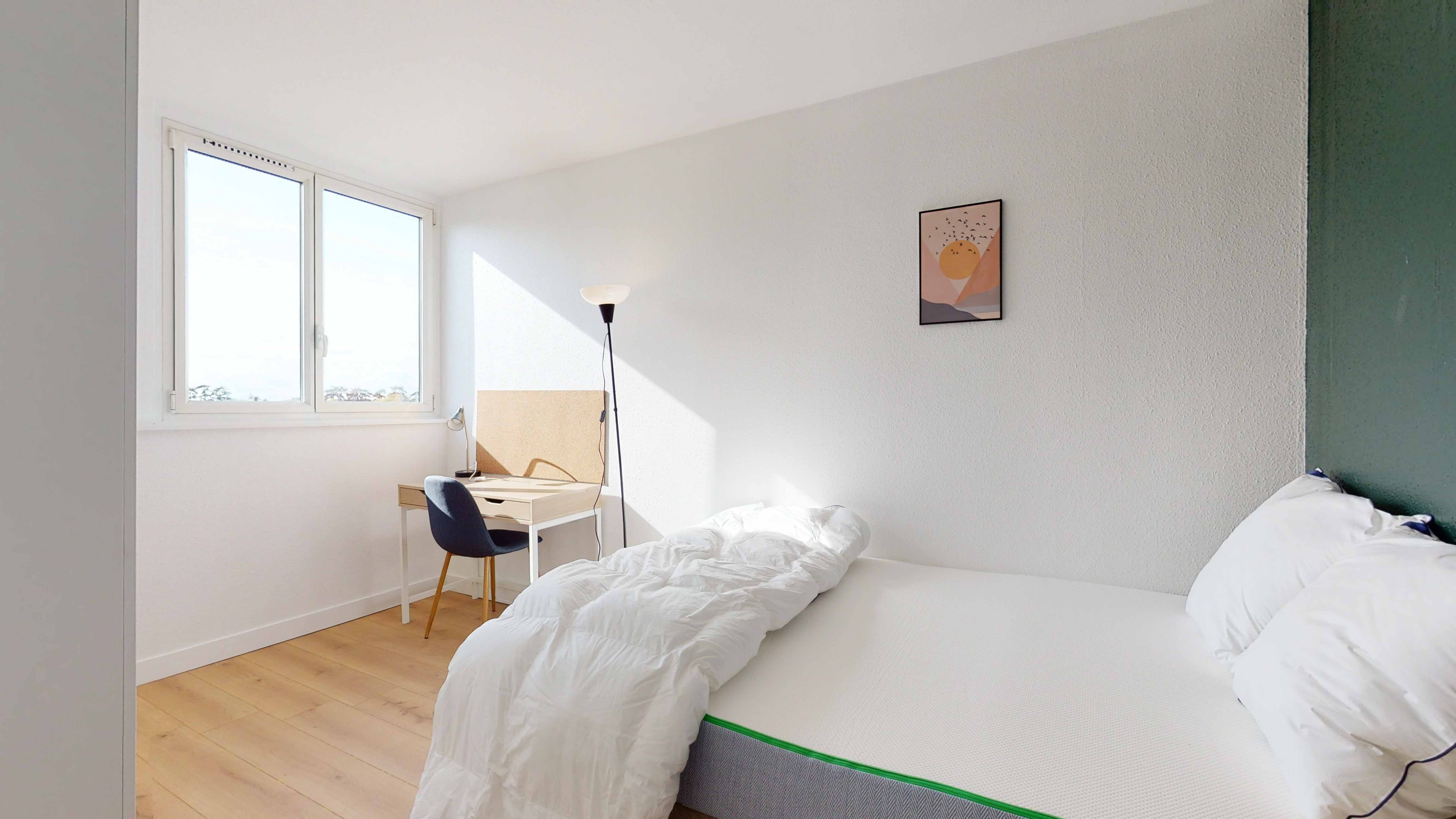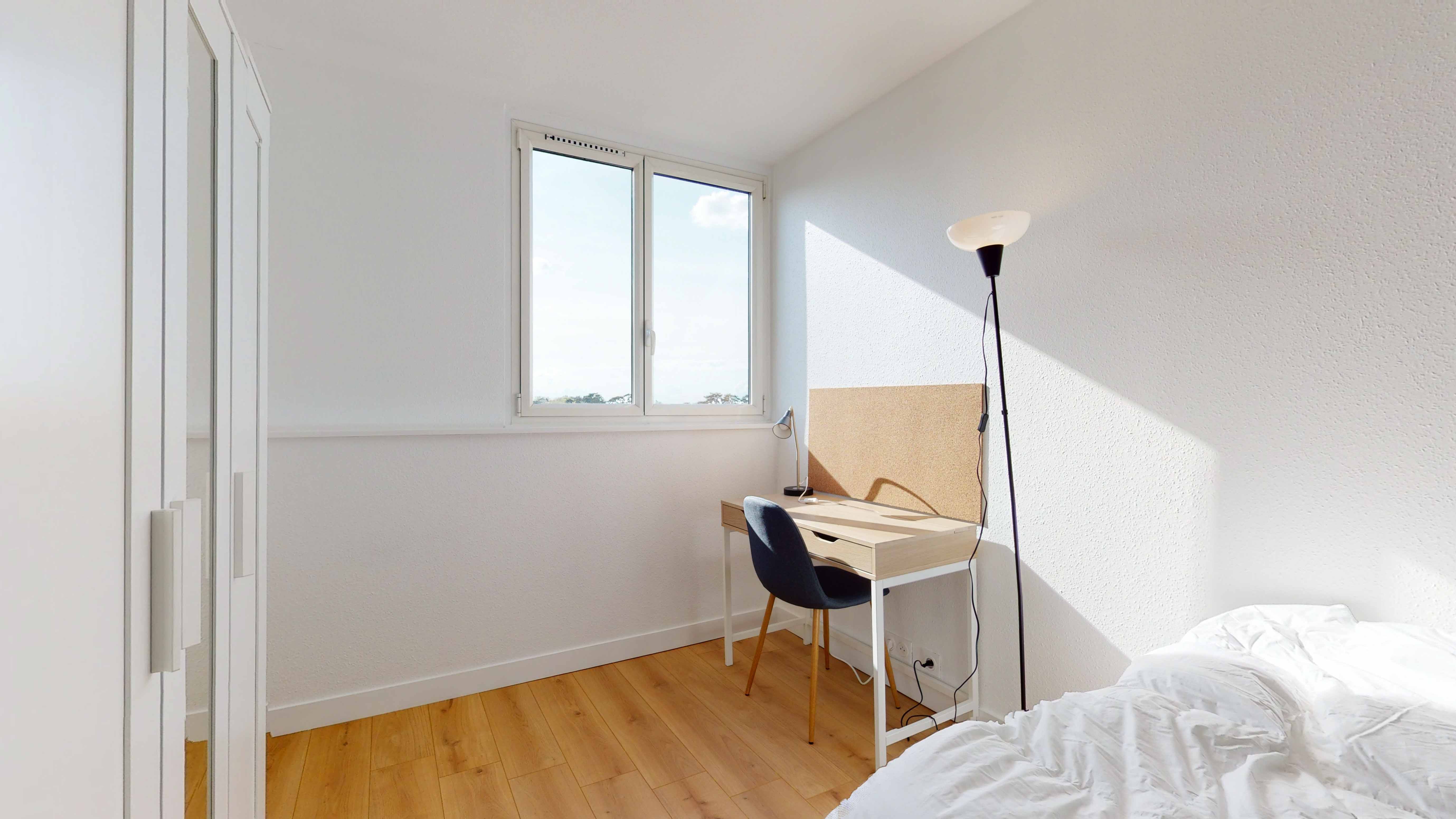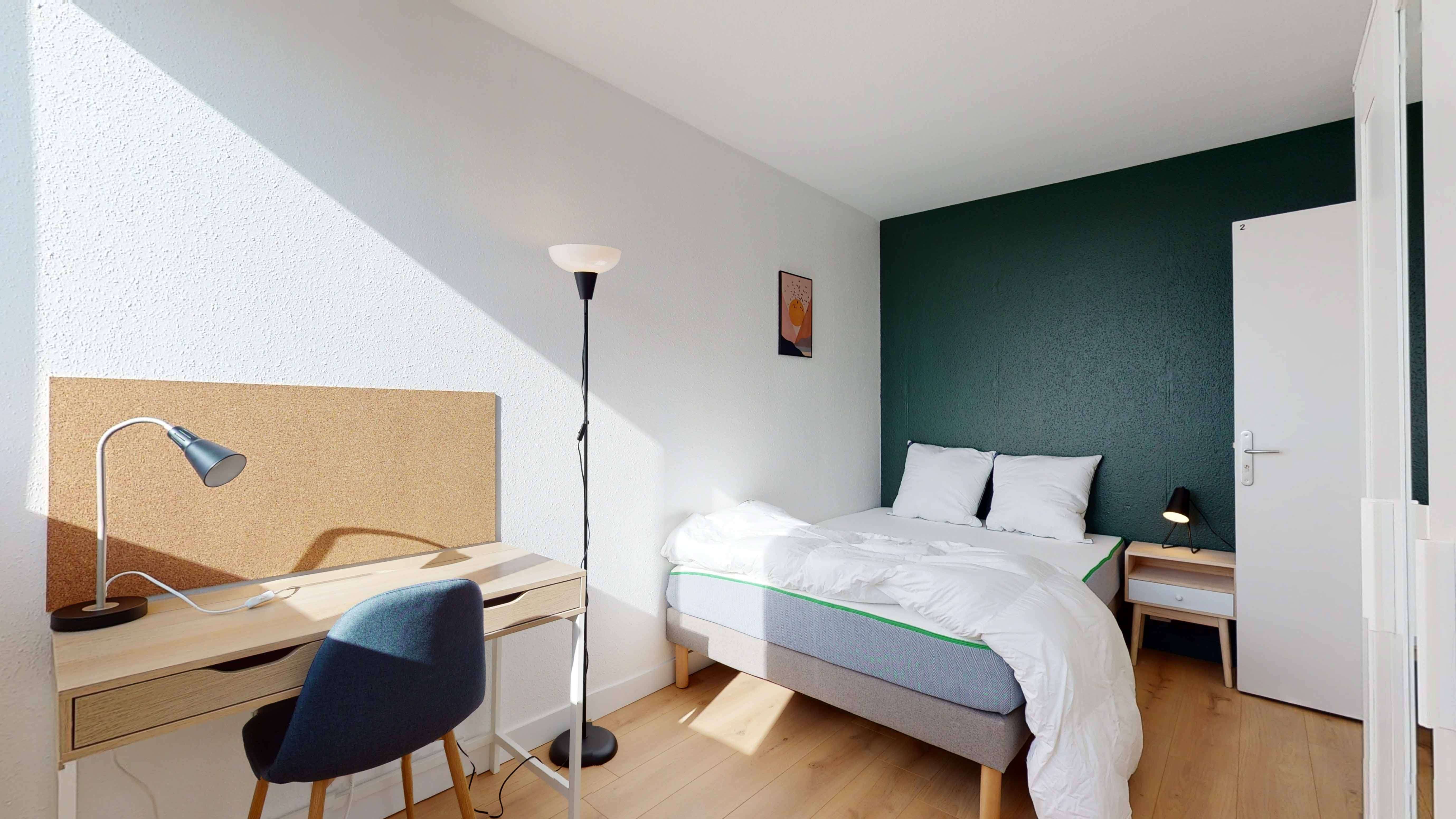 Room 2 est spécialement aménagée pour une personne, avec un lit double confortable, une armoire pour vos affaires, une chaise et un bureau pour travailler ou étudier en toute tranquillité. La chambre de 11 m² partage une salle de bain moderne avec quelques autres locataires, assurant intimité et confort.