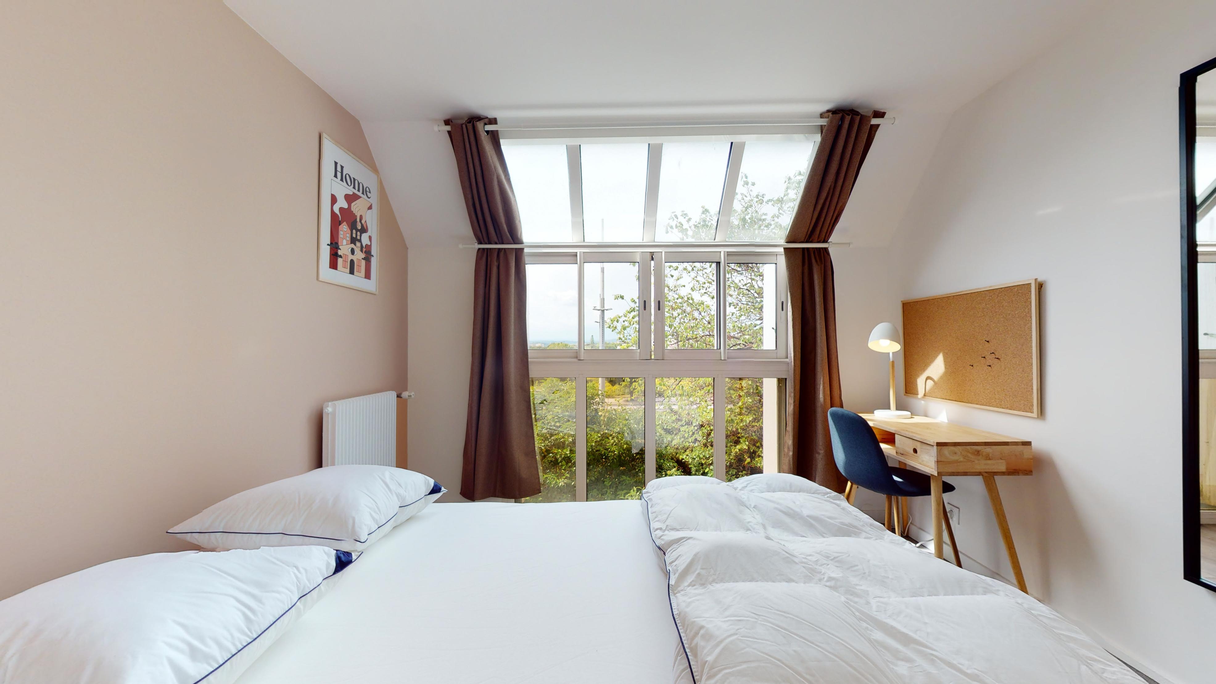 La chambre 5, conçue spécialement pour une personne, est un cocon douillet de 12 m². Elle est meublée d'un lit double avec une literie de qualité, d'une grande armoire pour ranger toutes vos affaires, et d'un espace bureau équipé d'une chaise confortable et d'une lampe de bureau pour vos études ou travail. Vous partagerez une salle de bain propre et lumineuse avec douche et toilettes avec les autres locataires.