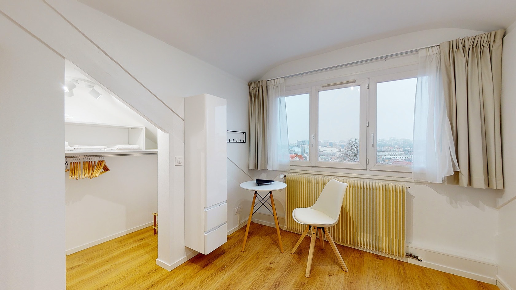 La Chambre 9, située au deuxième étage, est un cocon parfait pour une personne. Elle est meublée d'un confortable lit double avec une literie de qualité, d'une penderie pour vos vêtements, d'une table et d'une chaise pour travailler ou étudier. La chambre partage une salle de bain moderne avec douche et lavabo avec un autre locataire. Le chauffage par radiateur assure votre confort tout au long de l'année.