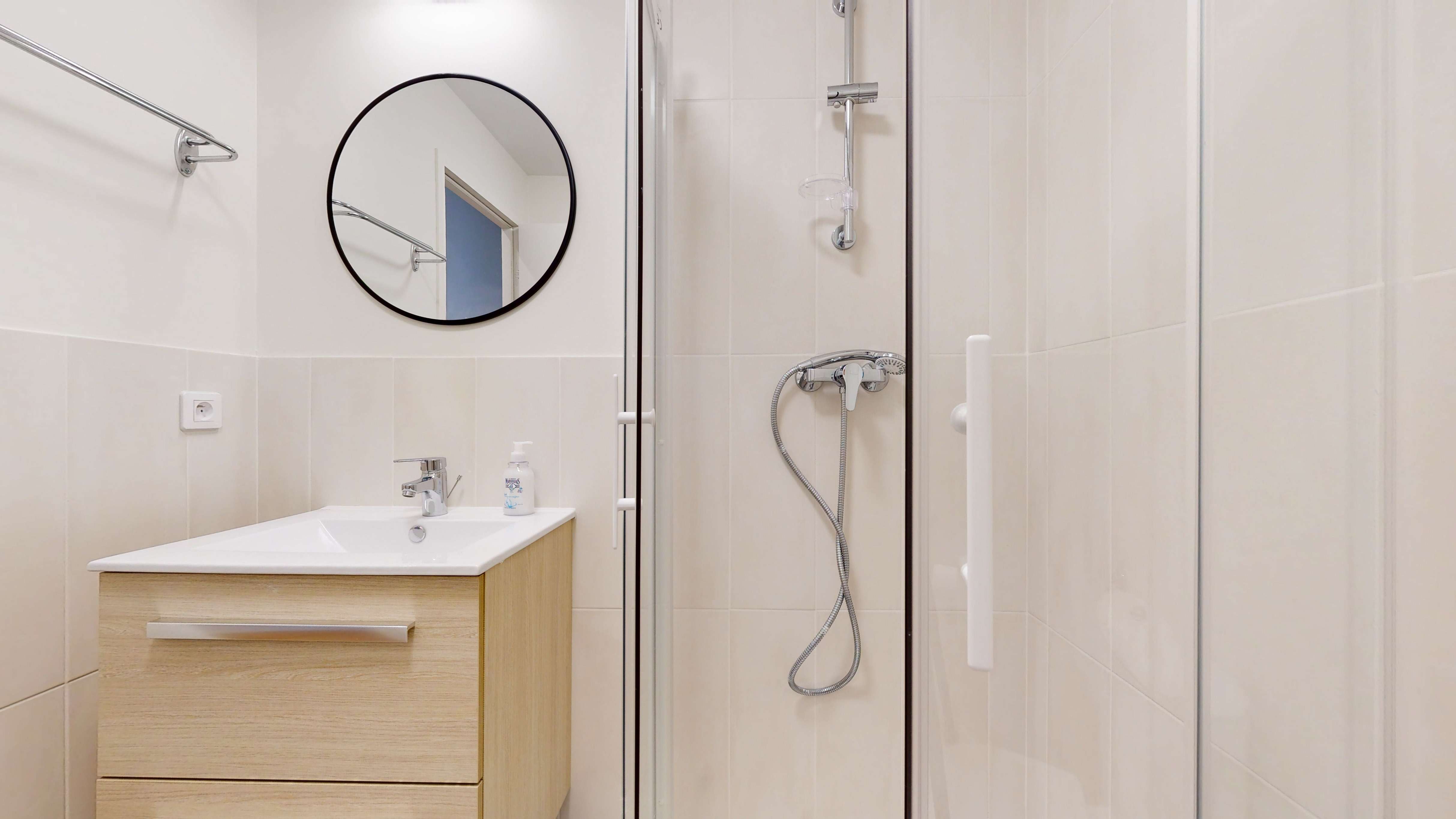 Votre future chambre, nommée "Room for one person - 1", est située au rez-de-chaussée et est parfaite pour une personne. Elle est équipée d'un lit double confortable, d'une armoire pour vos affaires, d'un bureau et d'une chaise pour travailler ou étudier. La salle de bain privée comprend une douche moderne pour vous rafraîchir en toute intimité.
