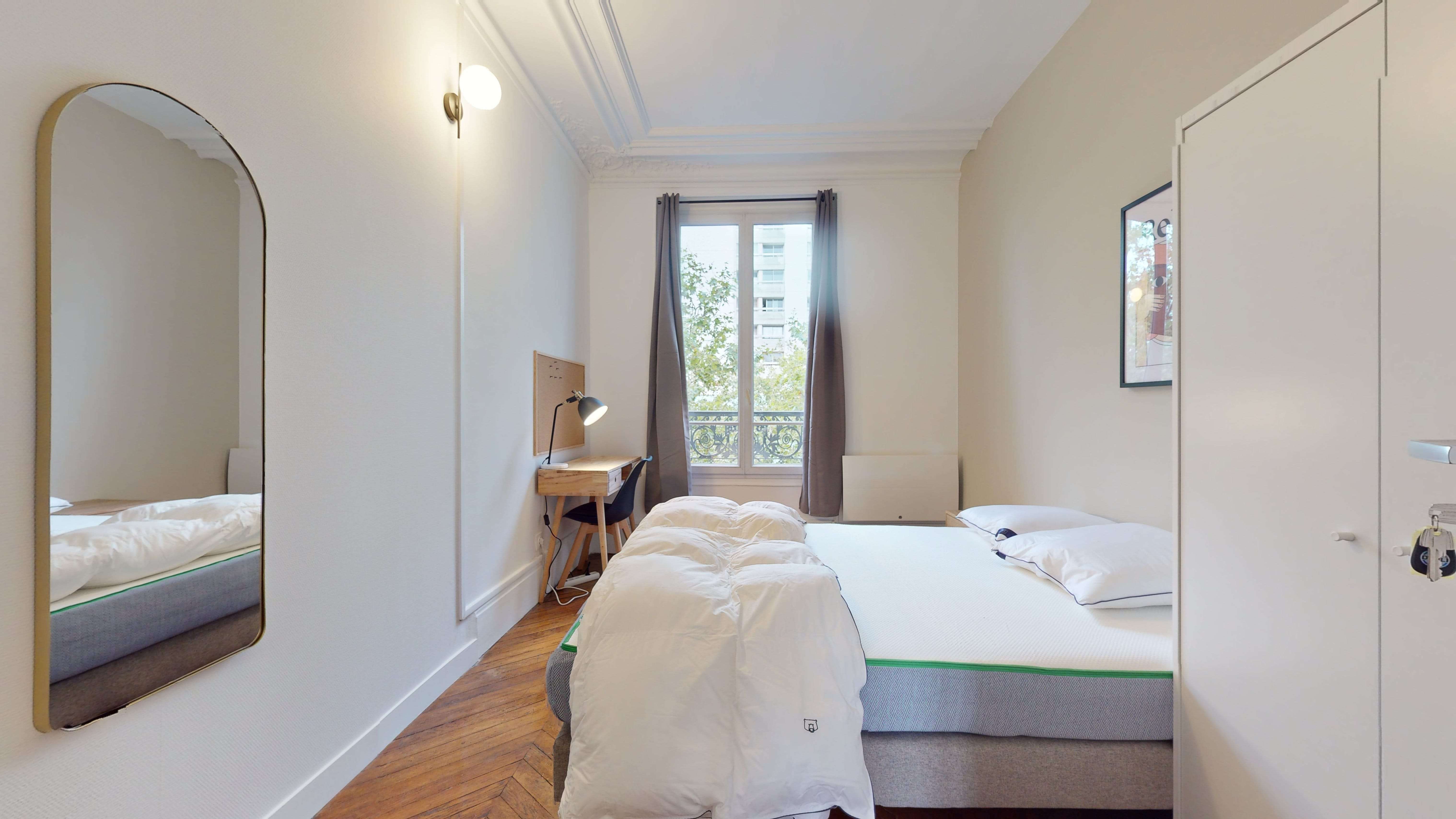 La "Room 6" est une chambre confortable pensée pour une personne. Elle offre un lit double douillet, une armoire spacieuse pour vos affaires, un bureau et une chaise pour travailler ou étudier en toute tranquillité. La chambre bénéficie d'une lumière naturelle apaisante et partage une salle de bain bien équipée avec quelques autres locataires.