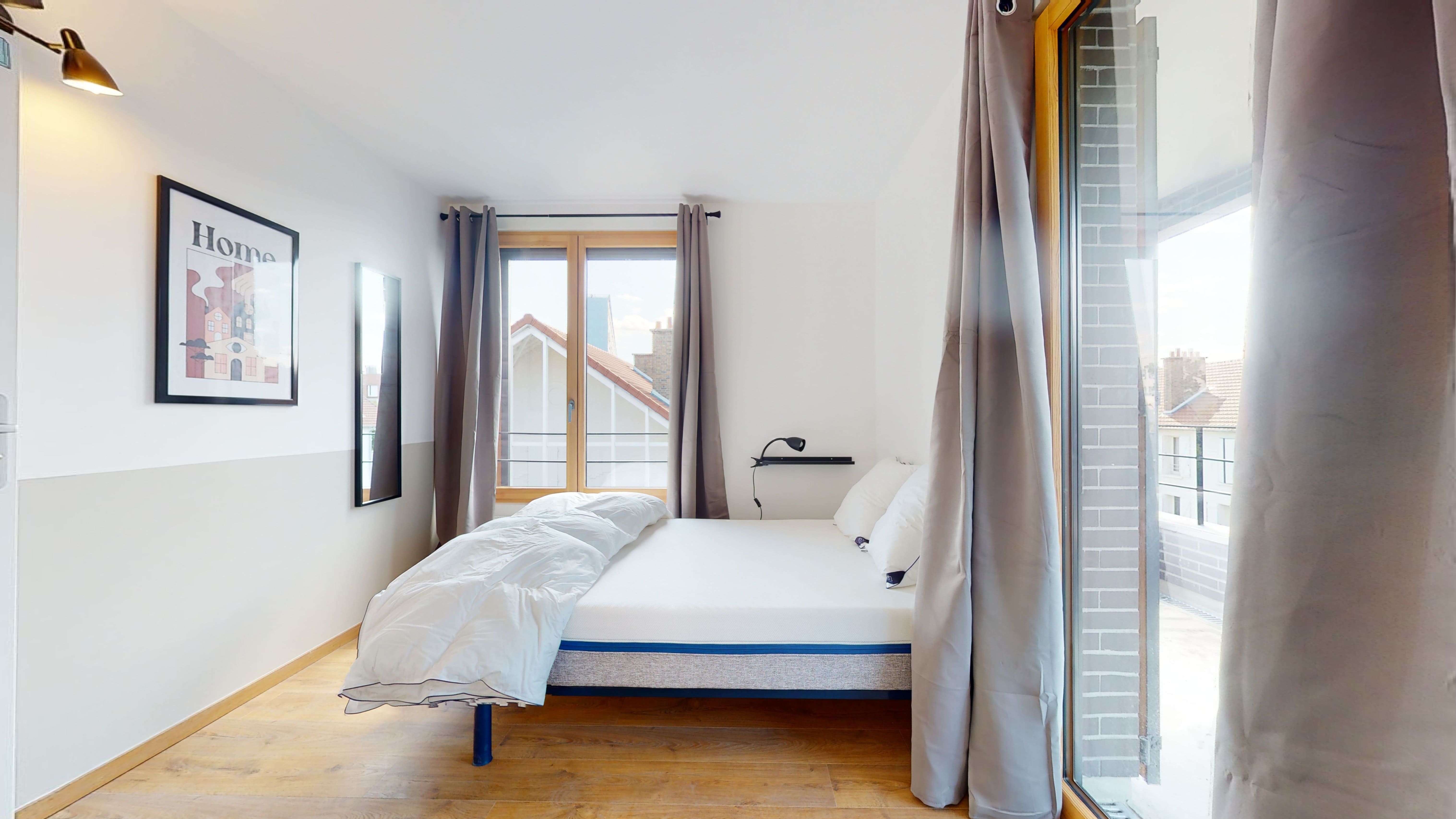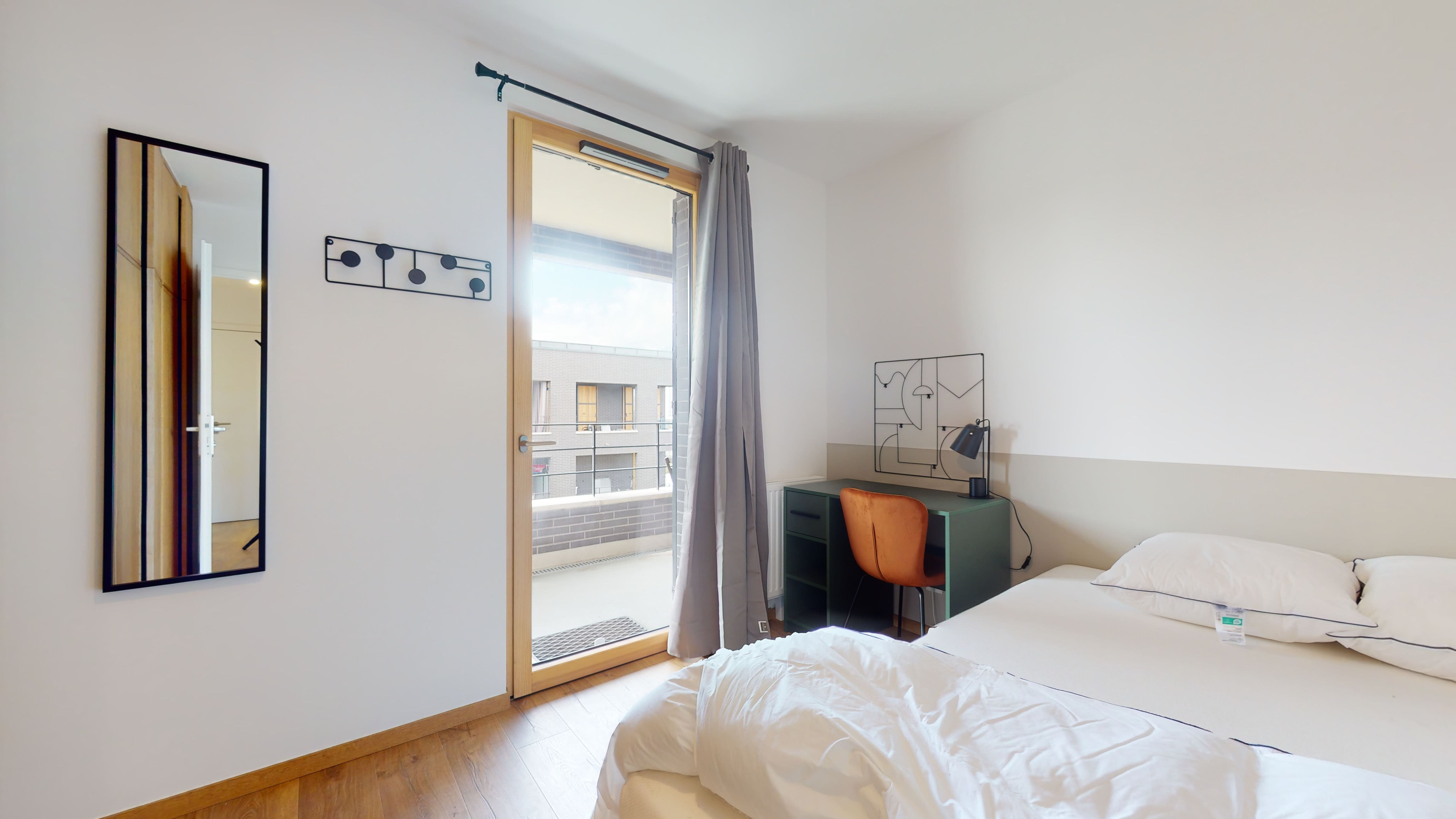 La chambre disponible, nommée "Room 2", est parfaite pour une personne. Elle est meublée d'un lit double avec literie de qualité, d'une grande armoire pour vos vêtements, d'un bureau et d'une chaise pour étudier ou travailler. La fenêtre est habillée de rideaux, et vous aurez accès à votre propre balcon. De plus, la chambre partage une salle de bain bien entretenue avec les autres colocataires.