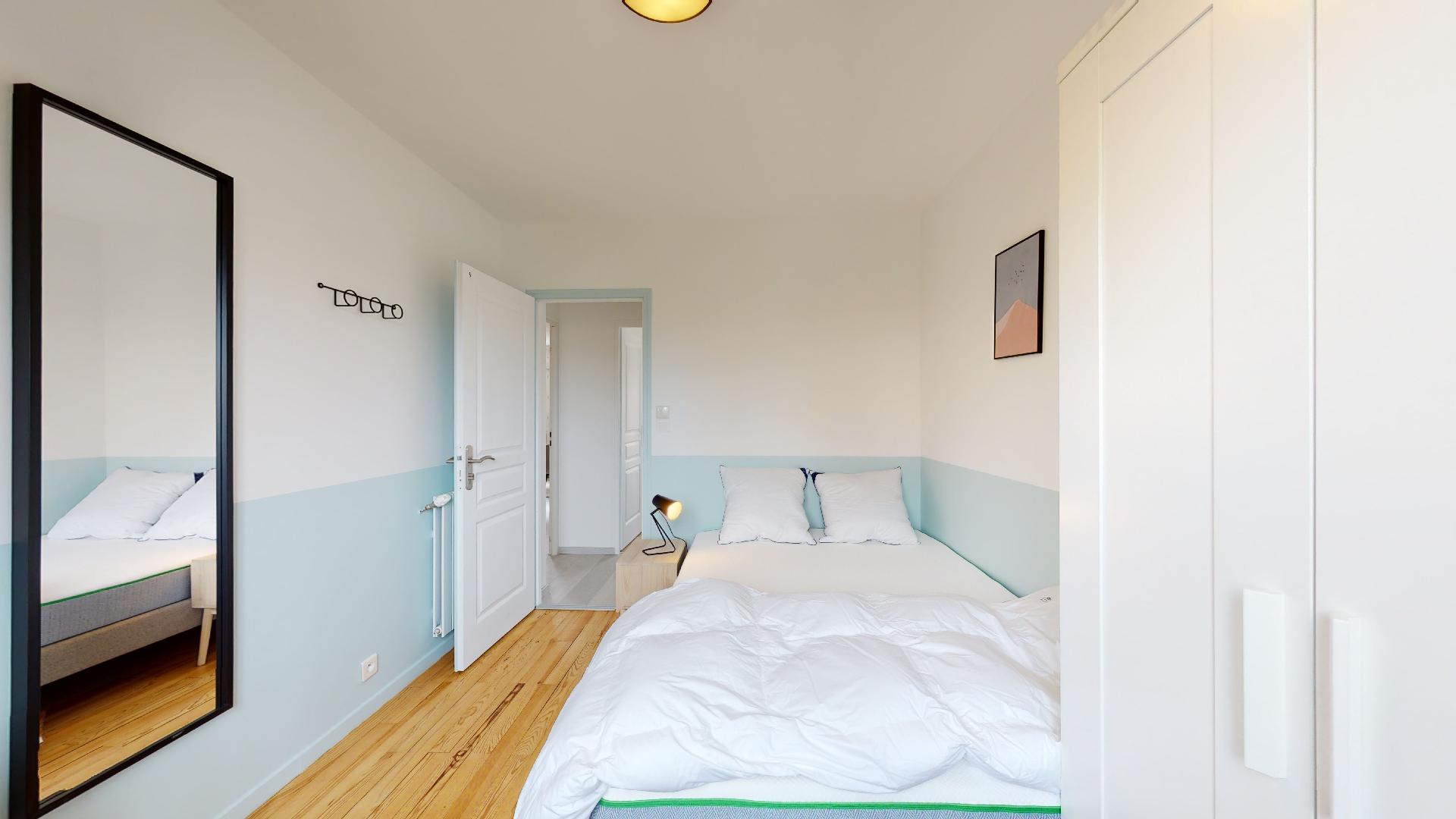 La chambre "Room 5" est un cocon personnel de 9 m² conçu pour votre confort et intimité. Équipée d'un lit double confortable avec une literie de qualité, une armoire pour vos affaires, un bureau et une chaise pour étudier ou travailler, ainsi qu'une lampe de chevet pour vos lectures nocturnes. La chambre partage une salle de bains moderne avec douche, lavabo et toilettes.