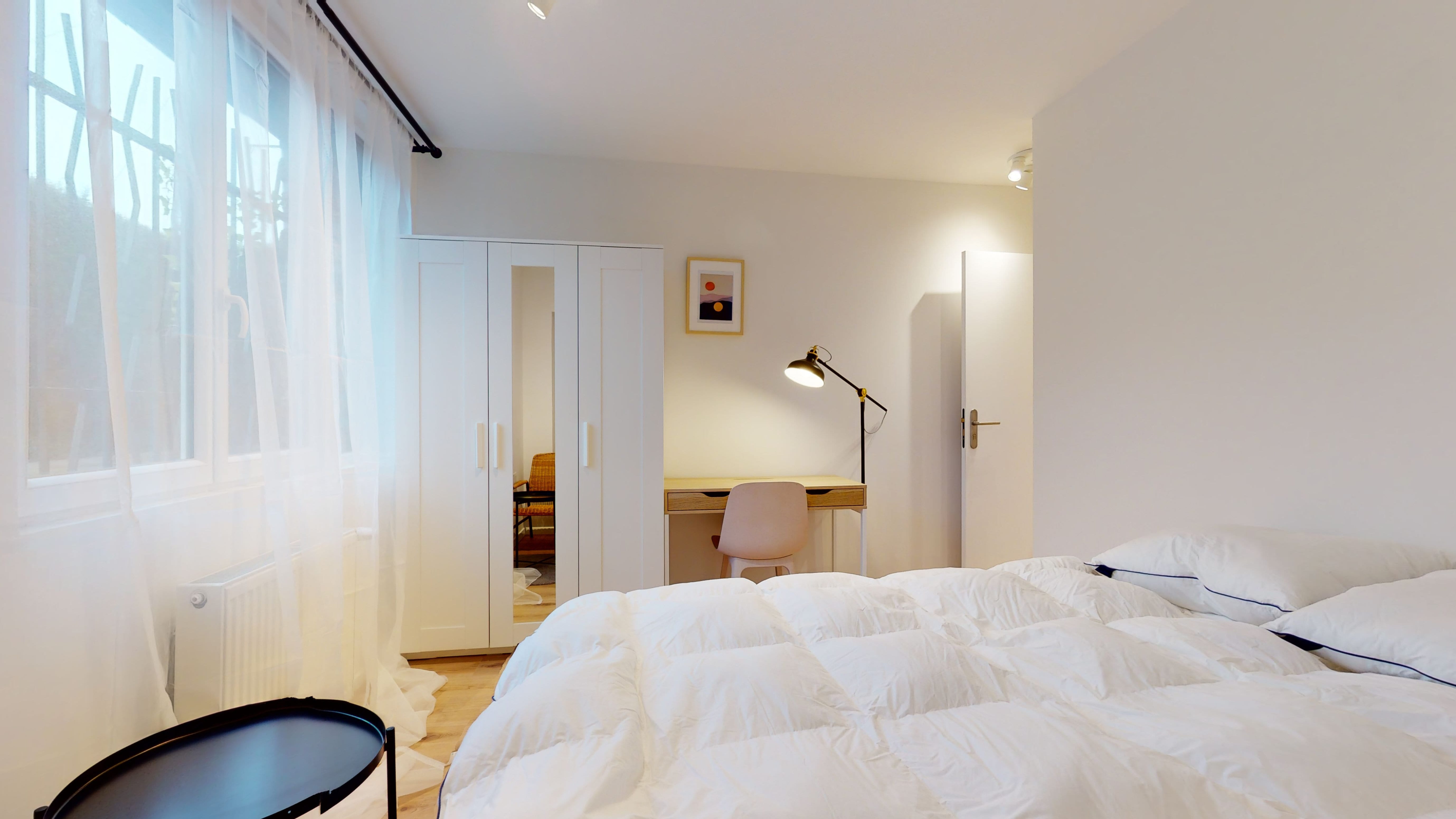Votre future chambre, la "Room for one person - 3", est un cocon de 13m² situé au premier étage. Elle est équipée d'un lit double avec rangements, d'une armoire spacieuse, d'un bureau et d'une chaise pour travailler ou étudier dans le calme. La salle de bain privative comprend une douche, un lavabo et des toilettes. Tout est prêt pour vous accueillir confortablement.