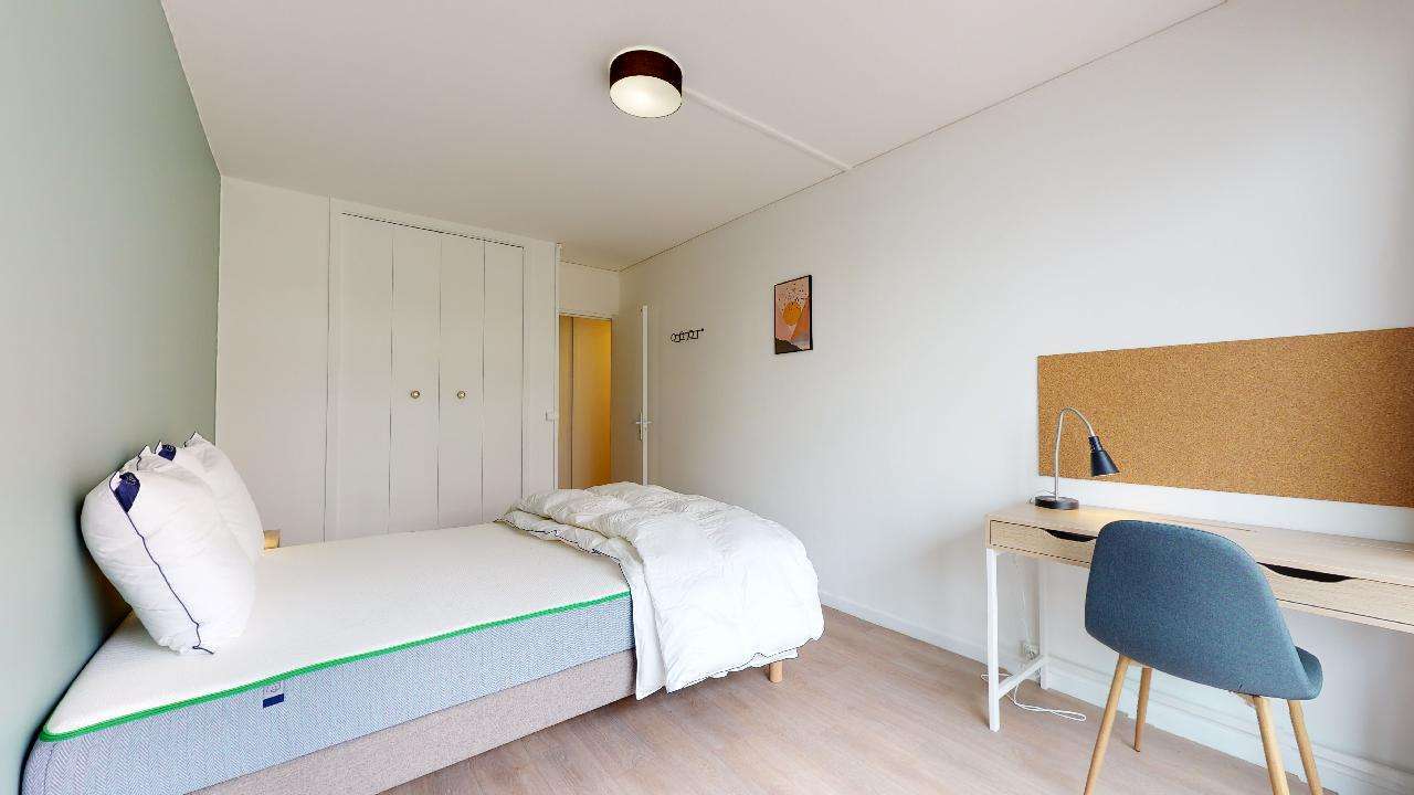 La chambre Room 4 est un cocon douillet de 13 m² juste pour vous. Elle dispose d'un lit double confortable, d'une armoire pour vos affaires, ainsi que d'une chaise et d'un bureau pour travailler ou étudier tranquillement. La chambre bénéficie même d'un accès à un balcon privé où vous pourrez vous détendre. Elle partage une salle de bain bien équipée avec ses voisins.