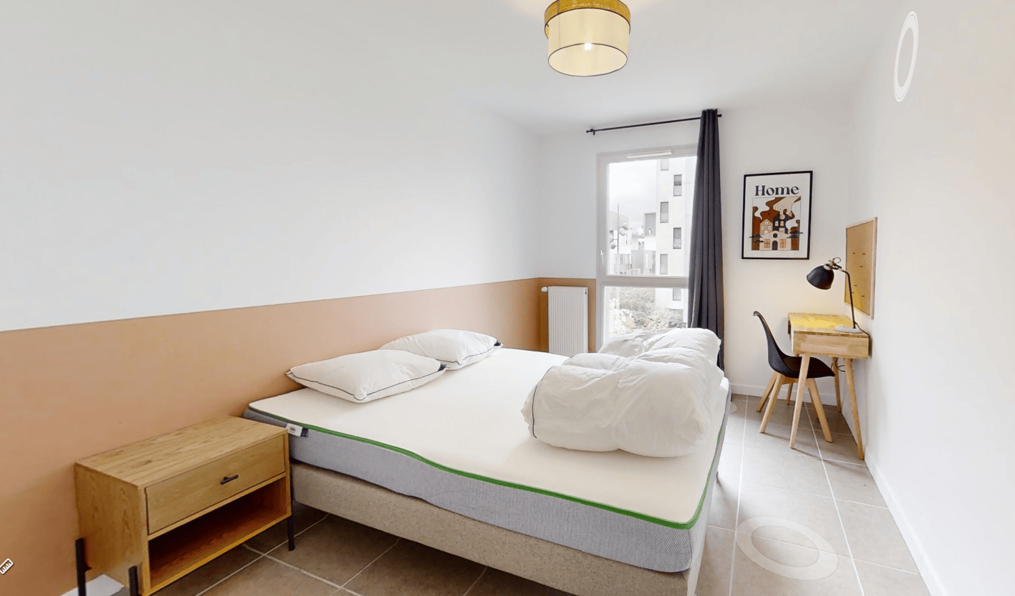 Room 1 est spécialement conçue pour une personne avec un lit double confortable, une armoire pour vos affaires, une chaise et un bureau pour vos moments de travail ou d'étude. Avec environ 13m² d'espace privé, la chambre est équipée de tout le nécessaire pour votre bien-être : une lampe de chevet, un radiateur, une connexion internet haut débit et même un porte-manteau pour organiser vos vêtements.