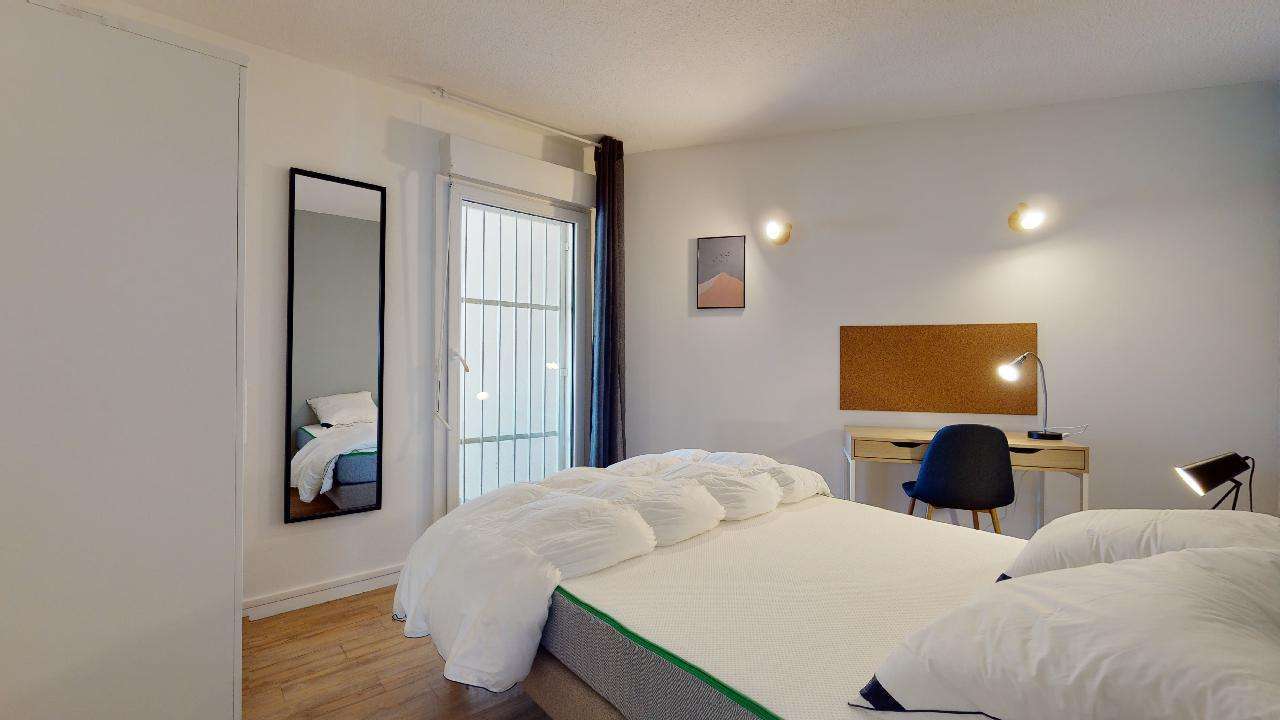 La chambre 3, conçue pour une personne, offre un espace douillet avec son lit double et sa literie de qualité. Vous y trouverez aussi une armoire pour vos affaires, un bureau avec une lampe pour travailler et une chaise confortable. Partagez une salle de bain avec douche, lavabo et toilettes, et profitez d'une porte-fenêtre donnant sur le balcon.