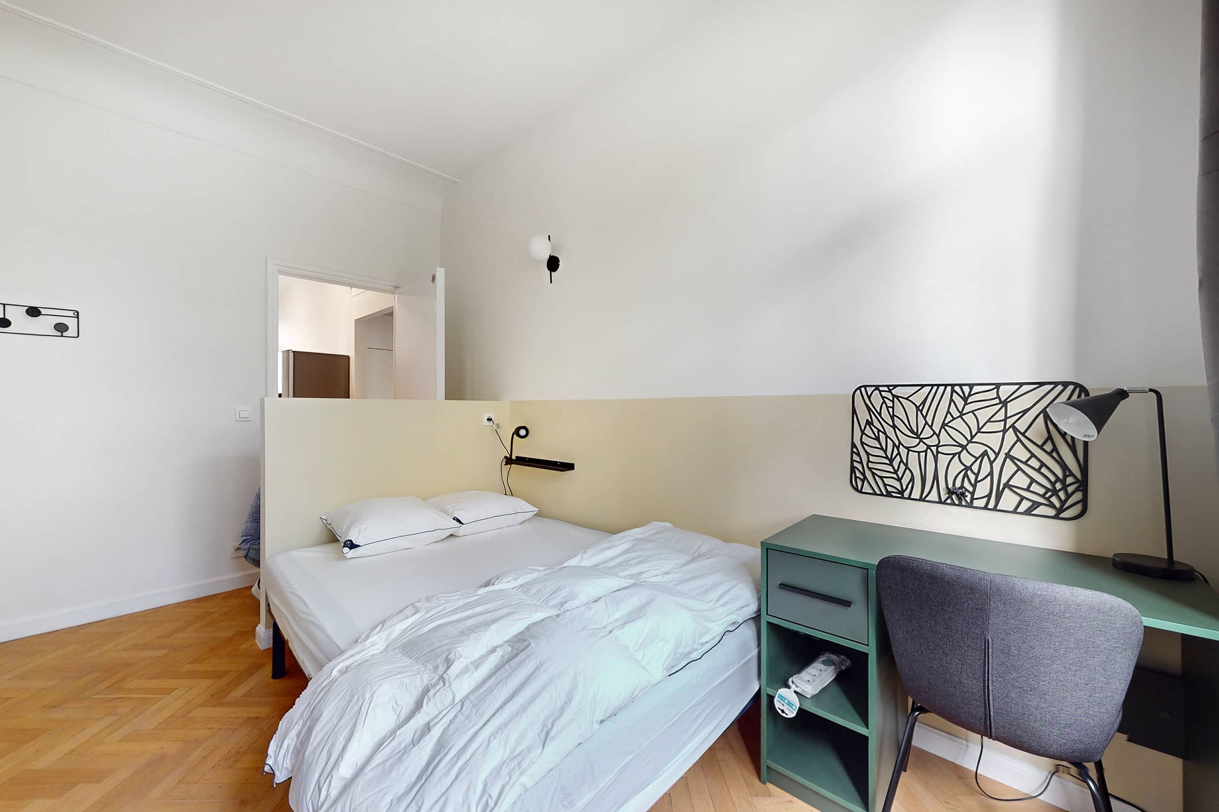 Room 1 is designed for solo occupancy, providing a comfortable double bed, ample storage with a wardrobe, and a workspace with a desk and chair. This private space extends to a balcony and shares a well-maintained bathroom with other tenants. High-speed internet and quality bedding ensure a restful night's sleep.