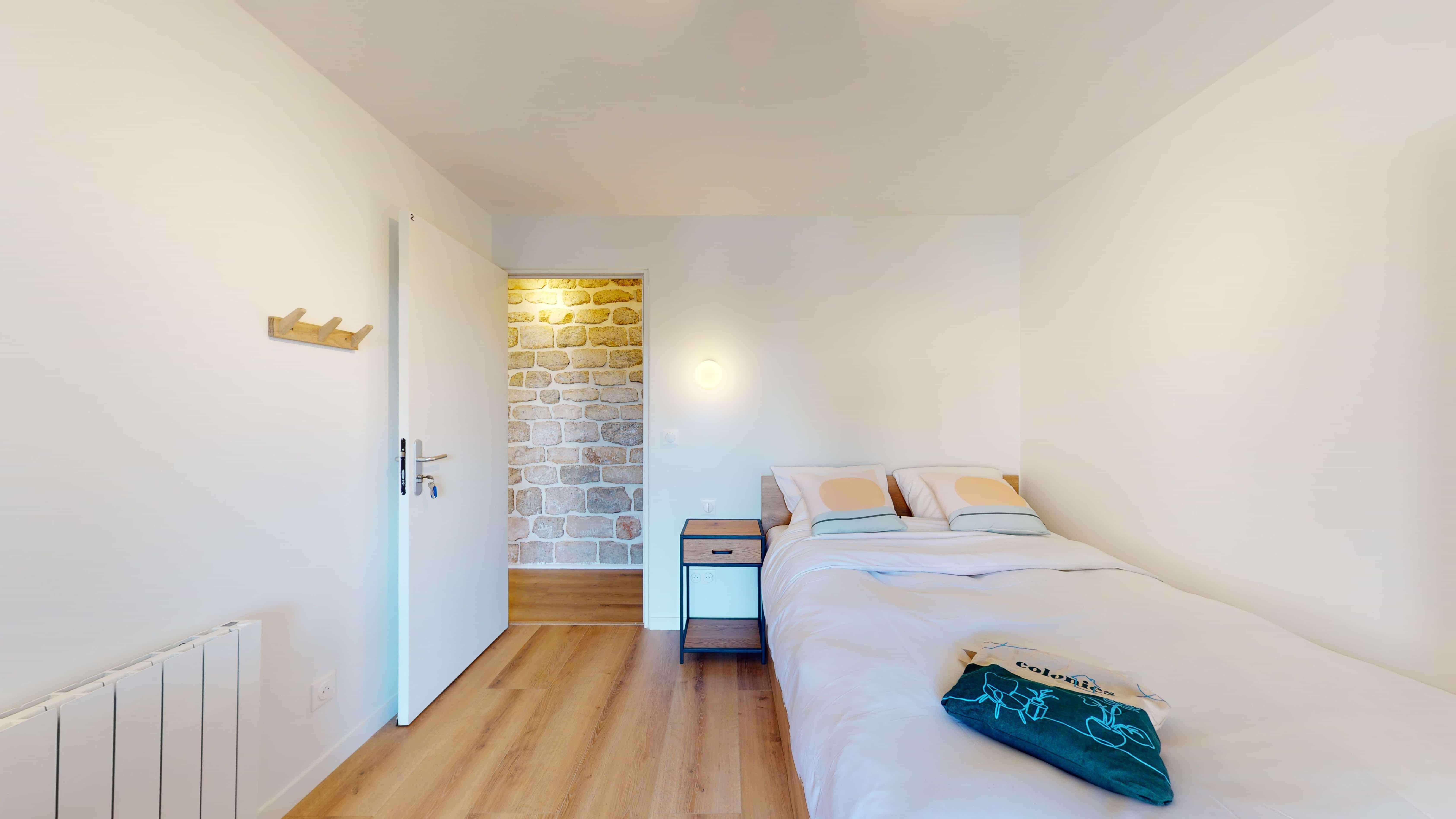 La chambre "Room for one person - 2" est un cocon douillet de 10m² situé au rez-de-jardin. Elle est parfaite pour une personne avec son lit double confortable, une armoire pour vos affaires, un bureau et une chaise pour travailler ou étudier. La chambre partage une salle de bain avec une autre personne et bénéficie d'un accès direct à la terrasse extérieure.
