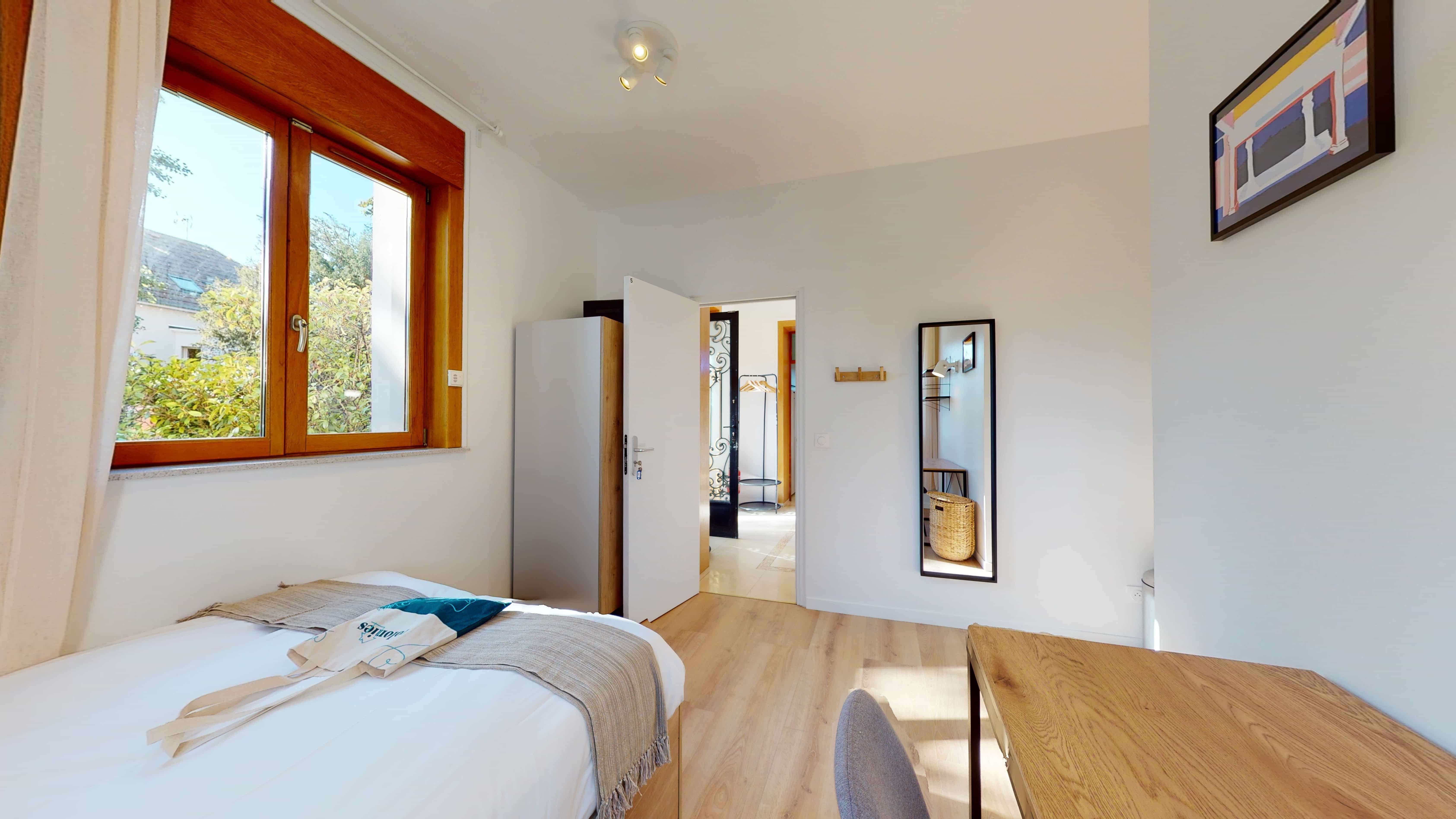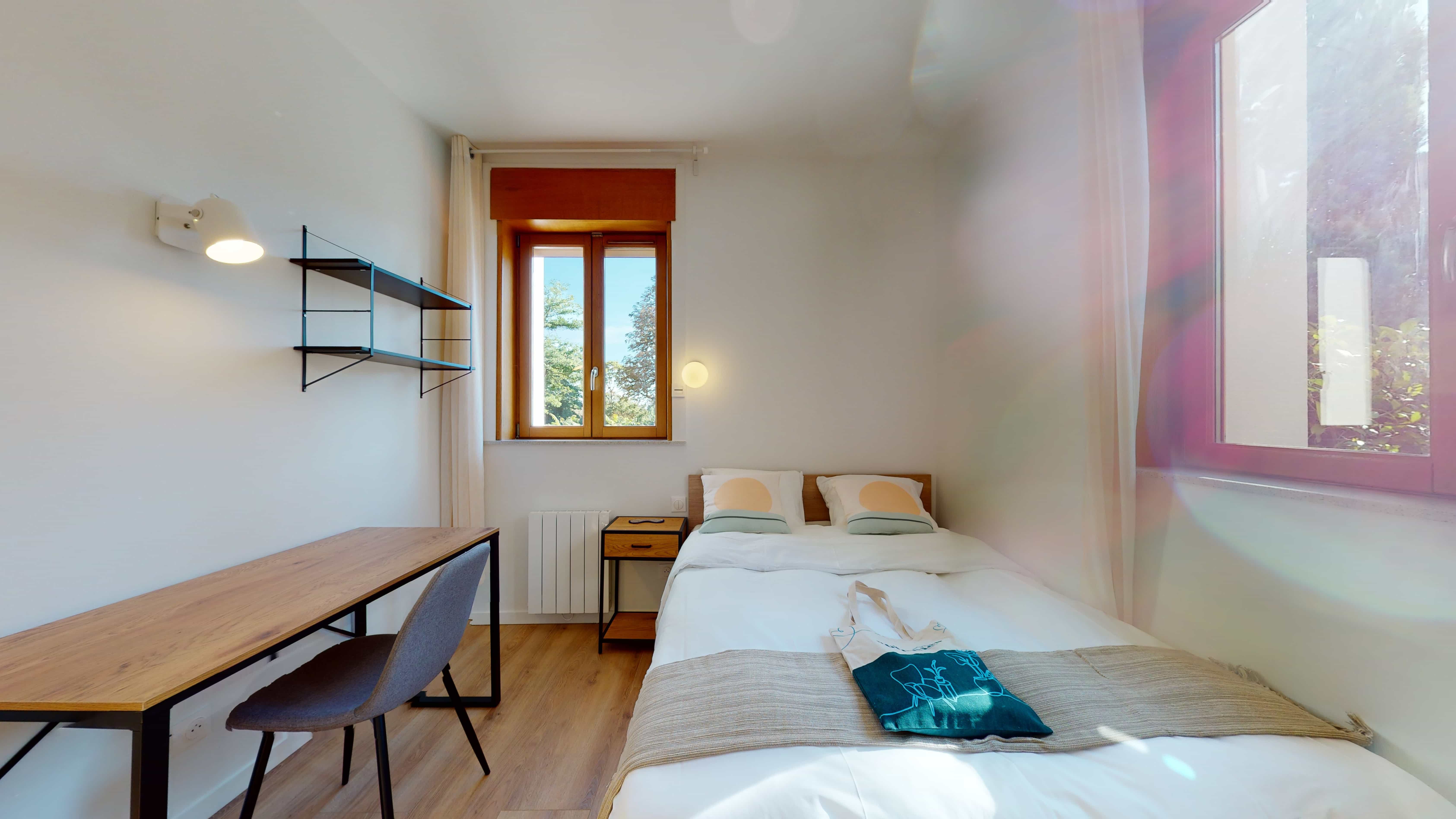 Le studio "Studio for one person - 5" est un petit cocon de 16m² situé au rez-de-chaussée, parfait pour une personne. Il dispose de sa propre salle de bain et kitchenette équipée pour votre indépendance. Le mobilier comprend un lit confortable avec rangement intégré, un bureau avec sa chaise et lampe pour travailler, ainsi qu'une penderie pour vos vêtements. La chambre est également équipée d'un radiateur pour rester au chaud et de linge de maison de qualité.
