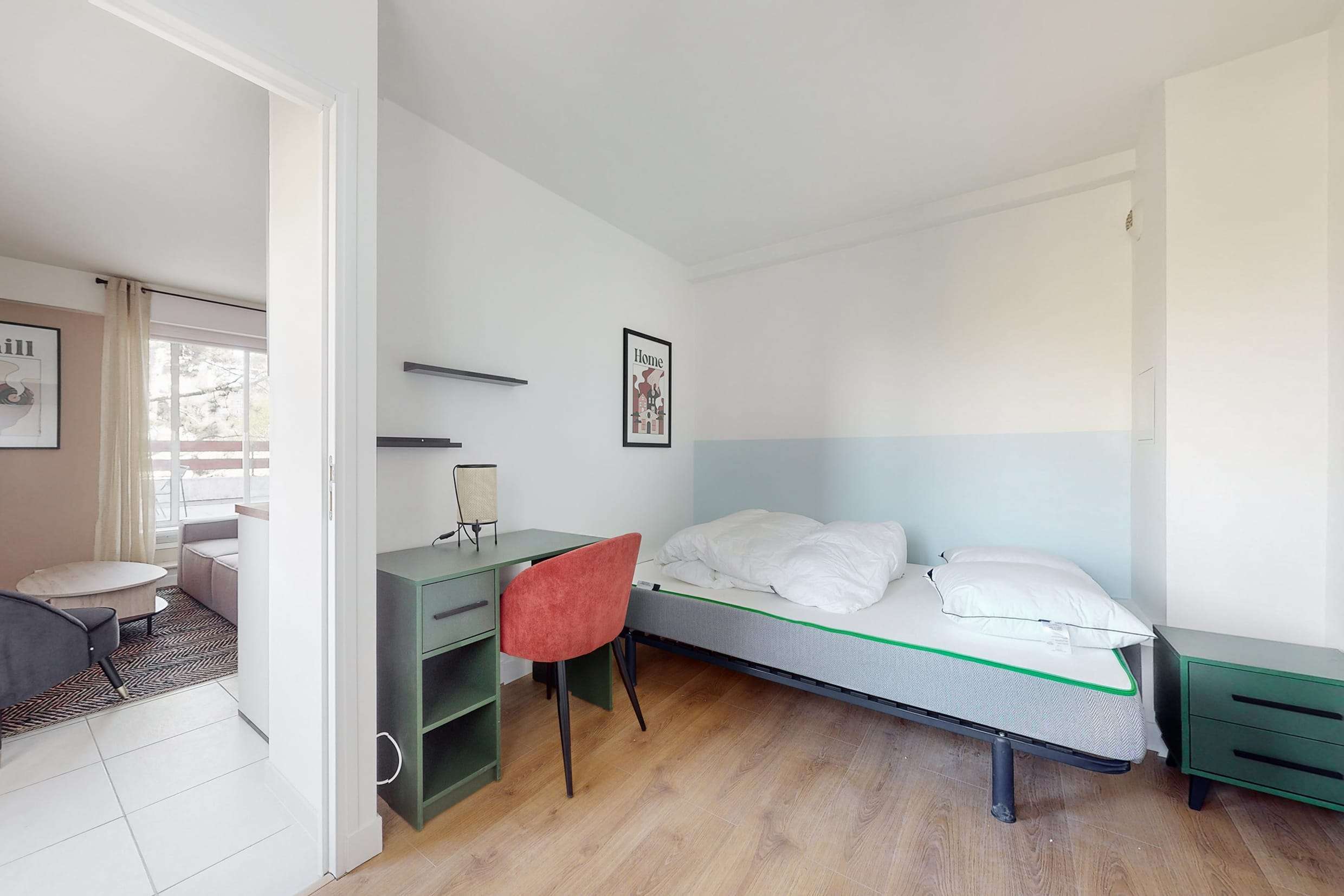 Room 1 est conçue spécialement pour votre confort personnel. Avec ses 10 m², la chambre offre un lit double avec literie de qualité, une armoire pour vos affaires, ainsi qu'un bureau et une chaise pour travailler ou étudier en toute tranquillité. La chambre bénéficie également d'une connexion internet haut débit et partage une salle de bain bien équipée avec d'autres résidents.