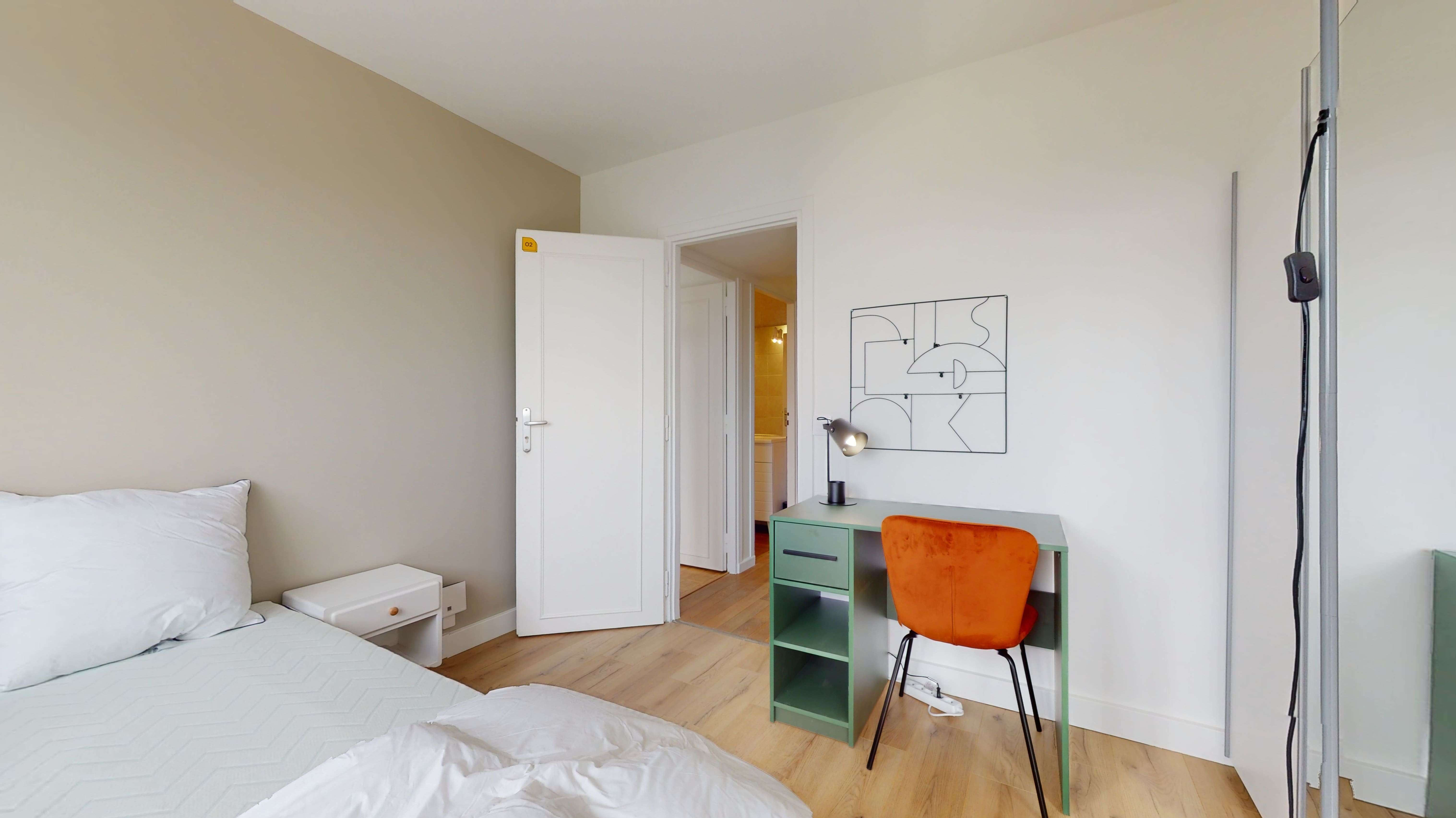 La chambre disponible, nommée Room 2, offre l'intimité nécessaire avec ses 9 m² confortablement meublés. Elle est dotée d'un lit double avec une literie de qualité, d'une armoire spacieuse pour vos habits, d'un bureau pour travailler ou étudier et d'autres commodités pratiques. La chambre partage une salle de bain bien entretenue avec une douche et des toilettes.