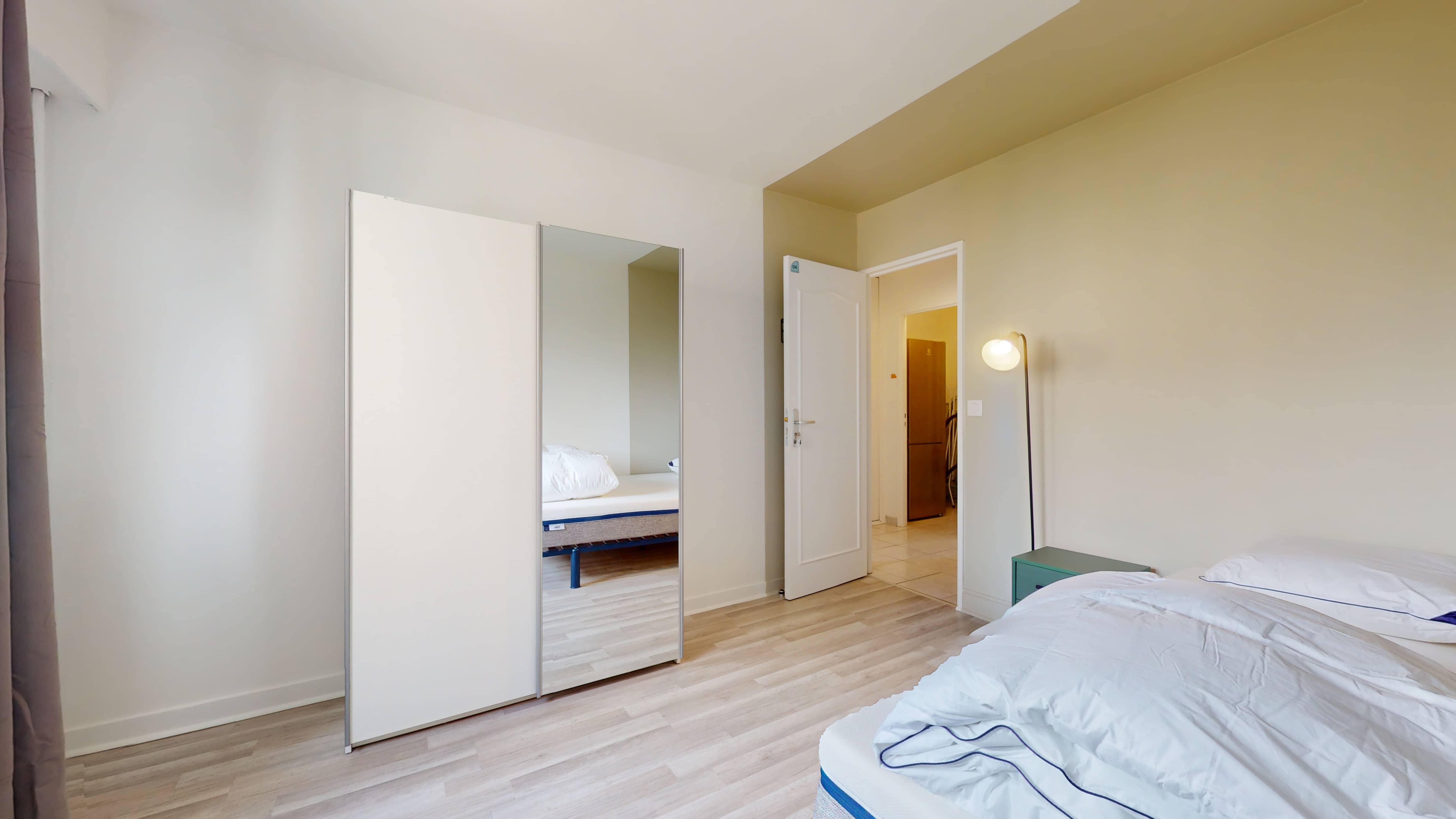 Room 4 est spécialement conçue pour une personne et offre tout le confort nécessaire : un lit double avec une literie de qualité, une grande armoire pour ranger vos affaires, ainsi qu'un bureau et une chaise pour travailler ou étudier en toute tranquillité. La chambre partage une salle de bains moderne avec d'autres locataires, garantissant intimité et confort.