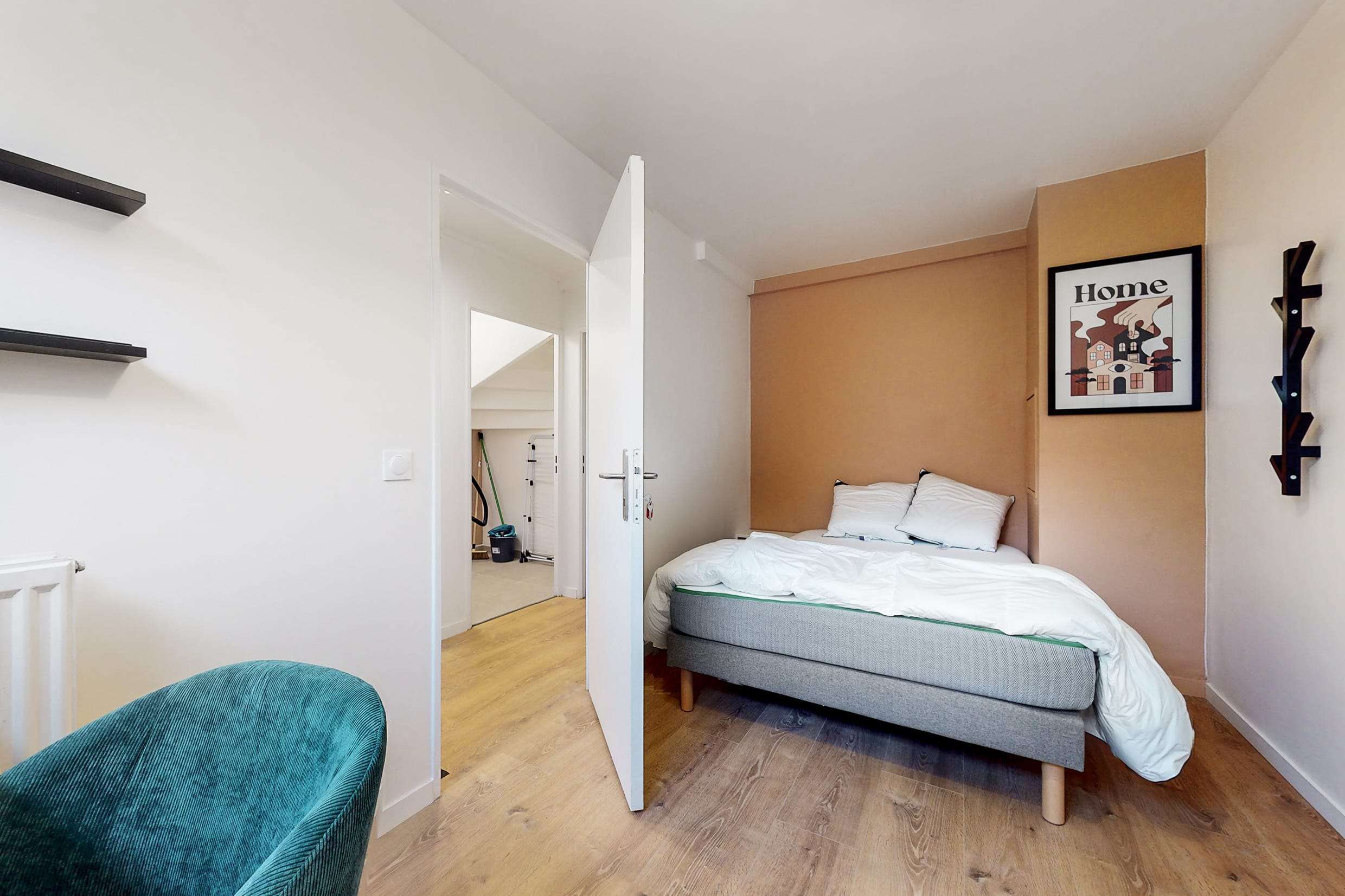La chambre 5 est conçue pour accueillir confortablement une personne. Elle est équipée d'un douillet lit double avec de la literie de qualité, une armoire pour vos vêtements, ainsi qu'un bureau et une chaise pour travailler ou étudier en toute tranquillité. La chambre partage une salle de bain bien entretenue avec d'autres locataires.