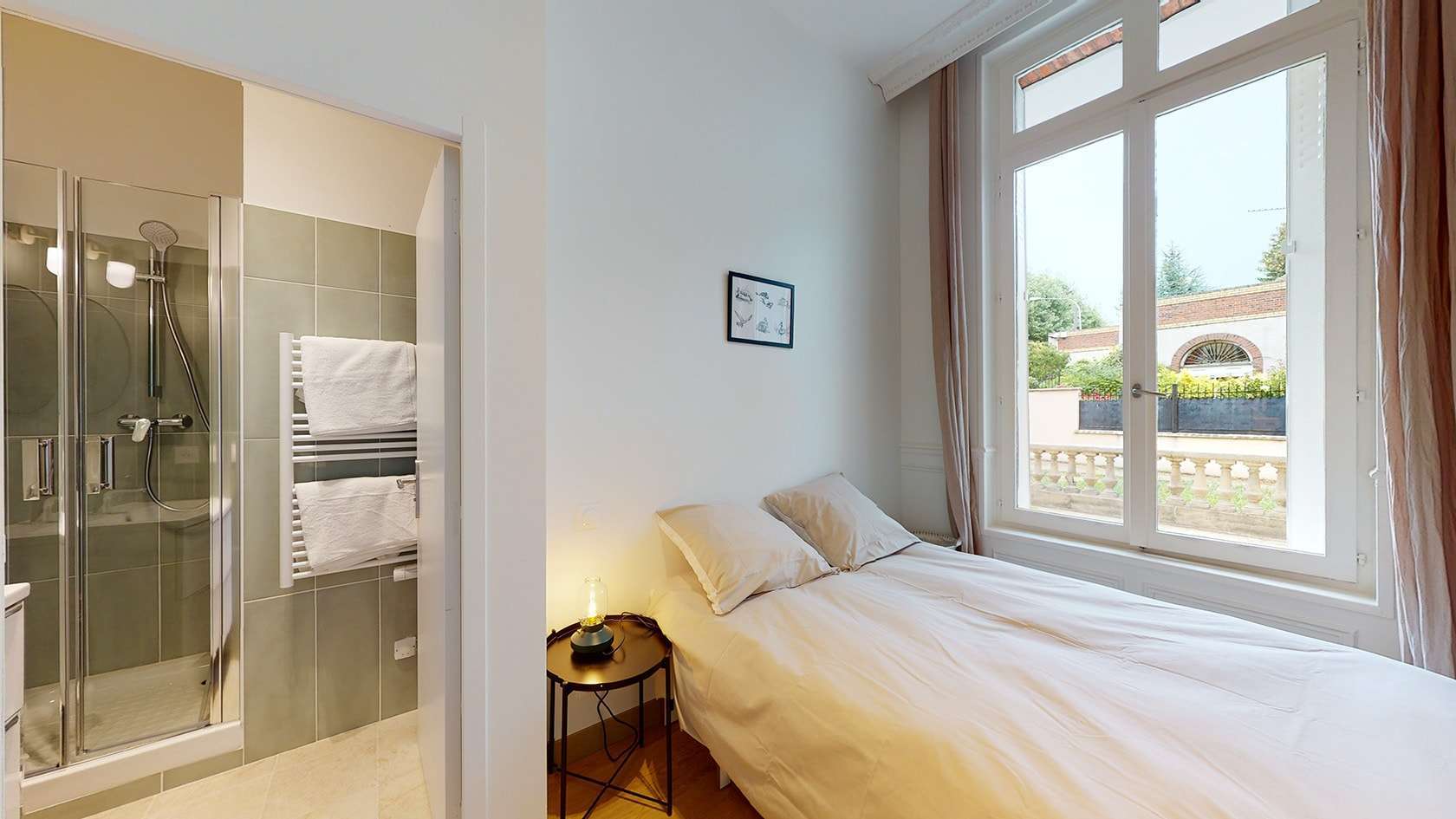 La chambre 1, située au rez-de-chaussée, est un cocon parfait pour une personne. D'une superficie de 13m², elle dispose d'une salle de bain privée avec douche et lavabo. La chambre est équipée d'un lit confortable avec rangements intégrés, d'une penderie pour vos vêtements, d'un fauteuil pour se relaxer, d'une table pratique et d'un accès direct à la terrasse. La décoration est soignée avec des draps de qualité et une lampe de chevet pour vos lectures nocturnes.