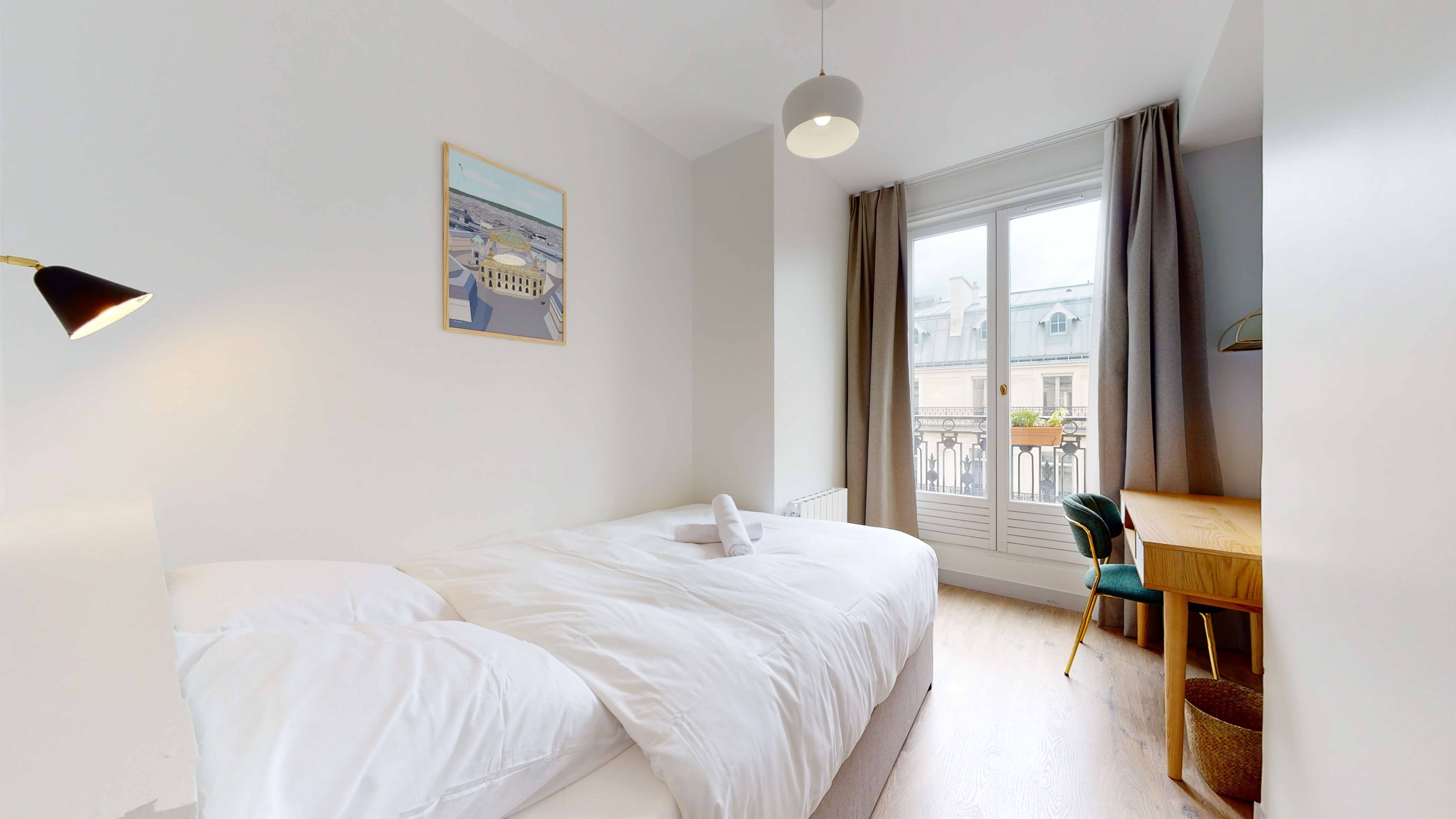 La chambre "Room for one person - 2" est un cocon douillet de 11m² situé au premier étage, avec un accès direct sur le balcon. Elle est conçue pour une personne et comprend tout le nécessaire pour un confort optimal : un lit double avec une literie de qualité, une armoire pour vos affaires, ainsi qu'un bureau et une chaise pour travailler ou étudier. La chambre partage une salle de bain moderne avec douche et lavabo avec un autre locataire.