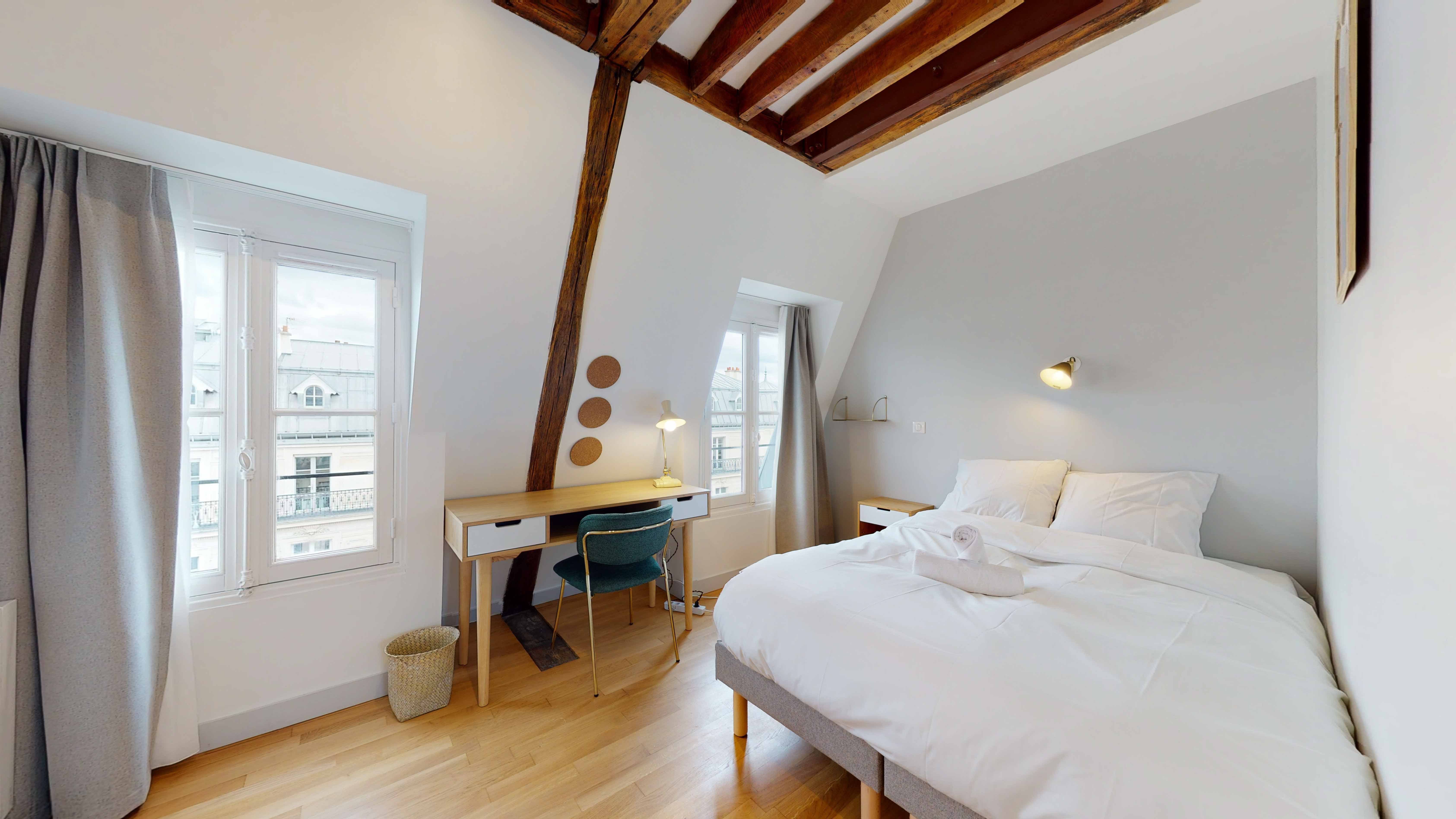 La chambre "Room for one person - 8", située au deuxième étage, est un cocon parfait pour une personne. Elle est équipée d'un confortable lit double avec de la literie de qualité, une armoire pour ranger vos affaires, un bureau avec une chaise et une lampe de bureau pour travailler ou étudier, ainsi qu'une lampe de chevet pour vos lectures nocturnes. La chambre partage une salle de bain moderne avec douche et lavabo avec un autre locataire.