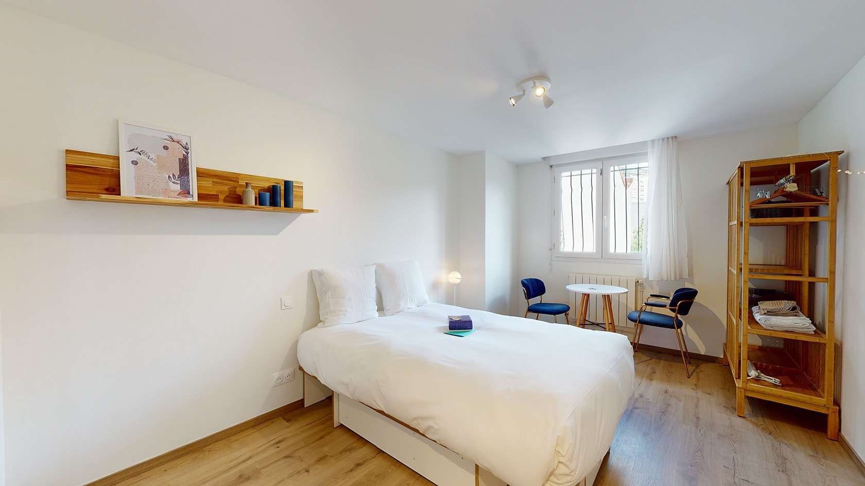 Votre chambre privée numéro 8, située au premier étage, est un cocon conçu pour une personne. Elle comprend une salle de bain privée avec douche et lavabo pour votre confort. Le lit double avec rangement intégré, la penderie, le fauteuil et la table créent un espace personnel agréable et fonctionnel. La chambre est également équipée d'une lampe de chevet, d'une table de nuit, de linge de maison et d'un radiateur pour garantir votre confort toute l'année.