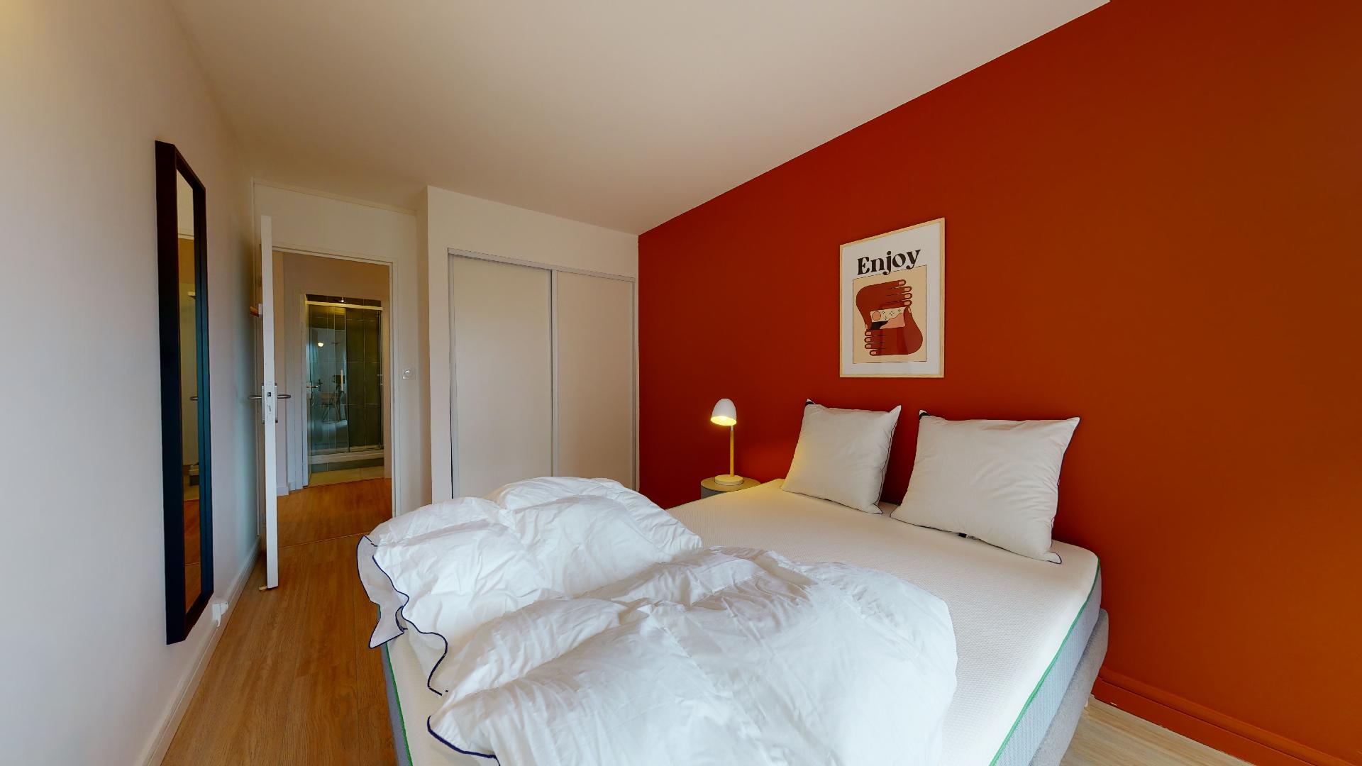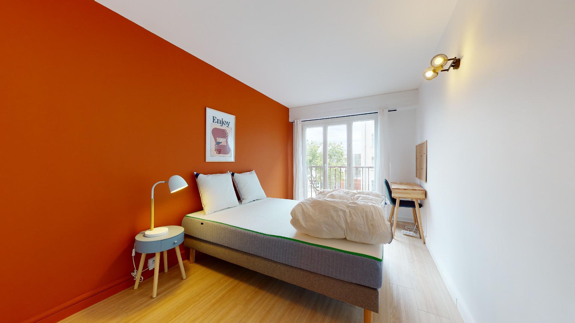 Votre chambre, Room 2, est un petit cocon personnel de 13 m². Elle est bien meublée avec un lit double confortable, une armoire pour vos affaires, un bureau et une chaise pour travailler et une lampe de bureau pour vos soirées de lecture. La salle de bain est partagée avec les autres locataires et comprend une douche, un lavabo et des toilettes.