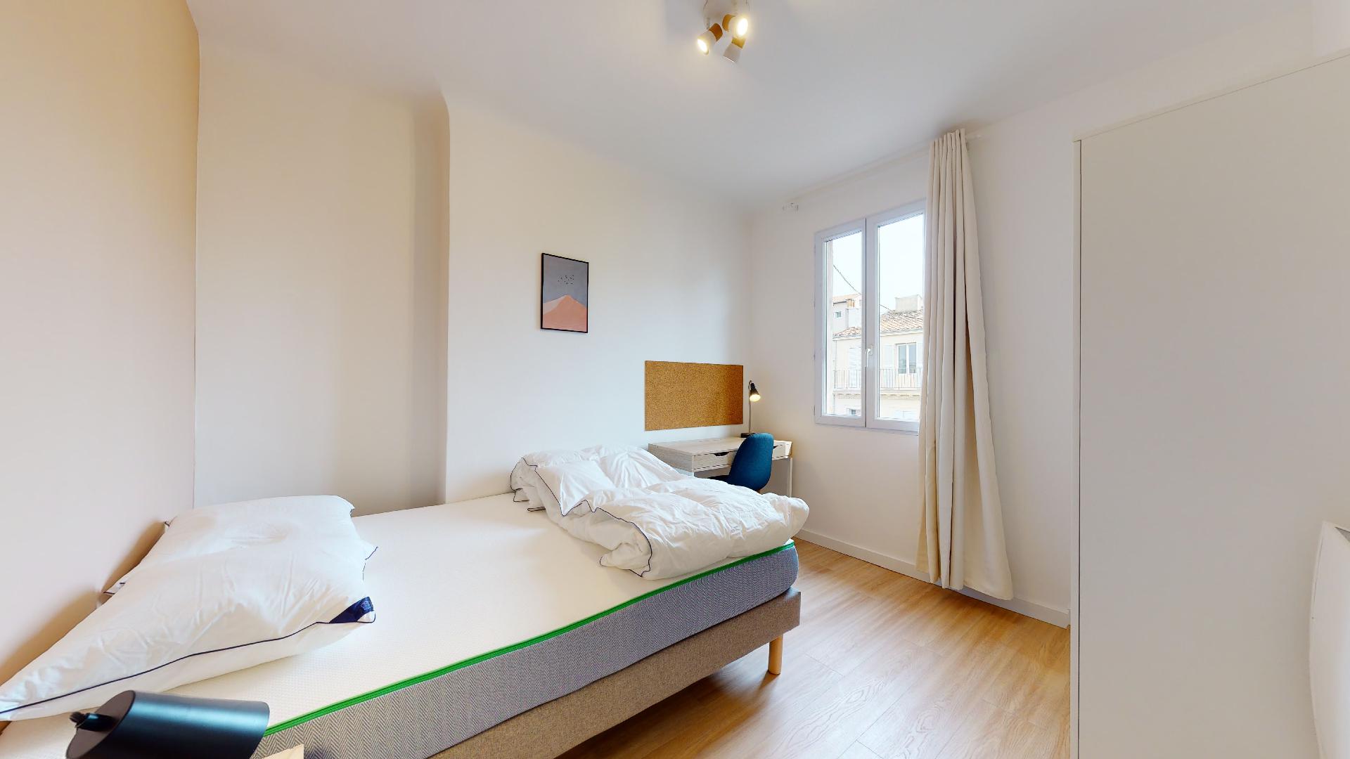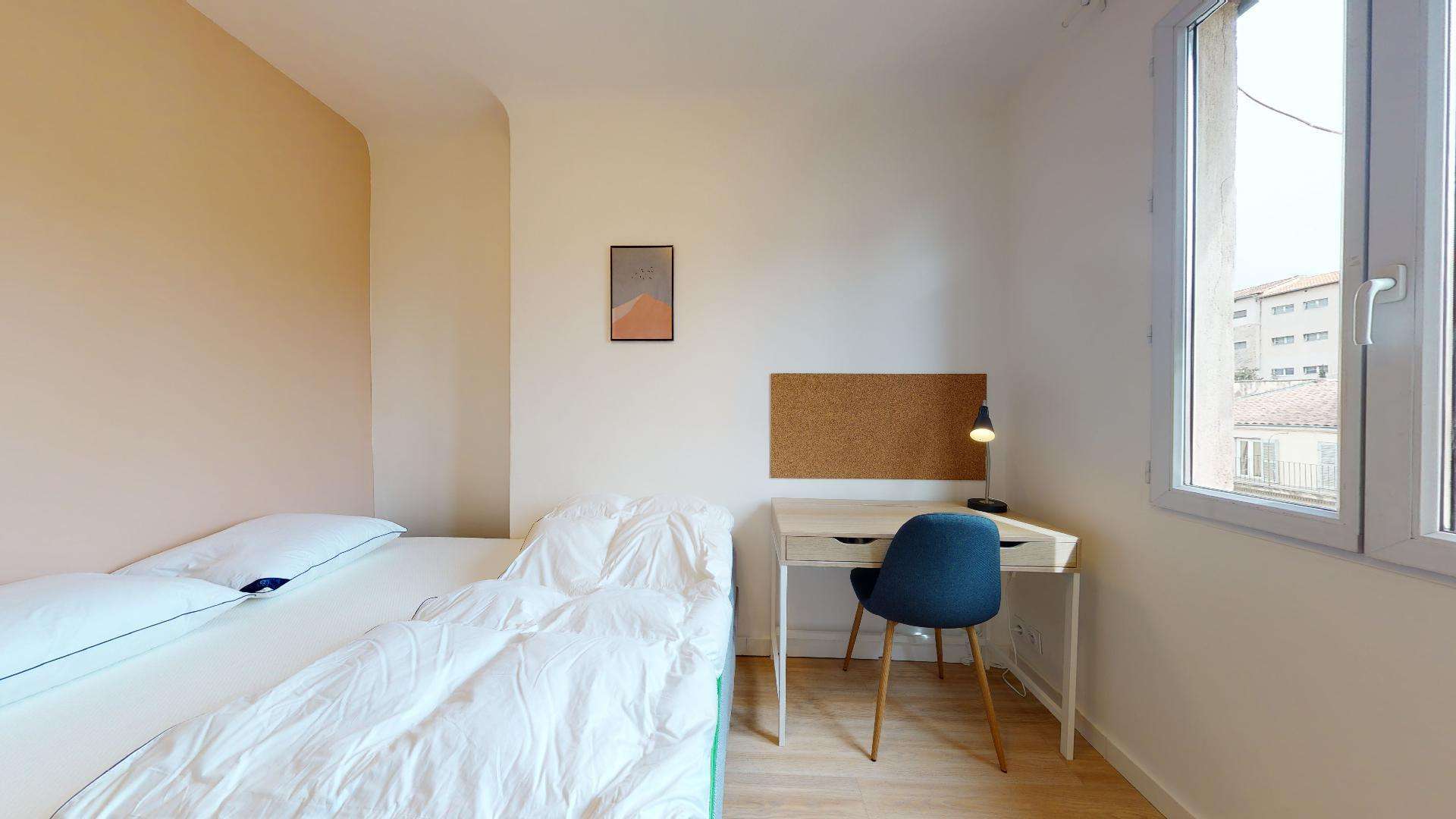 La chambre 4 est conçue spécialement pour une personne, avec un espace de 9 m² qui intègre tout ce dont vous avez besoin : un lit double confortable pour bien dormir, une armoire pour ranger vos affaires, un bureau et une chaise pour travailler ou étudier, ainsi qu'une lampe de bureau. Vous partagerez une salle de bains moderne avec douche et WC.