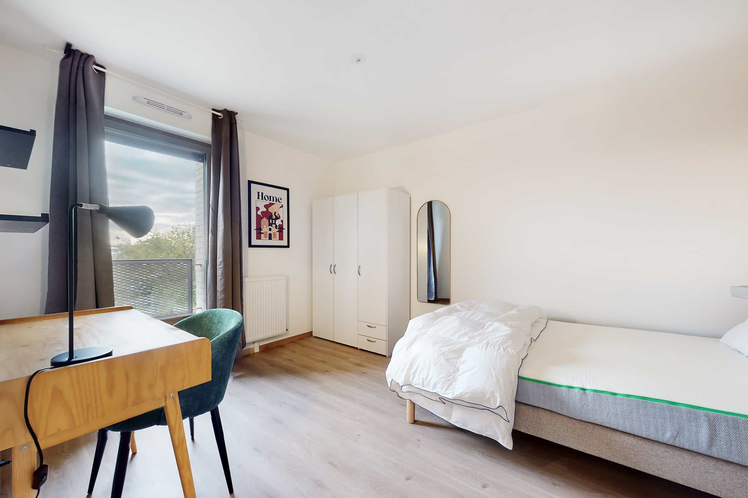 La chambre 1, conçue spécialement pour une personne, vous offre tout le confort nécessaire : un grand lit douillet avec de belles draps, un bureau pour travailler ou étudier, une chaise et une armoire pour ranger vos affaires. Vous partagerez une salle de bain propre et fonctionnelle avec une douche et des toilettes avec quelques autres colocataires.