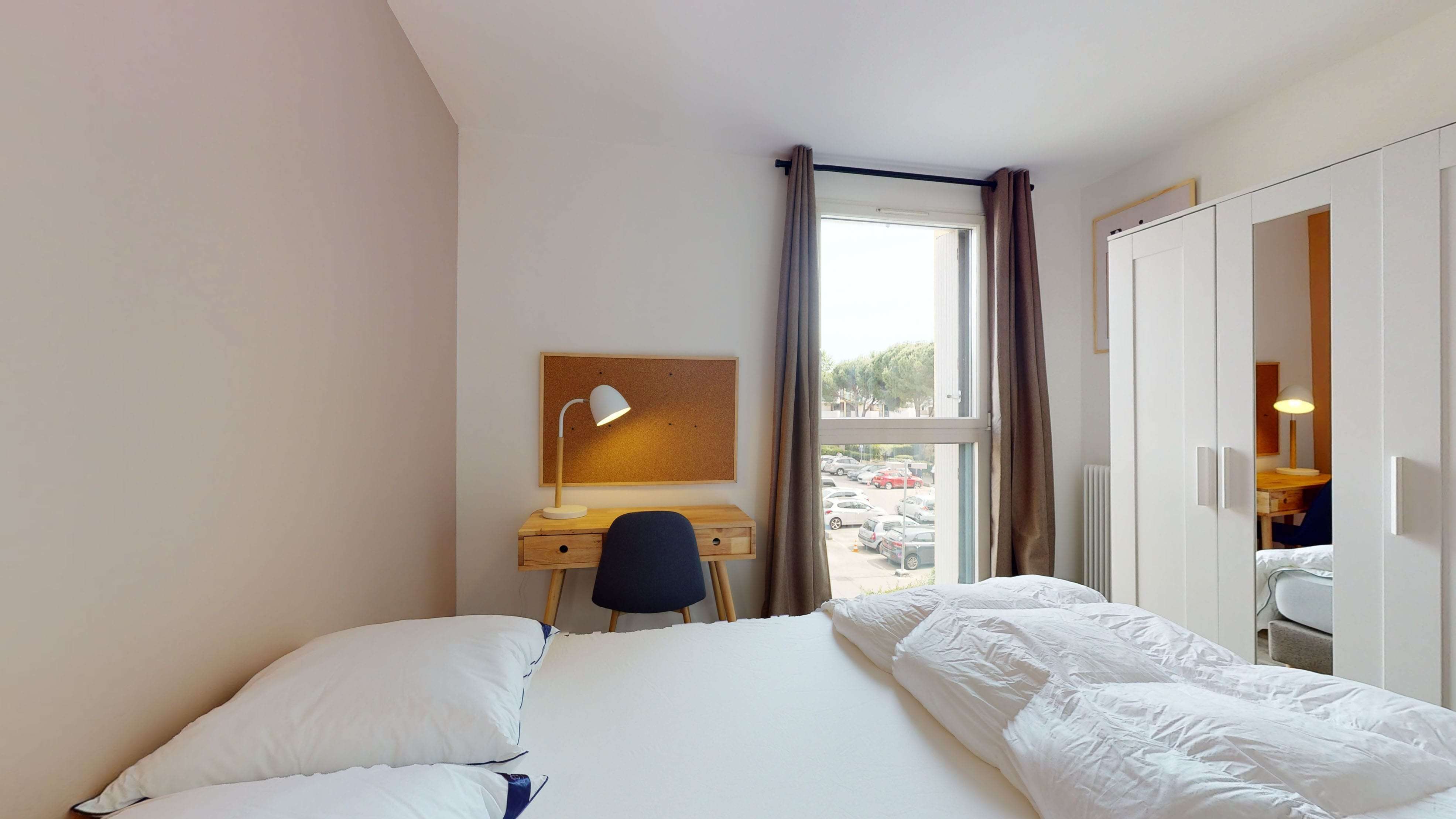 La Room 1 est parfaite pour une personne. Elle est meublée d'un lit double confortable, d'une armoire pour ranger vos affaires, d'une chaise et d'un bureau pour vos moments d'étude ou de travail. La chambre dispose également d'une lampe de bureau et d'un radiateur, garantissant un espace bien éclairé et chaud. Elle a une superficie de 12 m² et partage une salle de bain moderne avec les autres locataires.