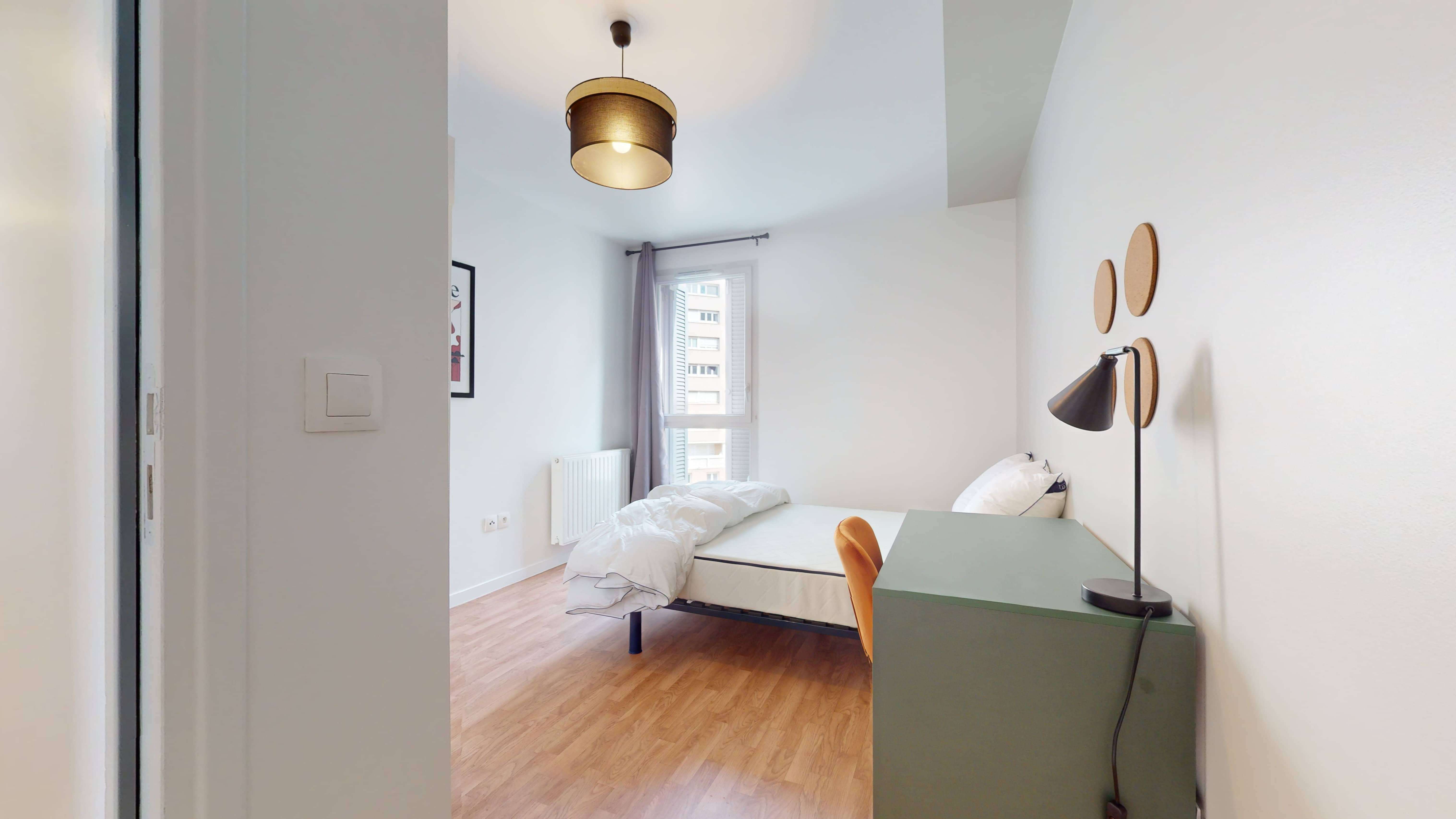 La chambre que nous vous proposons, Room 1, est spécialement conçue pour une personne. Avec ses 11m², elle est meublée d'un lit double confortable, d'une armoire pour ranger vos affaires, d'une chaise et d'un bureau pour étudier ou travailler. Elle bénéficie aussi d'un accès à une salle de bain moderne partagée qui comprend une douche, un lavabo et des toilettes.