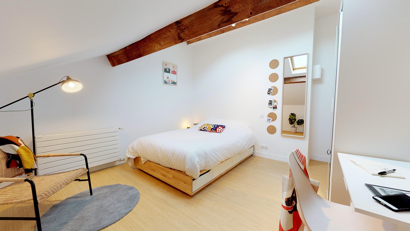 La chambre 12, située au second étage, est un cocon parfait pour une personne. Elle dispose d'un lit confortable avec des rangements intégrés, d'une penderie pour vos vêtements, d'un fauteuil pour vous relaxer et d'un bureau d'appoint pour travailler ou étudier. La chambre partage une salle de bain complète (douche et toilettes) avec un autre locataire, garantissant confort et intimité.