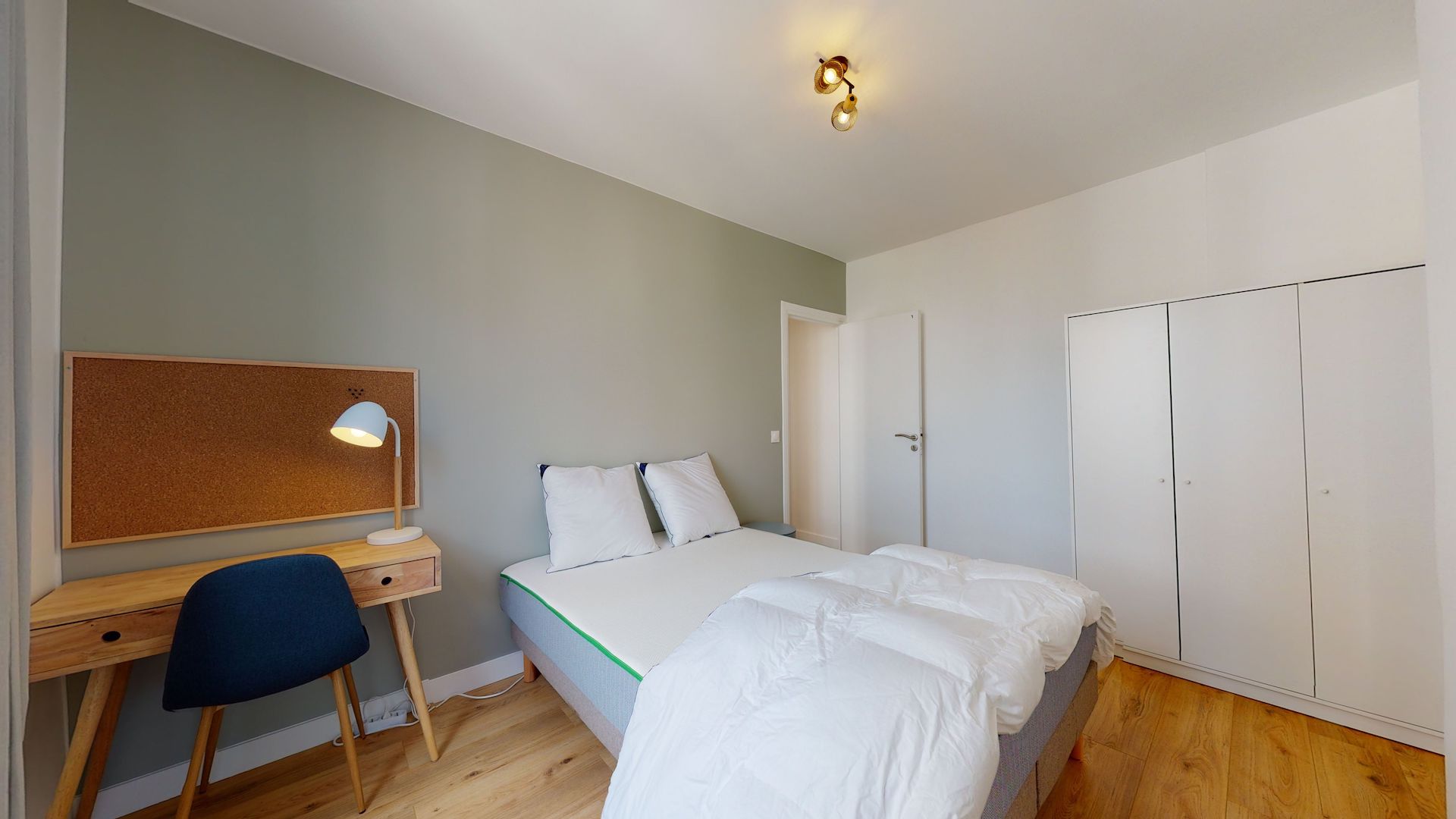 La chambre Room1 est un espace privé juste pour vous. Avec ses 12 m², elle dispose d'un lit double confortable avec de la literie de qualité, une armoire pour vos affaires, une chaise, un bureau avec une lampe pour étudier ou travailler, et une table de nuit. La chambre partage une salle d'eau moderne avec douche, lavabo et WC avec deux autres locataires.