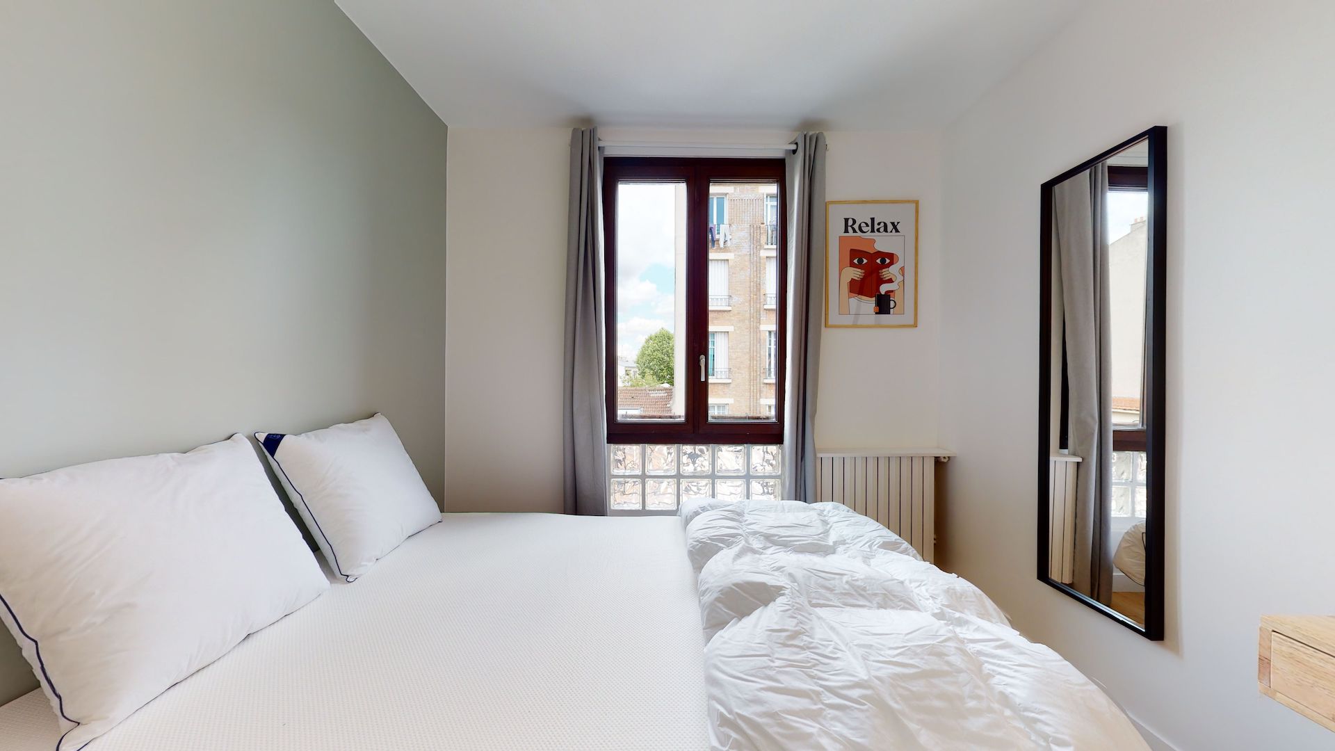 La chambre, nommée Room2, est idéale pour une personne. Elle est équipée d'un confortable lit double et tout ce dont vous avez besoin pour étudier ou travailler au calme : un bureau, une chaise, et une lampe de bureau. Vous y trouverez aussi une armoire pour toutes vos affaires. La salle de bain est à partager avec deux autres locataires.