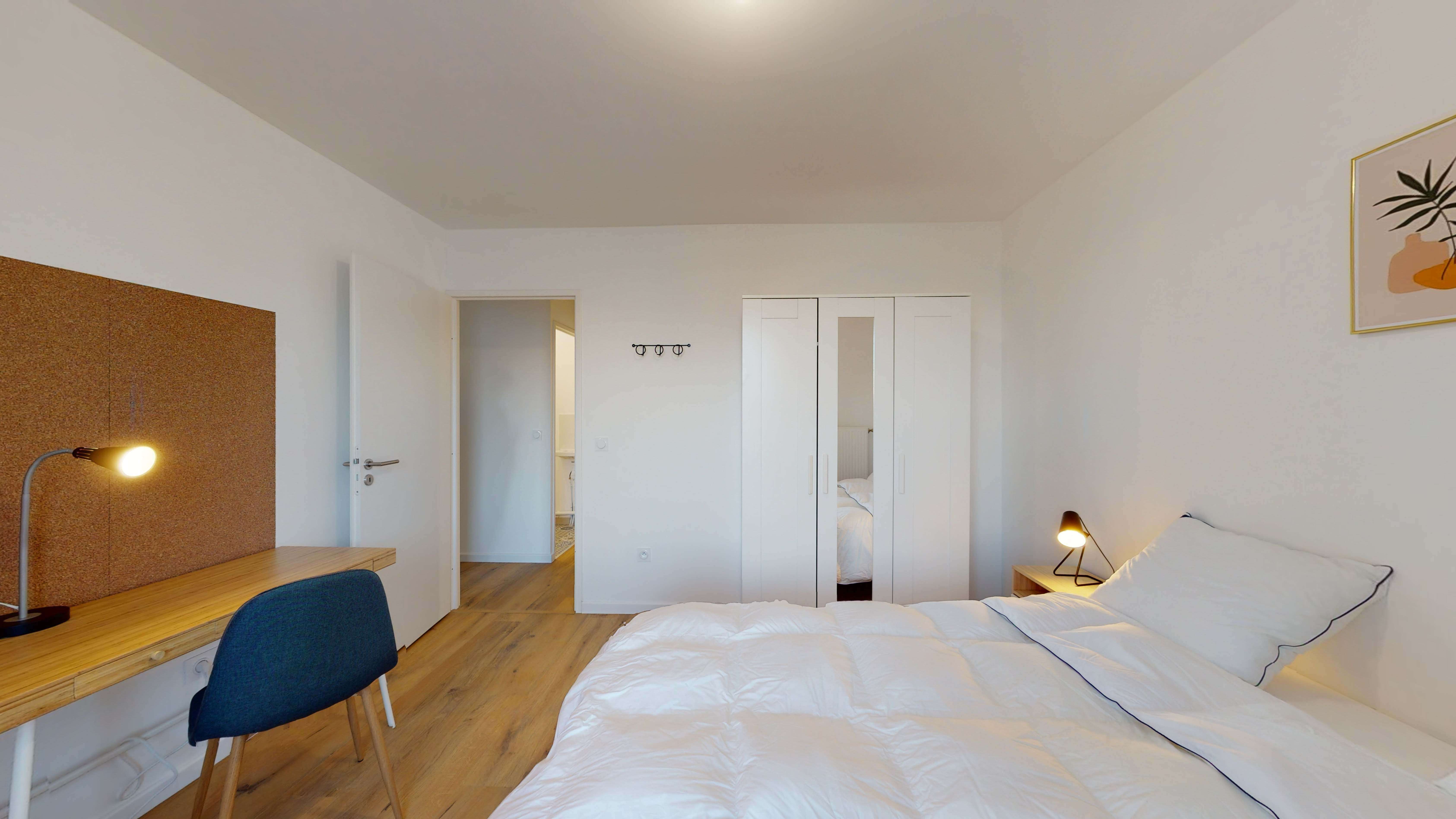 La chambre 2 est un espace personnel juste pour vous. Avec un lit double confortable, une armoire pour vos vêtements, une chaise et un bureau pour travailler ou étudier en paix. Elle partage une salle de bain moderne avec une autre chambre. C'est l'endroit parfait pour se reposer et avoir son intimité.