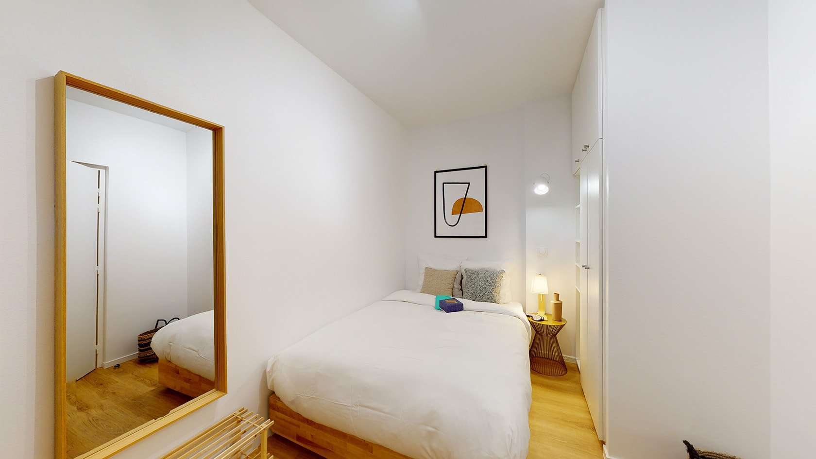 La chambre 3, située au rez-de-chaussée, est conçue pour accueillir confortablement une personne. Elle est meublée d'un lit double avec rangement intégré, d'une penderie spacieuse pour vos affaires, ainsi que d'une table et une chaise pour travailler ou étudier en toute tranquillité. La chambre bénéficie également d'une salle de bain partagée avec une autre unité, comprenant une douche moderne et un lavabo.