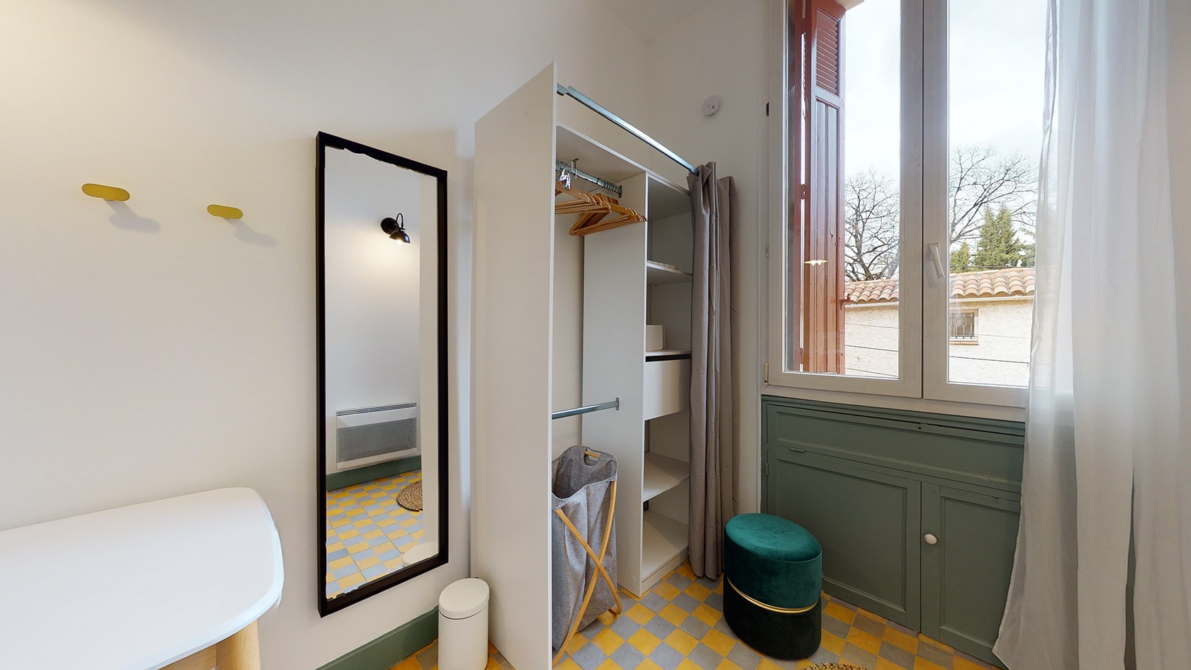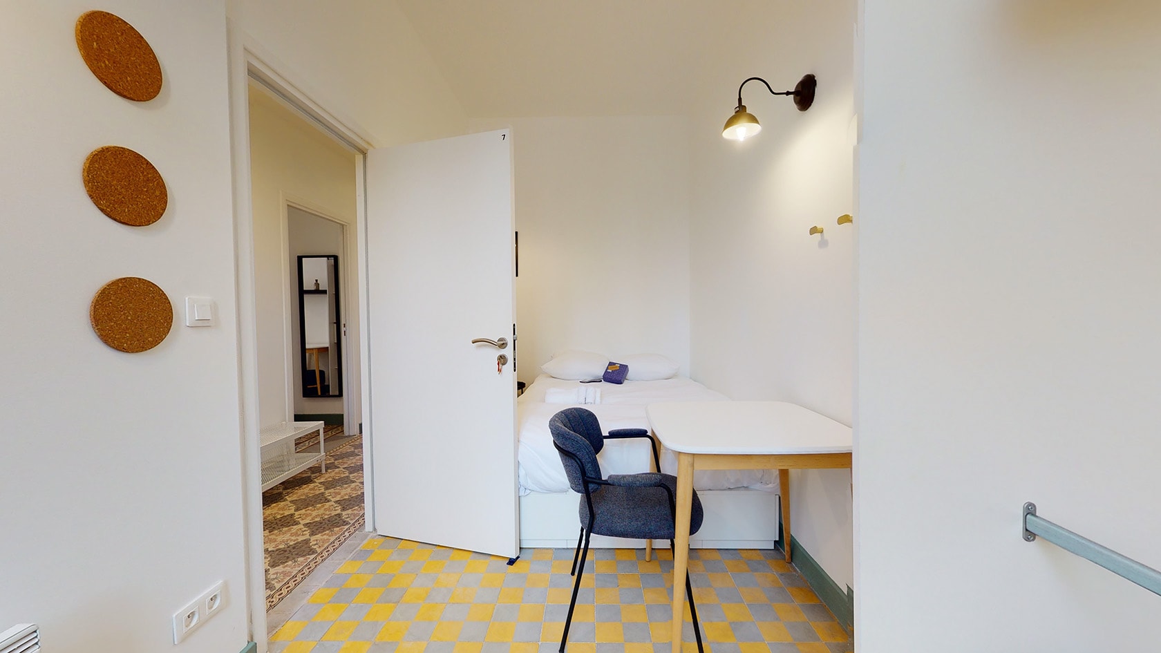 La Chambre 7, située au premier étage, est un cocon parfait pour une personne. Elle est meublée d’un lit double confortable avec rangement intégré, d’une armoire pour vos affaires, ainsi que d'une table et d'une chaise pour travailler ou lire. La chambre partage une salle de bain moderne avec une autre personne, garantissant intimité et confort.