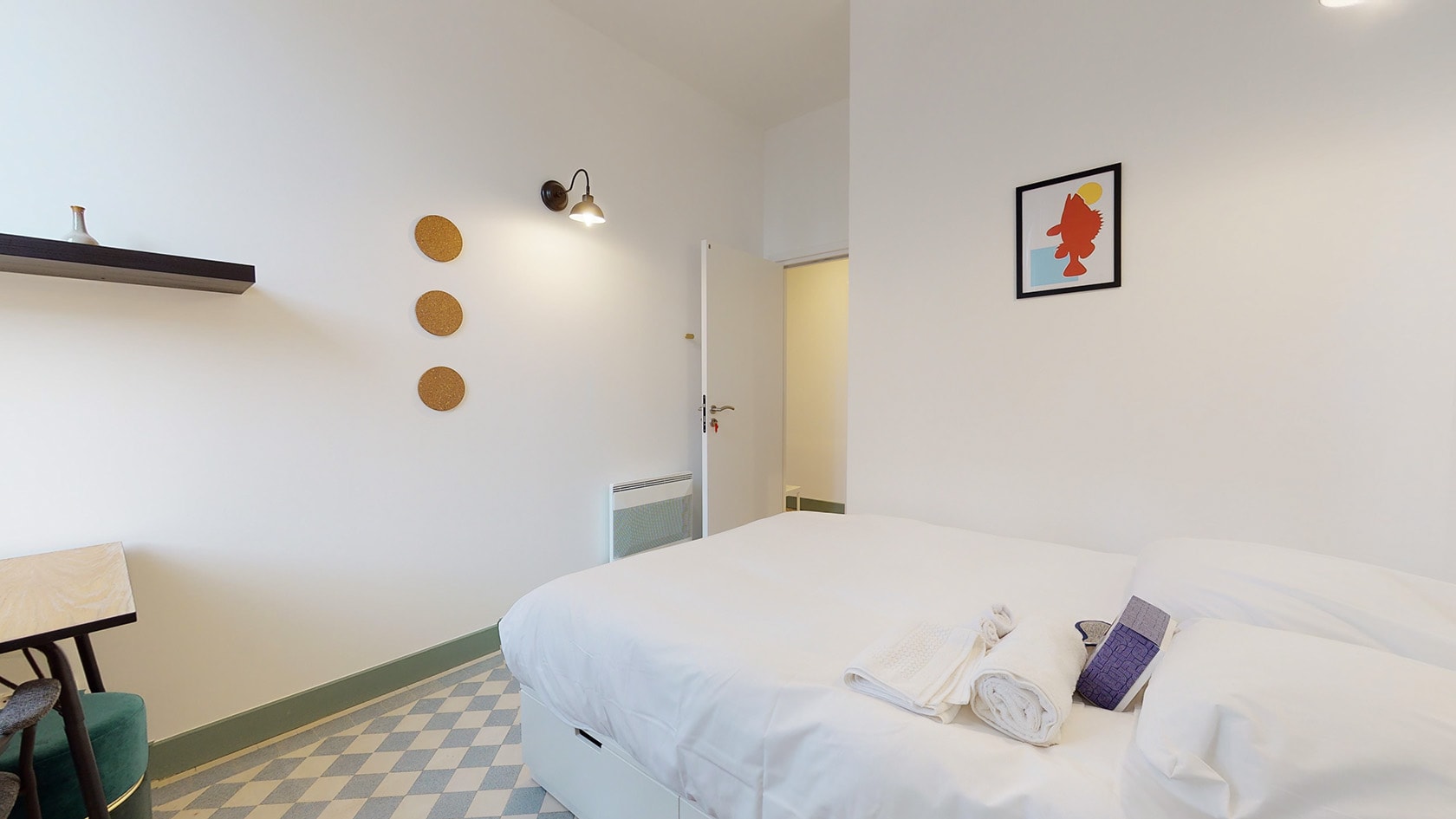 Votre chambre privative numéro 8 se trouve au premier étage. Elle est parfaite pour une personne et comprend un lit double confortable avec des draps de qualité, une armoire pour vos affaires, ainsi qu'une table et une chaise pour travailler ou écrire. La chambre partage une salle de bain avec une autre personne, équipée d'une douche et d'un lavabo.
