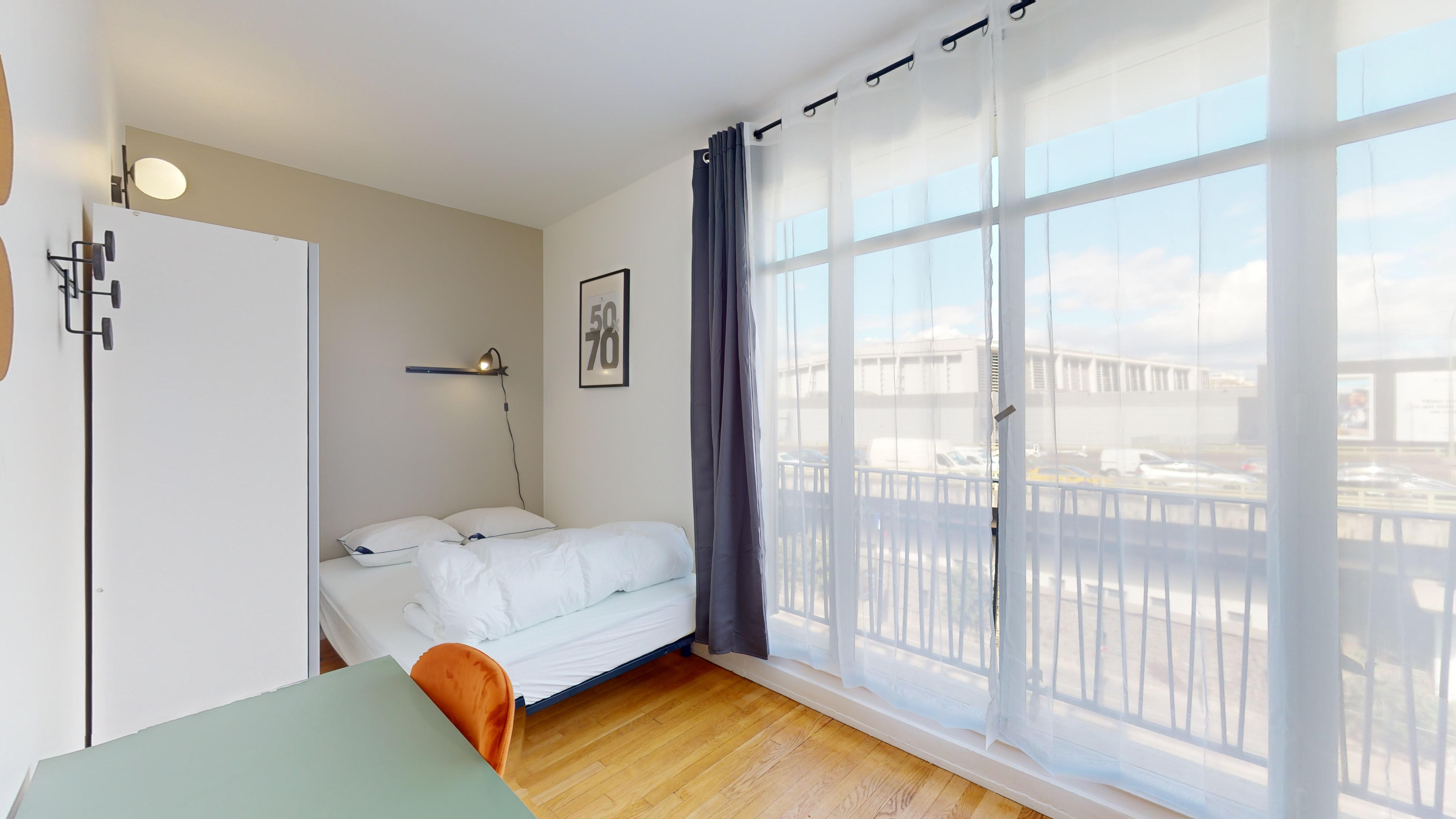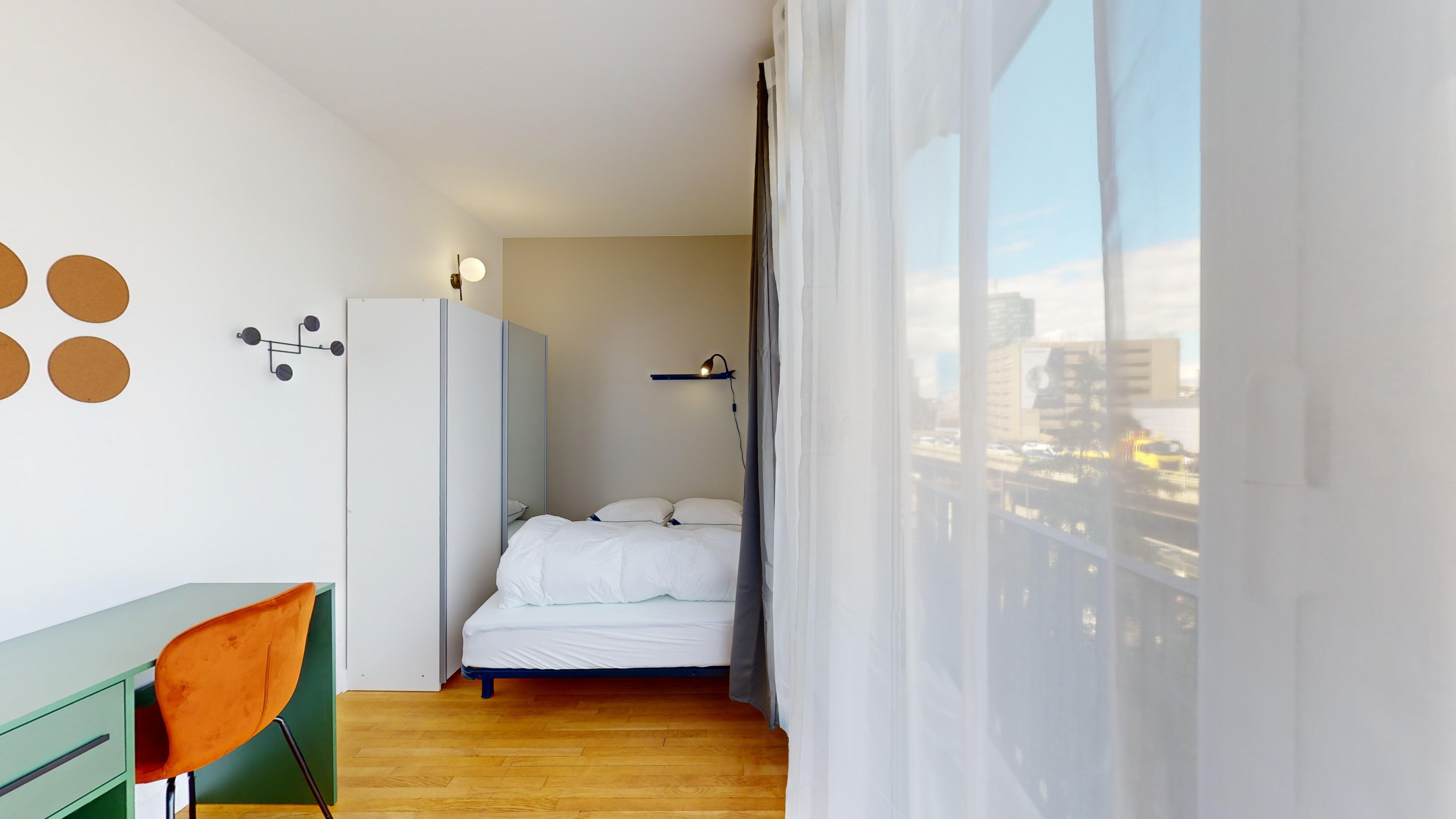 Votre chambre "Cocoon" est un espace confortable de 15 m² avec un lit douillet, un bureau pour travailler et des rangements pour vos affaires. Elle bénéficie d'une salle de bain privative moderne avec une douche spacieuse. Tout est prêt pour que vous vous sentiez chez vous.