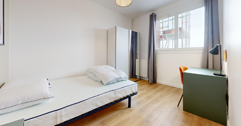 Votre chambre privée est un havre de paix avec tout le confort nécessaire : un lit douillet, un bureau pour travailler et des rangements pour vos affaires. La salle de bain attenante est moderne et rien que pour vous. Le mobilier est fonctionnel et en parfait état, prêt à vous accueillir.