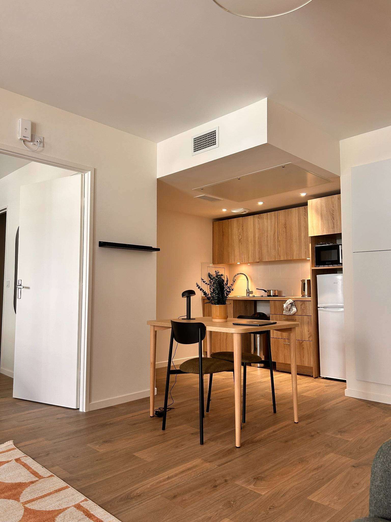 Découvrez votre futur chez-vous, parfait pour deux personnes ! Cet appartement de 43.7 m² est bien pensé avec une chambre séparée équipée d'un lit double confortable et d'une armoire pour ranger vos affaires. La salle de bain privative est pratique avec sa douche, son lavabo et ses toilettes. Vous allez adorer la cuisine qui s'ouvre sur le salon, où vous pouvez préparer vos repas avec les plaques de cuisson, le micro-ondes et garder vos aliments au frais dans le réfrigérateur. Le salon est accueillant avec un canapé-lit pour vos invités, une télévision pour vos soirées détente et une table avec des chaises pour partager des repas.