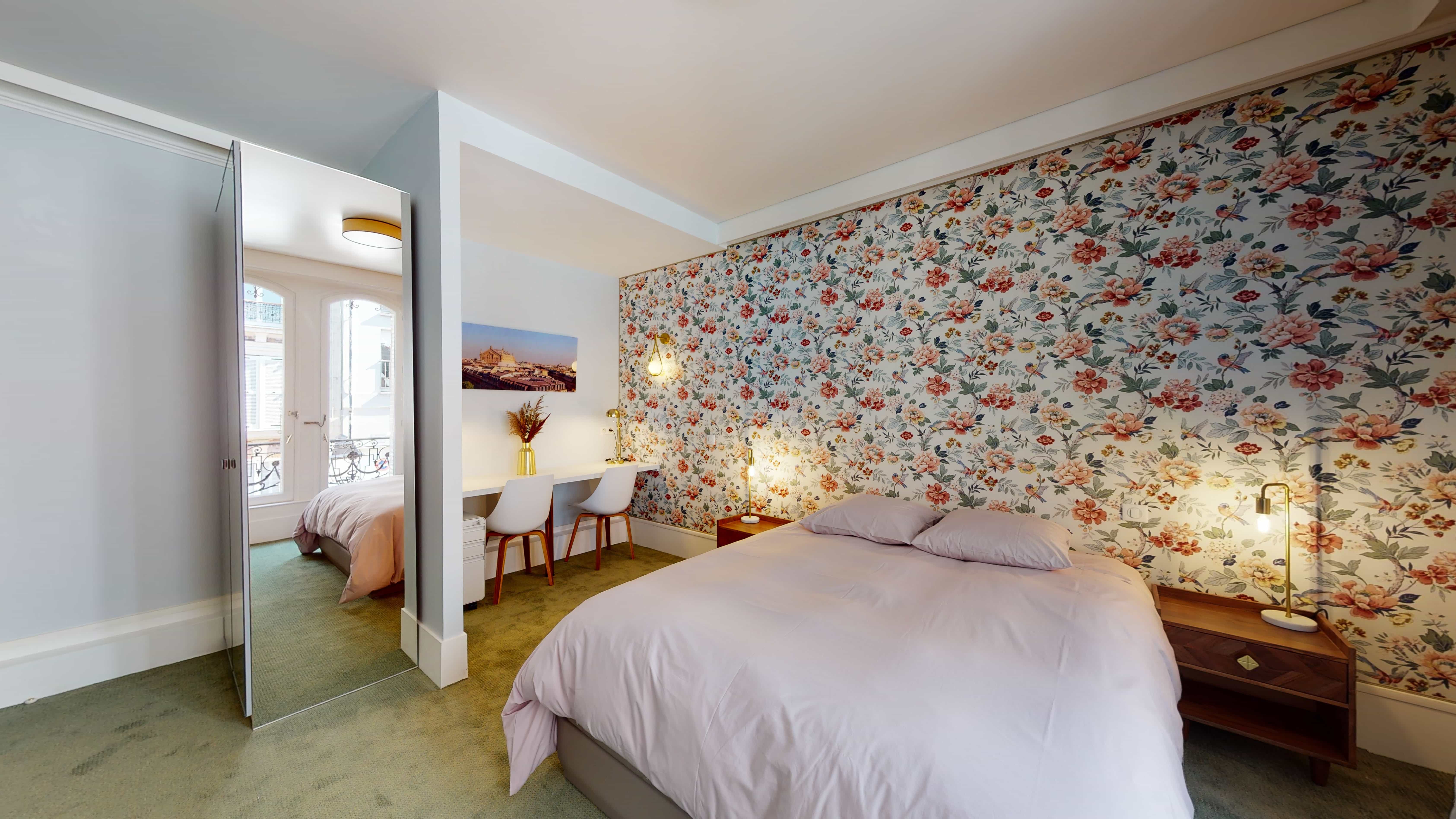 La chambre "Room for 2 - 7", située au premier étage, est conçue pour accueillir confortablement deux personnes. Elle dispose d'une salle de bain privative, d'un lit double avec rangement intégré, de deux chaises, d'un bureau pour travailler ou étudier, d'une penderie pour vos vêtements, ainsi que d'un bloc hôtel comprenant un mini-frigo, un micro-onde et tout le nécessaire de vaisselle. La chambre est également équipée d'un radiateur pour rester au chaud et de linge de lit de qualité.
