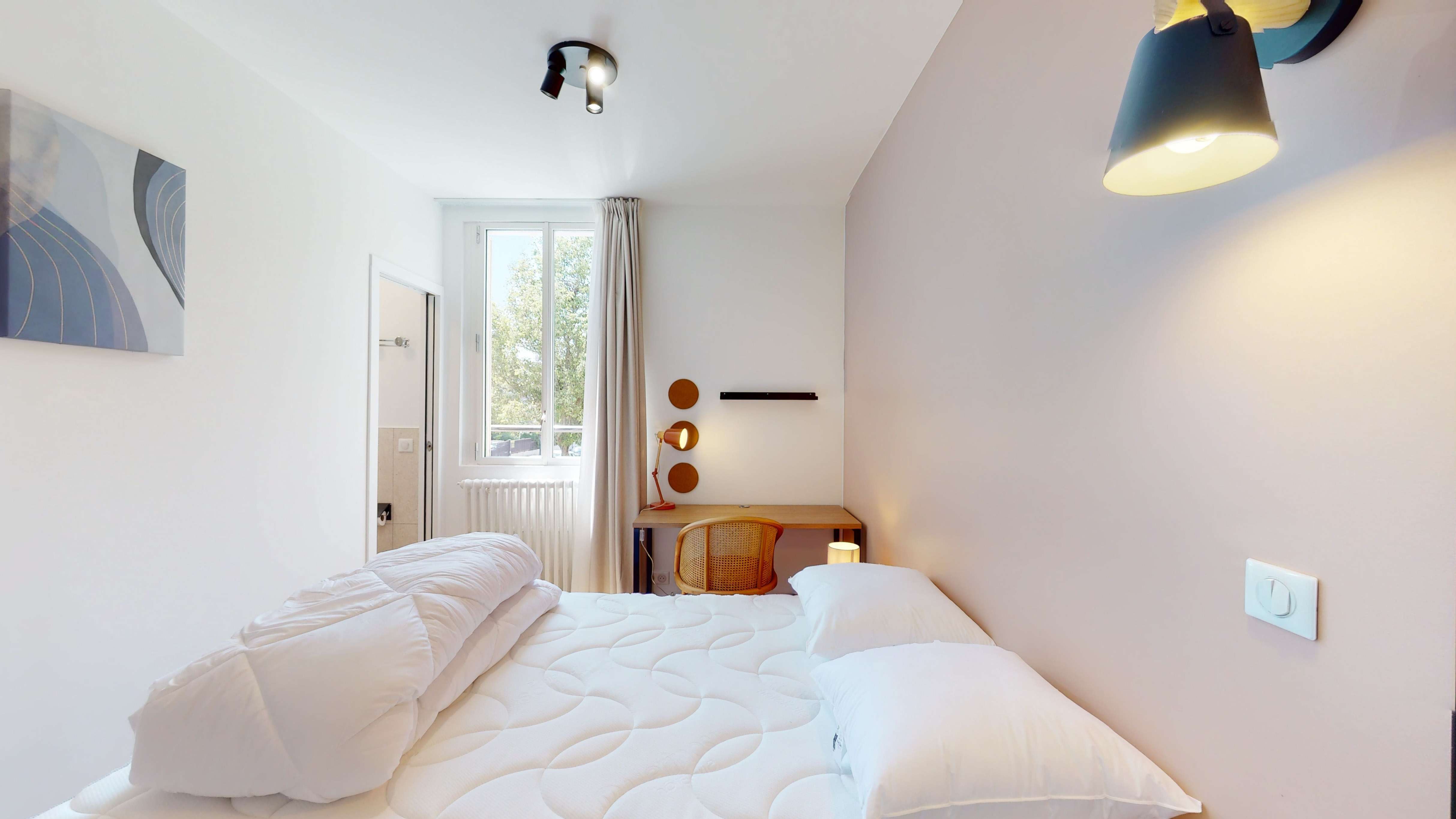 La chambre "Room for one person - 1" est un espace personnel et intime de 13m² situé au rez-de-chaussée. Elle est parfaitement équipée pour votre confort avec un lit double, une armoire spacieuse, un bureau pratique et une chaise. La salle de bain privative comprend une douche moderne, un lavabo et des toilettes. La chambre bénéficie également d'un radiateur pour les jours froids, d'une connexion internet haut débit et de tout le nécessaire pour que vous vous sentiez chez vous.