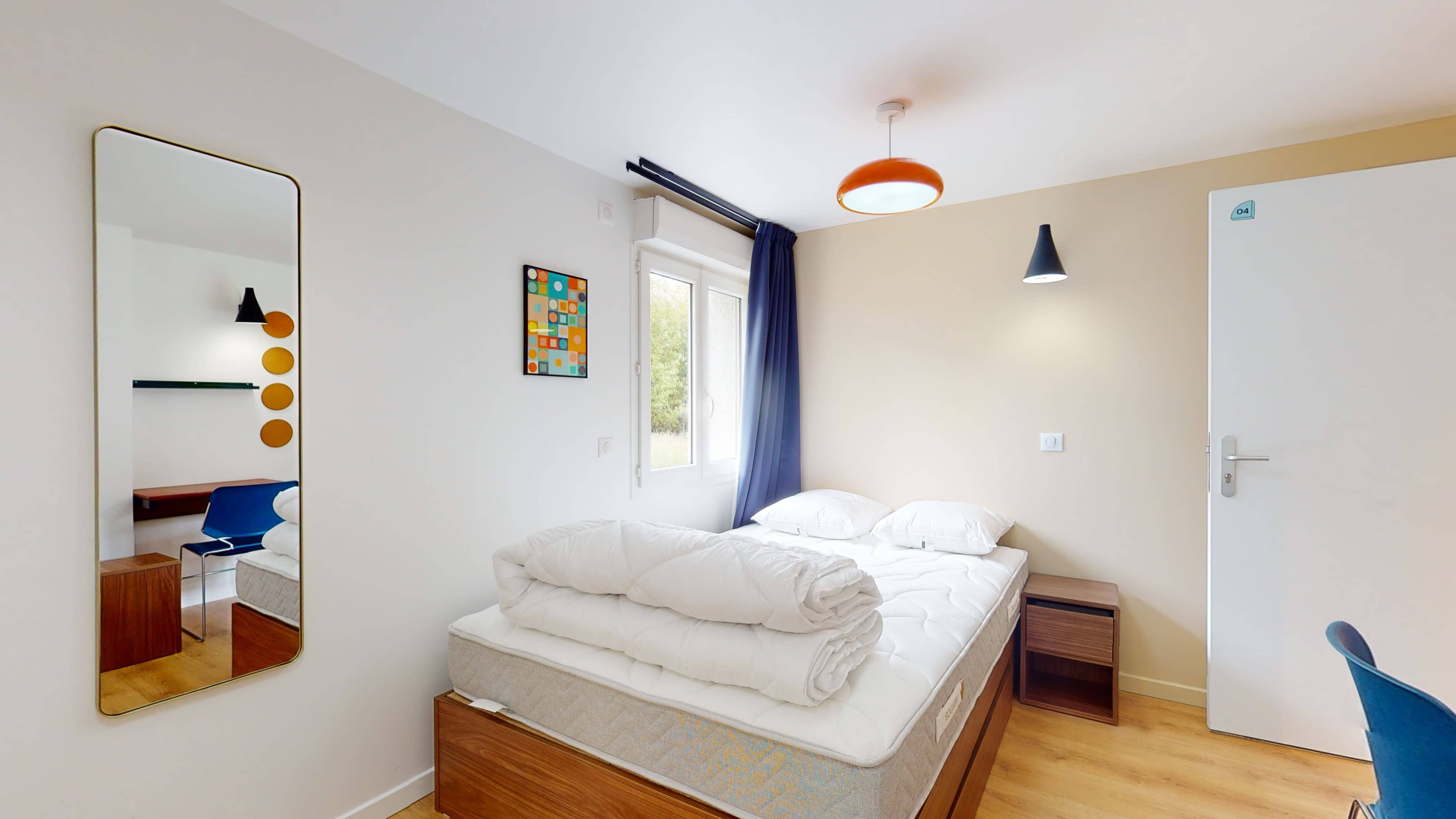 La chambre "Room for one person - 4" est un cocon de confort de 15m2 situé au rez-de-jardin. Elle est parfaite pour une personne avec son lit double douillet, une armoire spacieuse, un bureau et une chaise pour travailler ou étudier en toute tranquillité. La salle de bain privative est équipée d'une douche moderne, d'un lavabo et de toilettes.