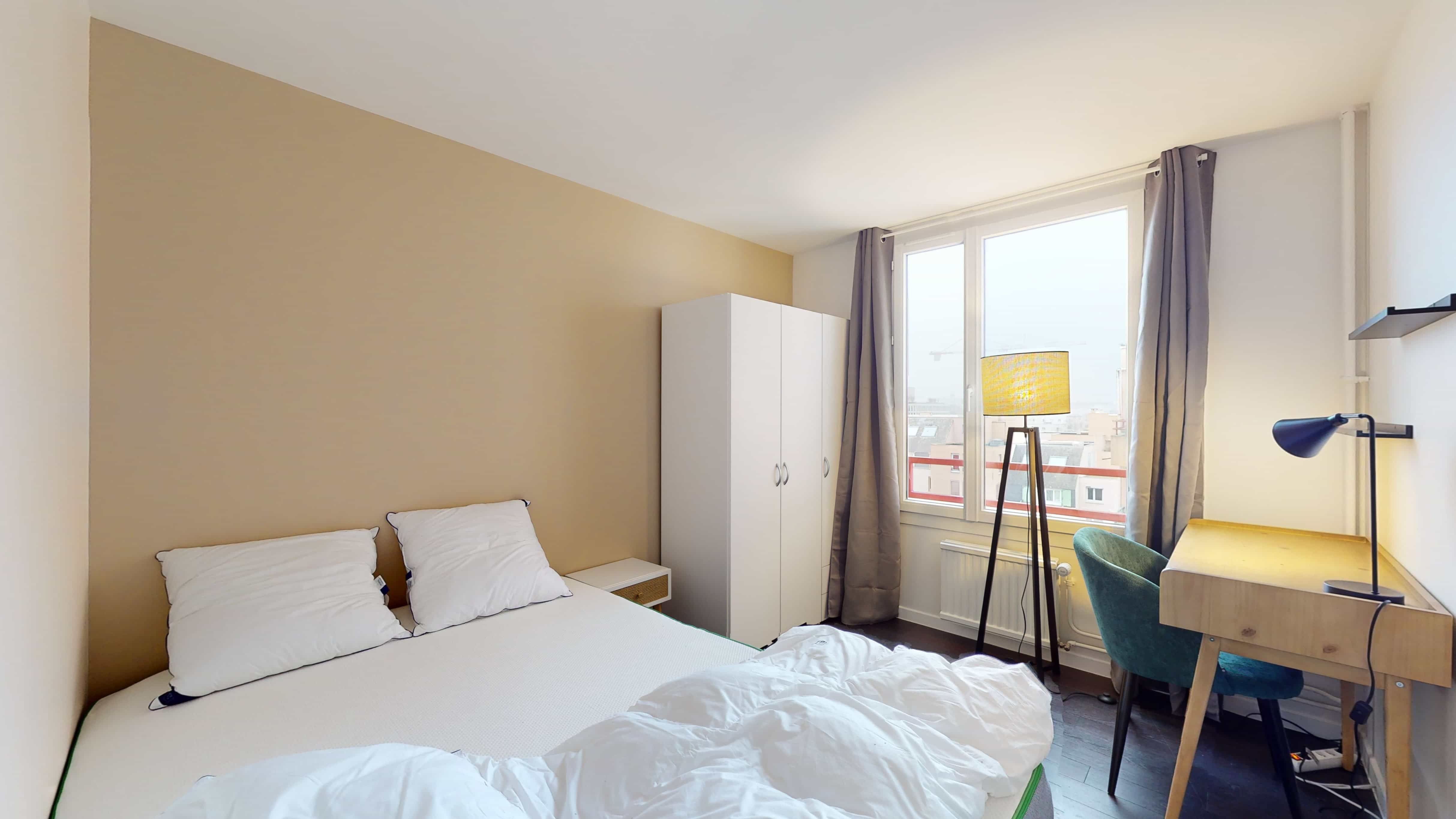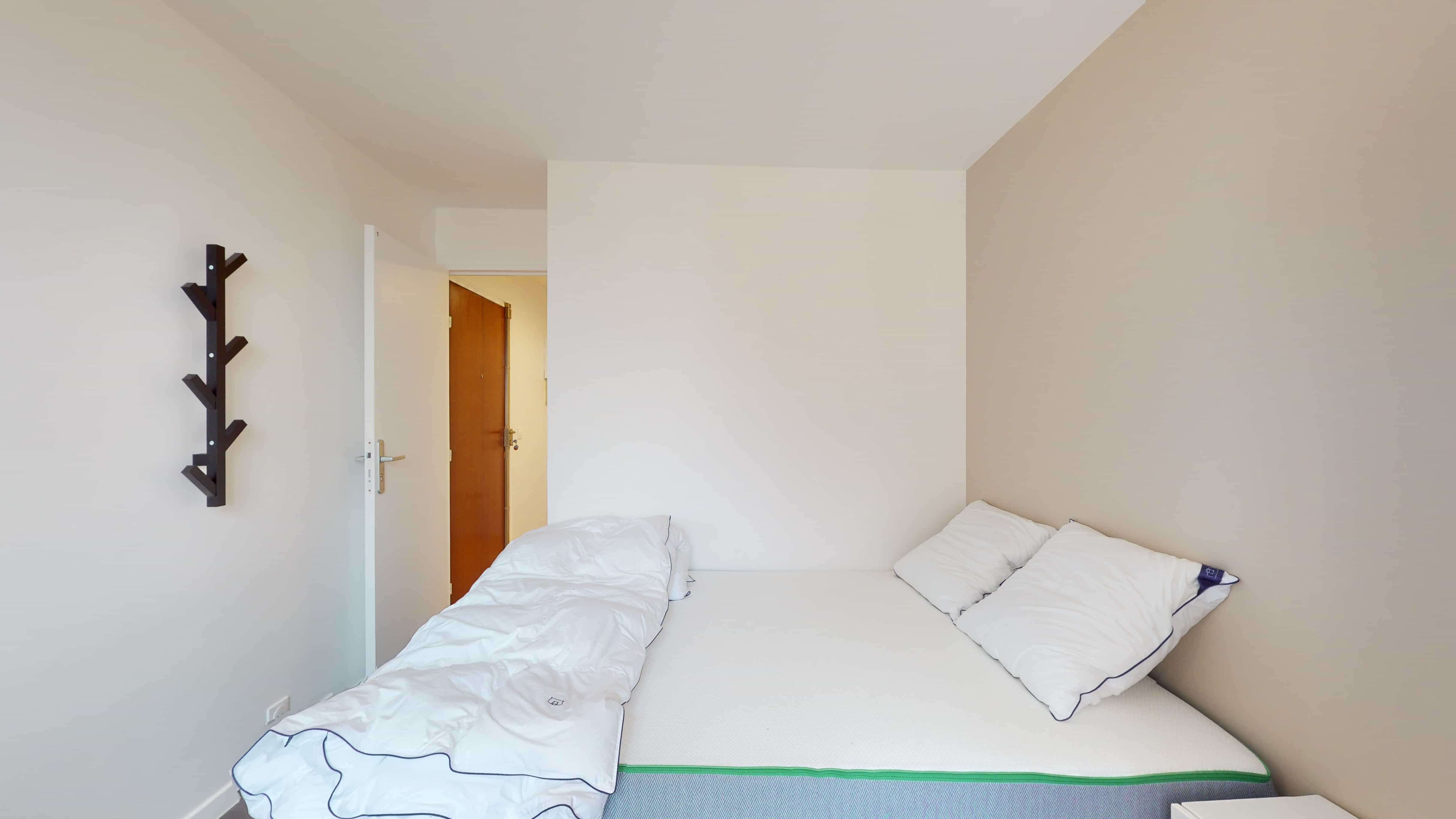 La chambre 1 est parfaite pour une personne. Elle possède tout ce dont vous avez besoin : un confortable lit double, une armoire pour ranger vos affaires, ainsi qu'un bureau et une chaise pour étudier ou travailler tranquillement. La salle de bain est équipée d'une douche et se partage avec les autres locataires.