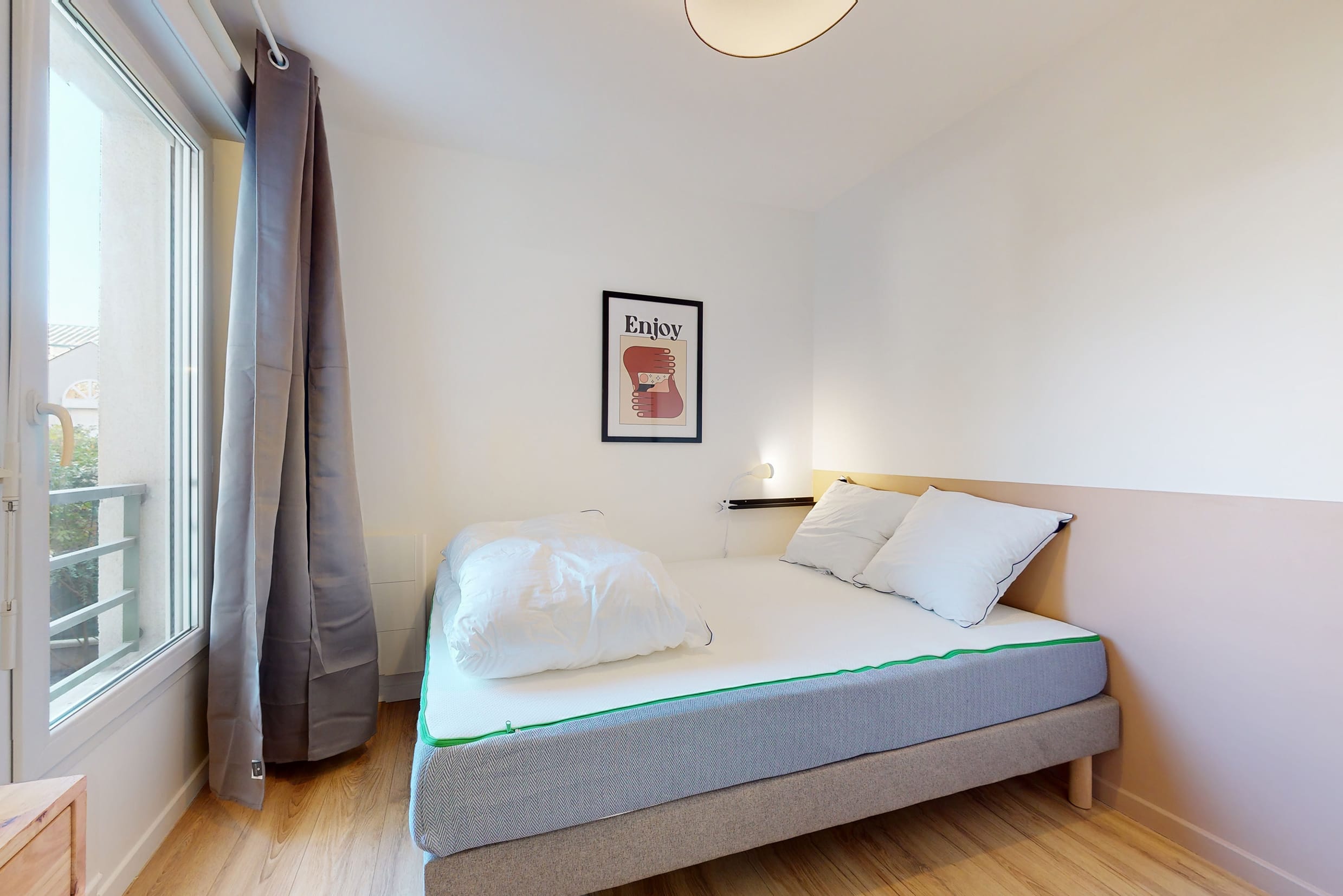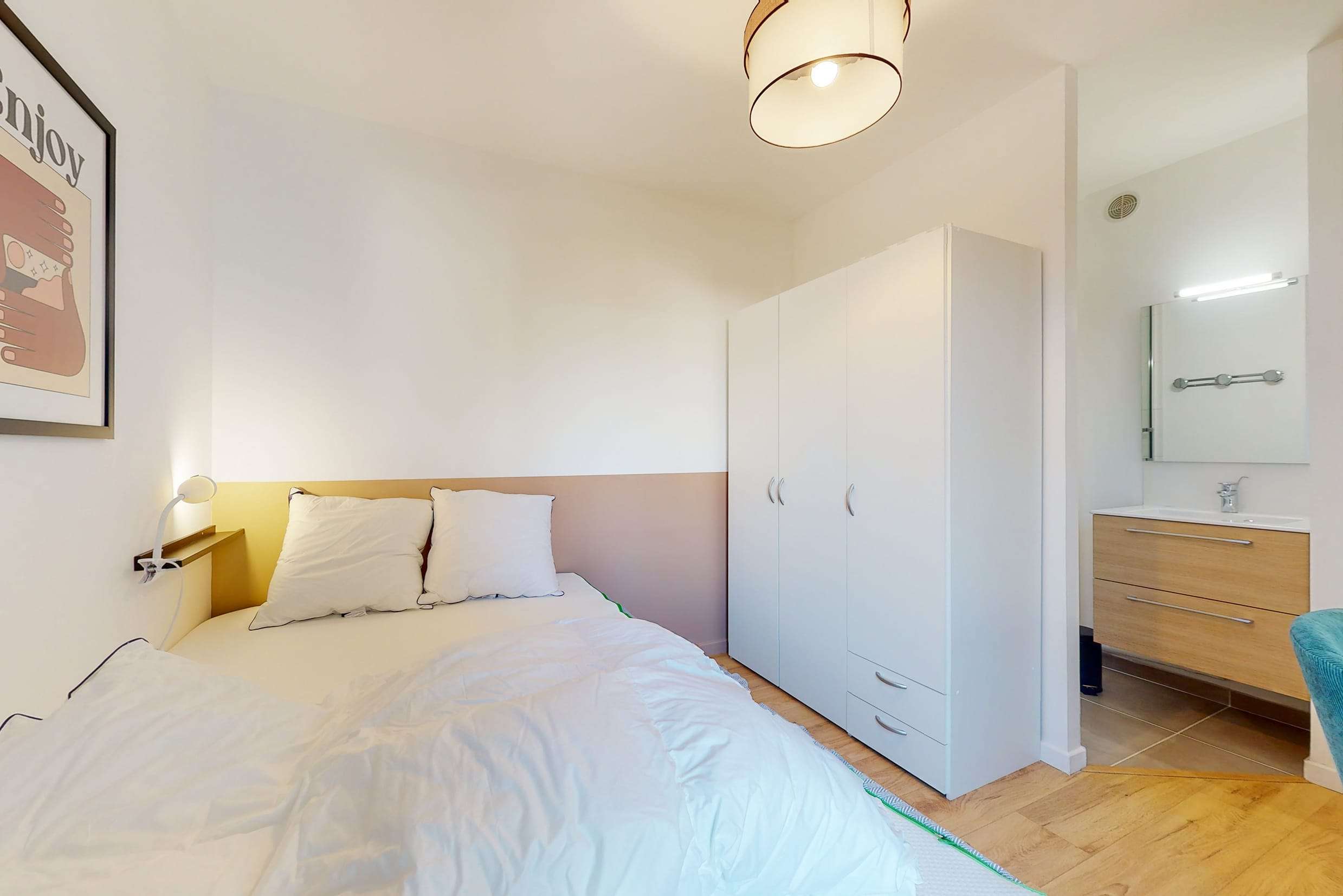 Room 1 est votre espace personnel. Cette chambre de 10 m², conçue pour une personne, offre un lit double confortable avec de la literie de qualité, une armoire pour vos affaires, une chaise, et un bureau pour travailler ou étudier. Vous bénéficiez en plus d'une salle de bain privative comprenant une douche, un lavabo et des toilettes.