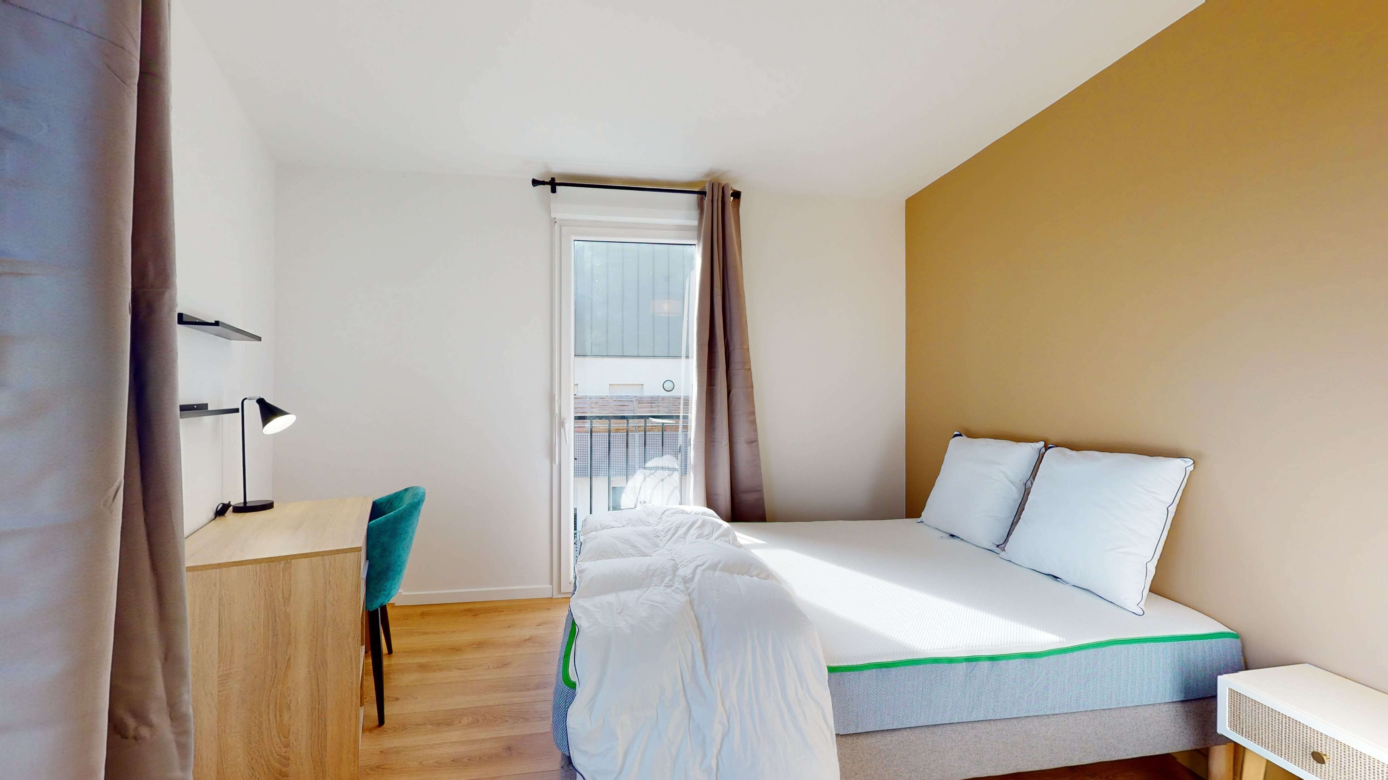 La chambre Room 2, conçue pour une personne, est un véritable cocon. Avec un lit double confortable, une armoire pour vos affaires, un bureau pour travailler et une chaise, vous aurez tout l'espace nécessaire pour vous sentir à l'aise. La chambre de 14 m² partage une salle de bain bien entretenue avec douche et toilettes.