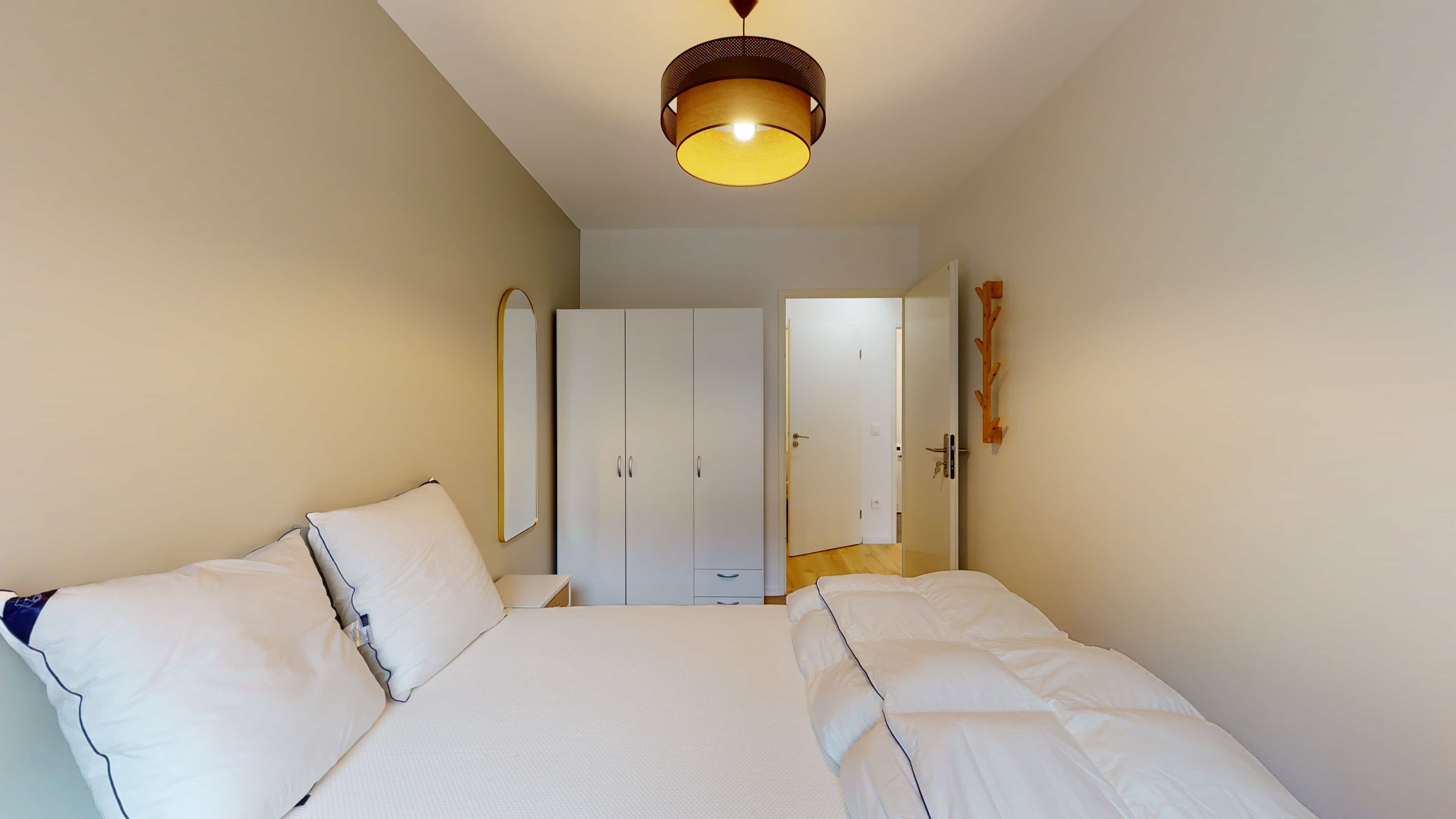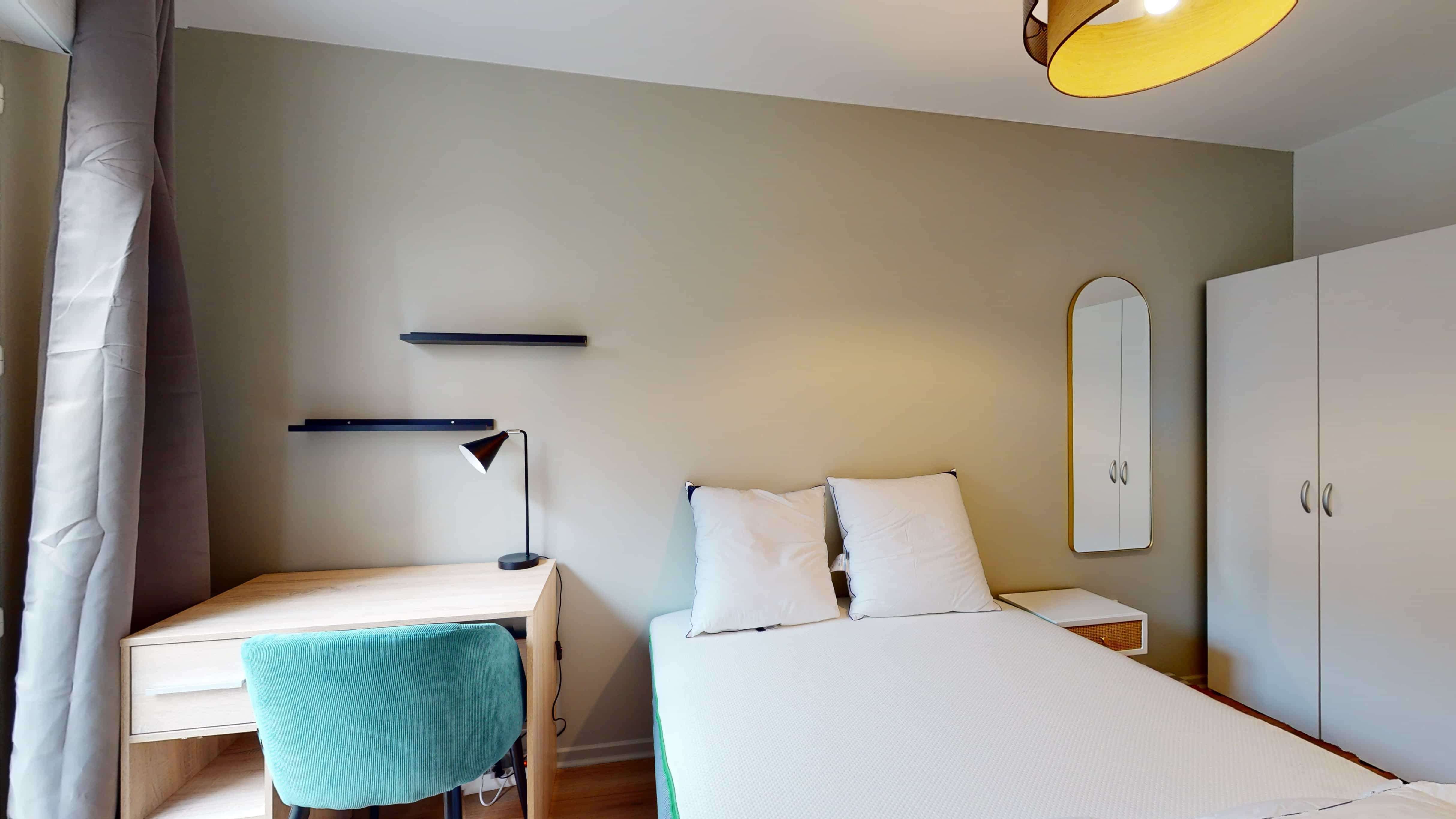 La chambre qui vous attend est Room 2, spécialement conçue pour une personne. Elle est meublée avec goût, incluant un lit double confortable, une armoire pour vos affaires, une chaise et un bureau pour étudier ou travailler. Vous aurez aussi accès à un balcon privé et partagerez une salle de bain moderne (avec douche et toilettes) avec d'autres locataires.