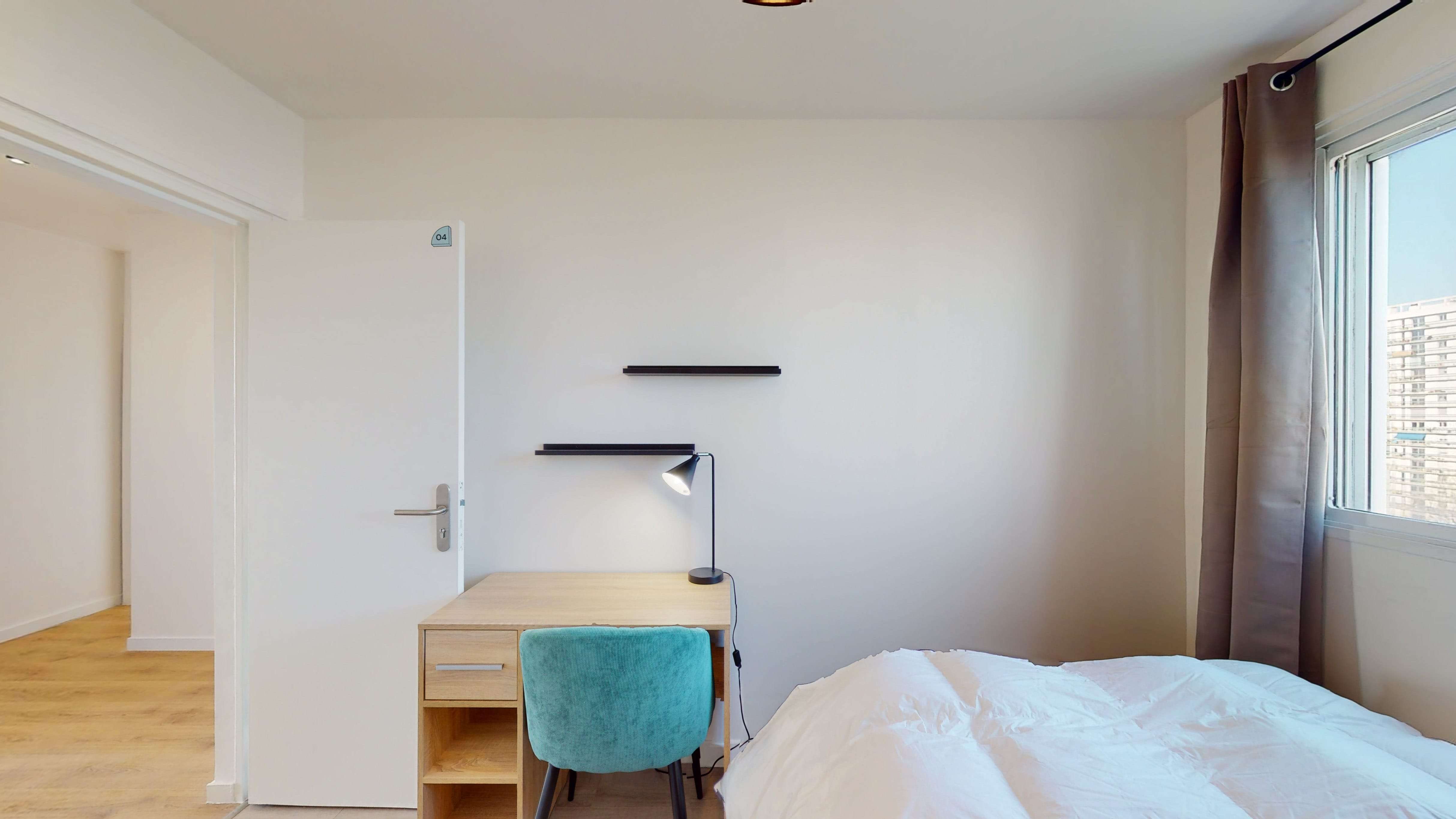 Room 4 est parfaite pour une personne seule ! Elle a un lit double confortable pour se reposer, une armoire pour ranger vos affaires, un bureau et une chaise pour étudier ou travailler. Vous partagerez une salle de bain moderne avec d'autres locataires. La chambre fait 9 m², offrant un espace privé douillet.