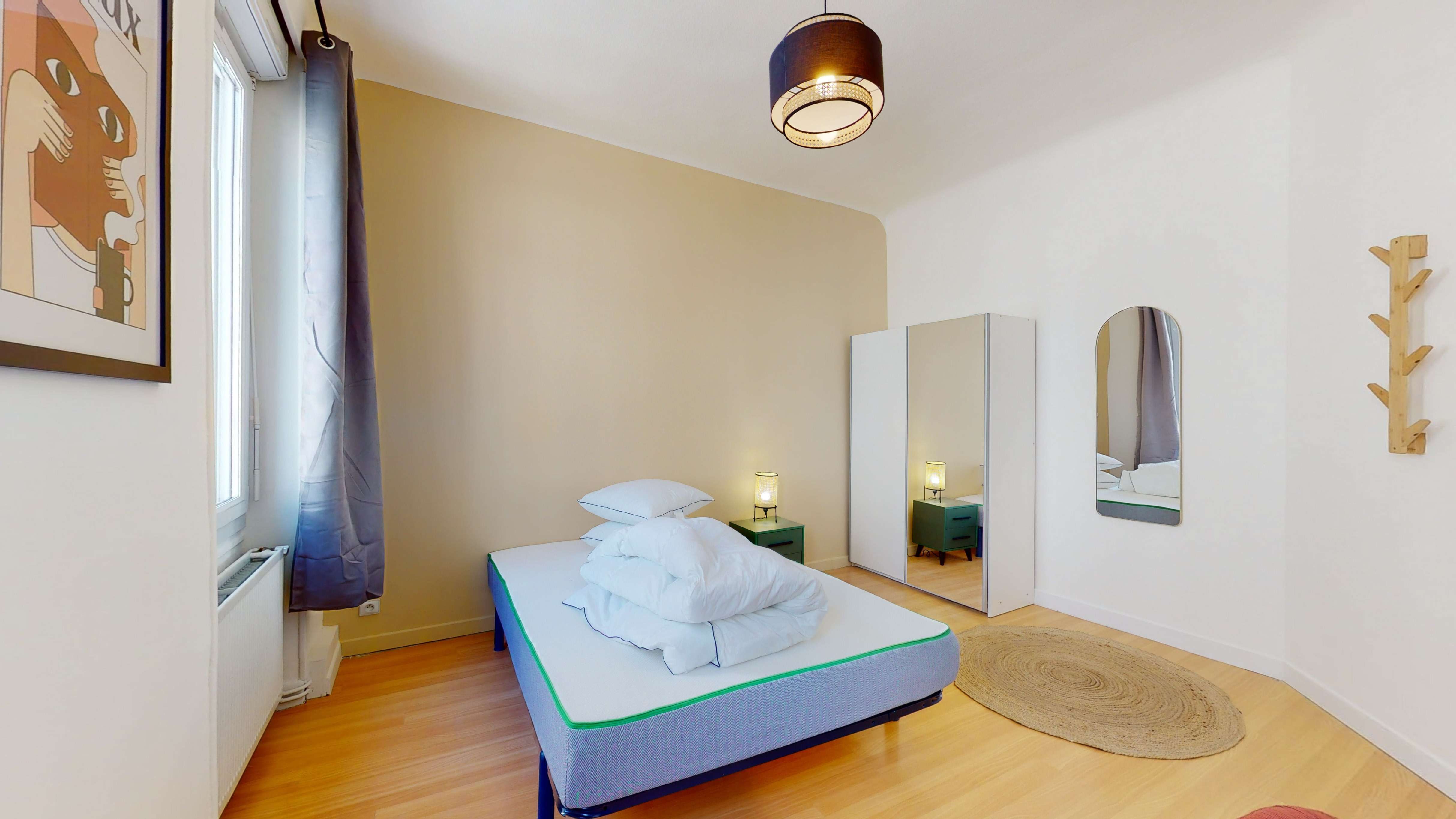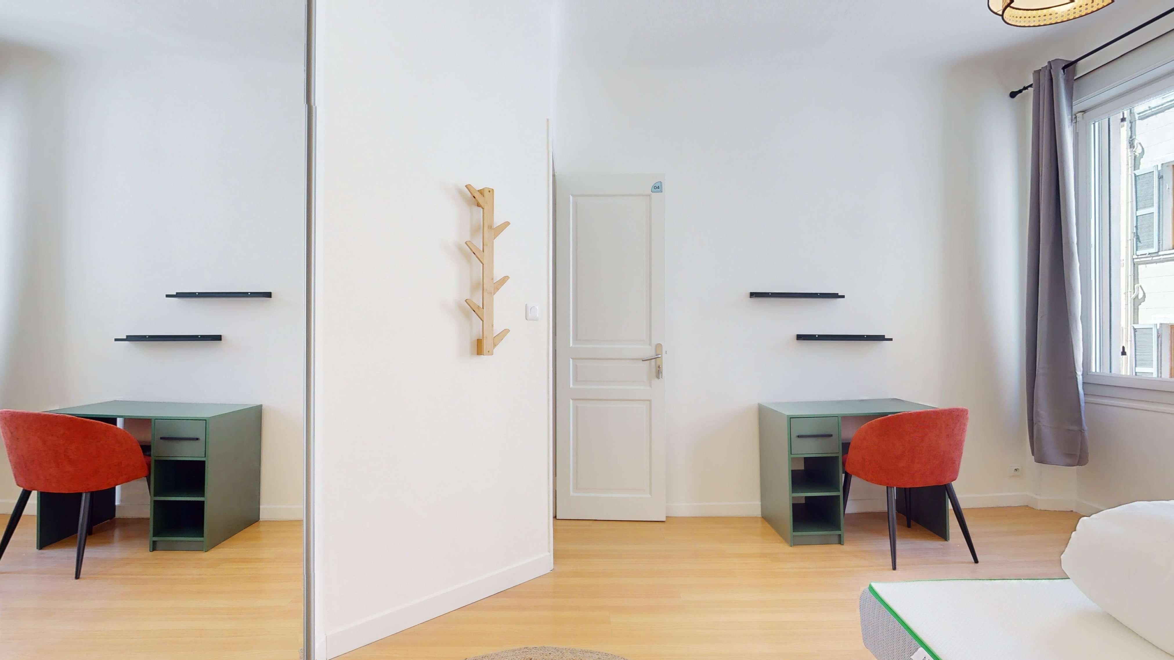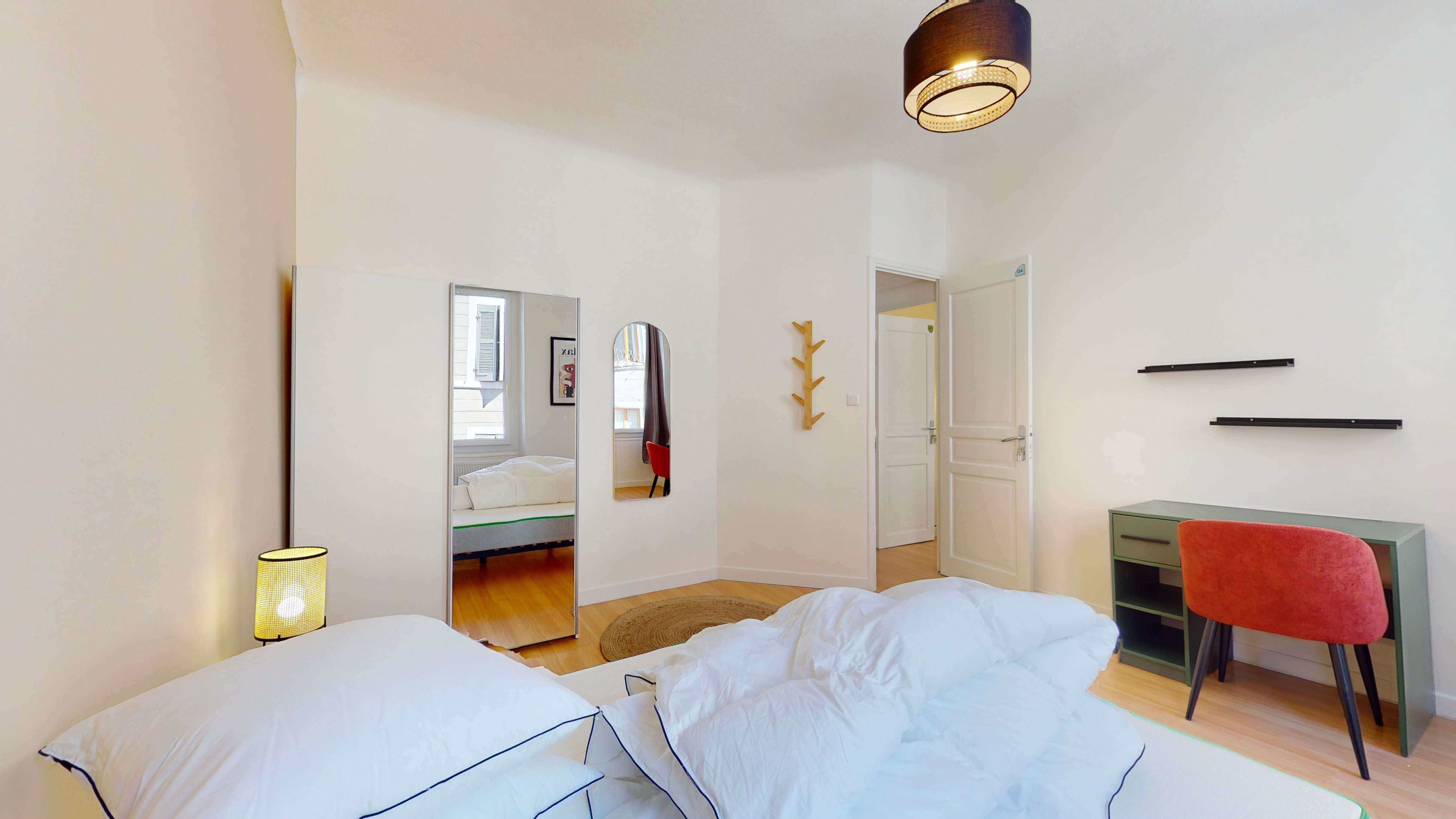 Room 4 est une chambre confortable juste pour vous, avec un lit double douillet et des draps de qualité. Vous avez aussi une armoire pour ranger vos affaires, un bureau et une chaise pour étudier ou travailler tranquillement, et même une salle de bain partagée bien propre et moderne.
