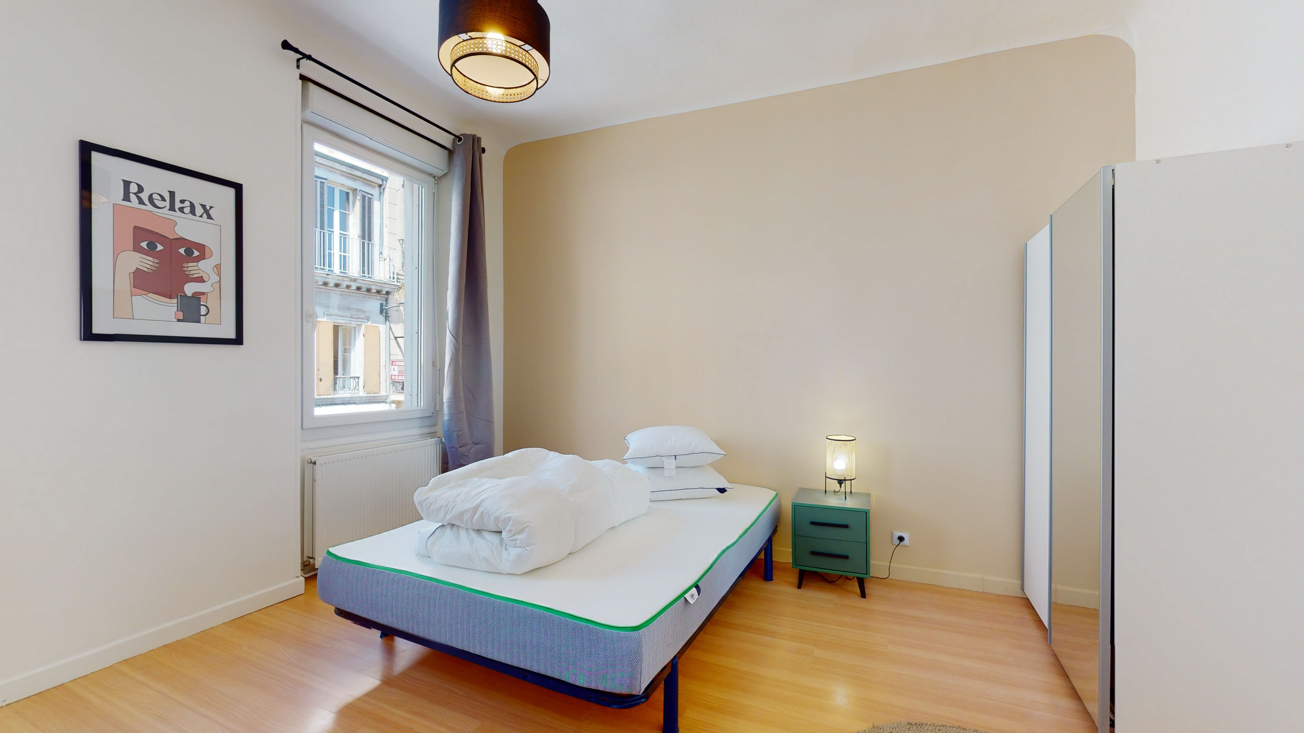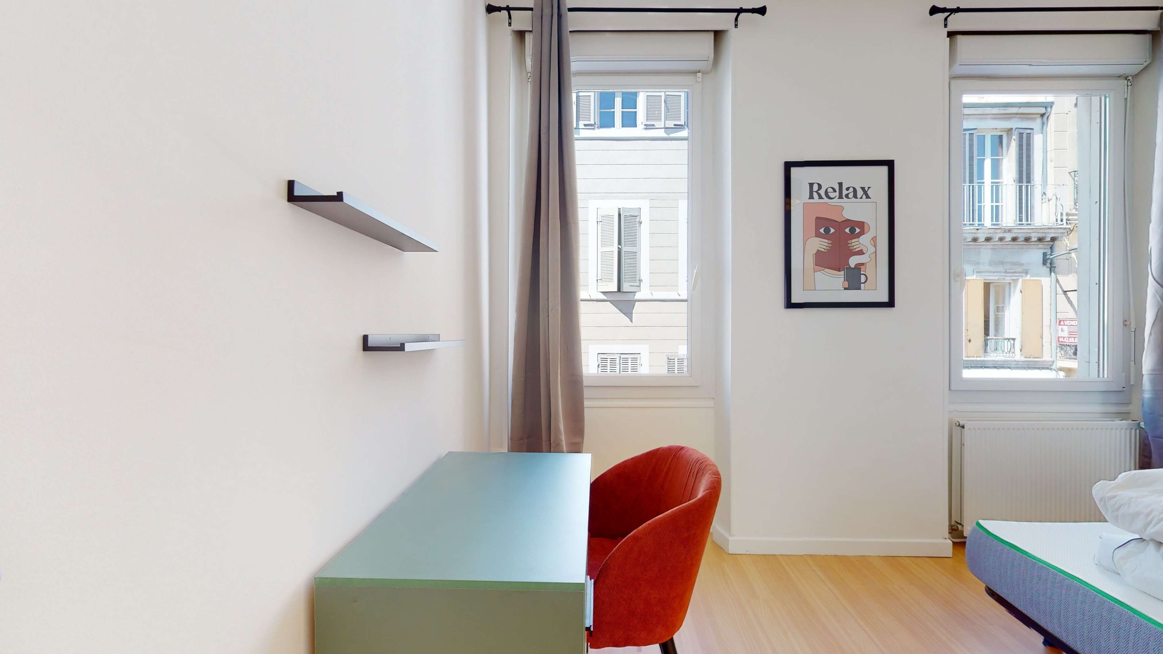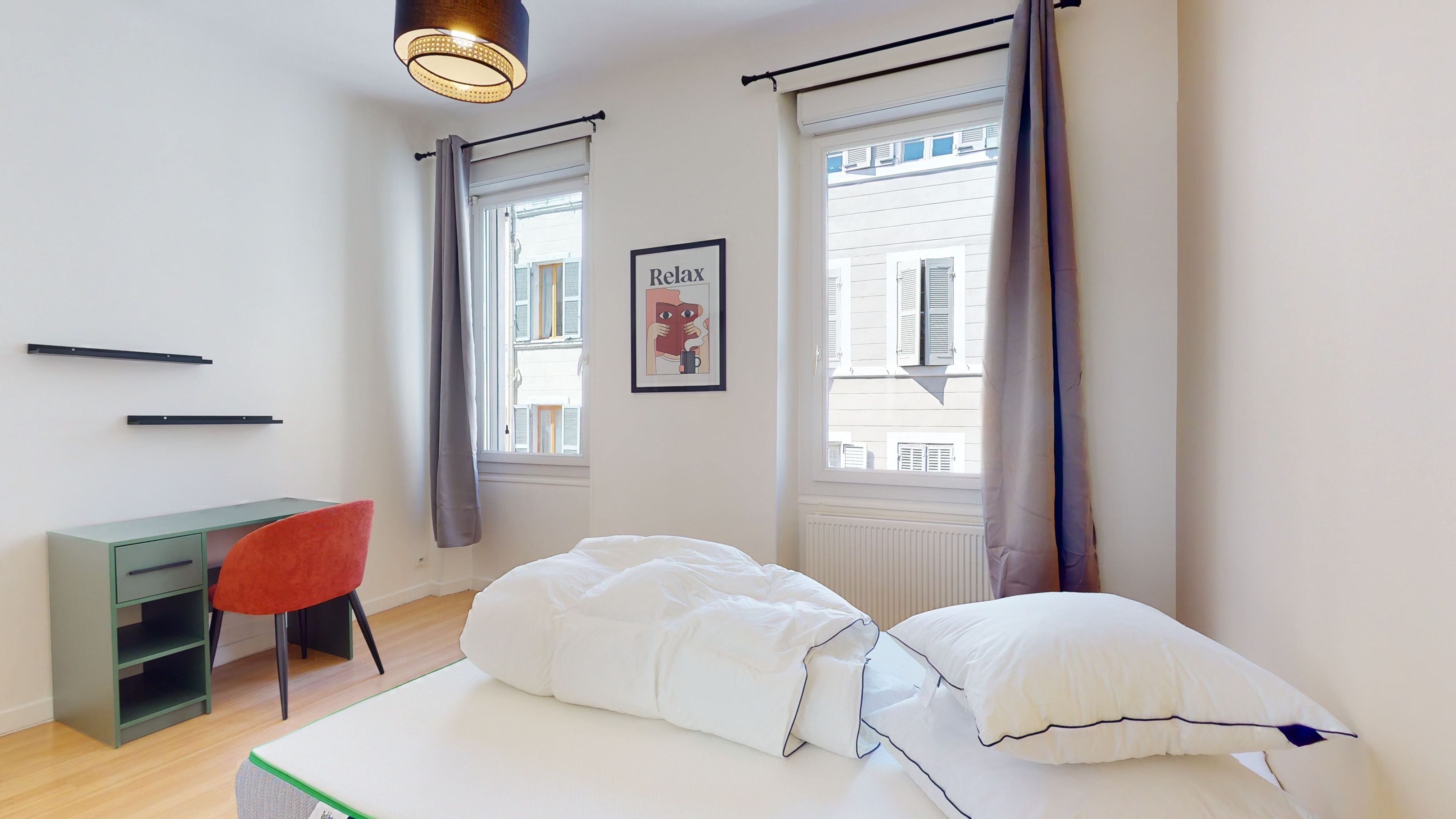 Room 4 est une chambre confortable juste pour vous, avec un lit double douillet et des draps de qualité. Vous avez aussi une armoire pour ranger vos affaires, un bureau et une chaise pour étudier ou travailler tranquillement, et même une salle de bain partagée bien propre et moderne.